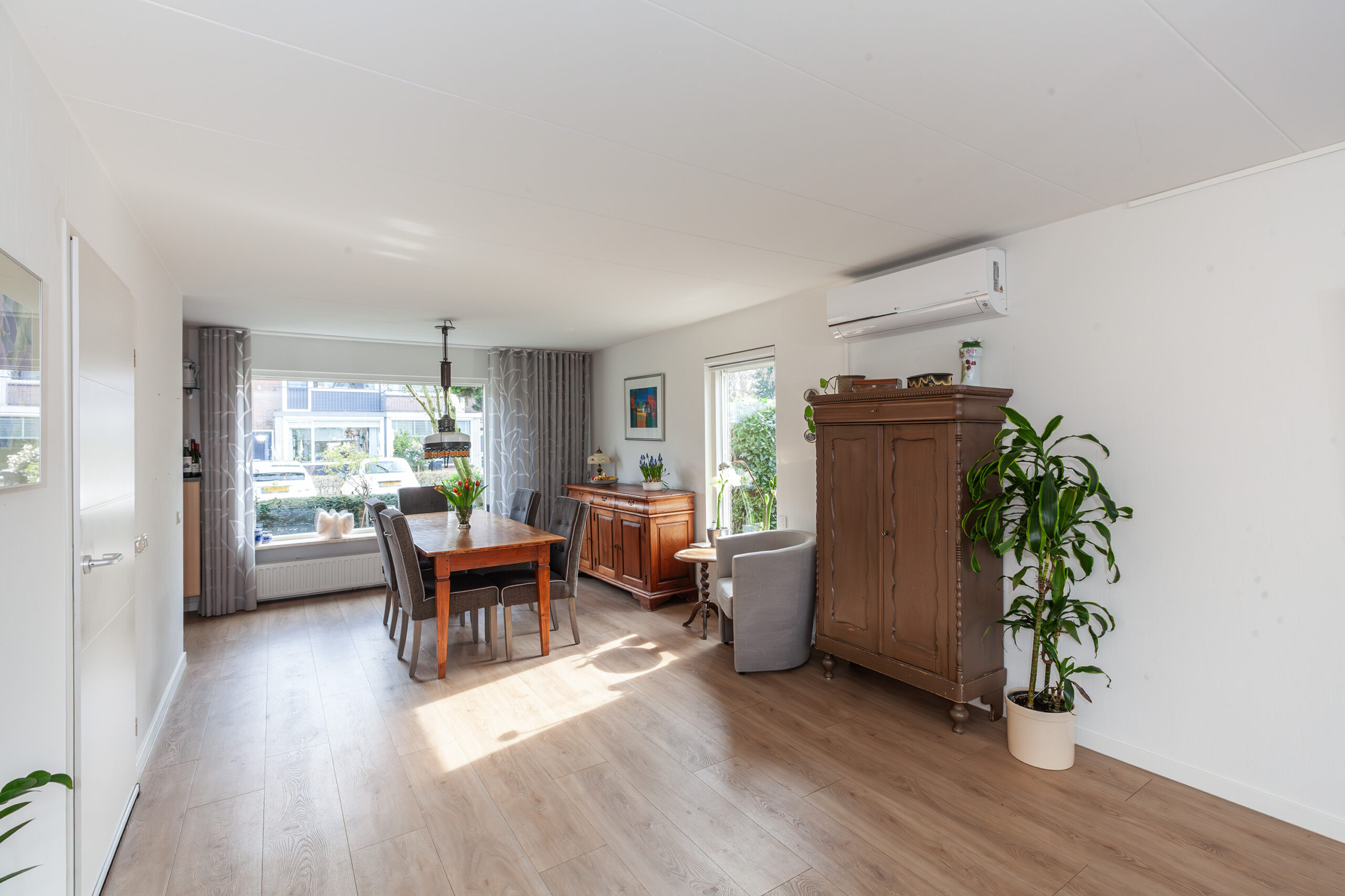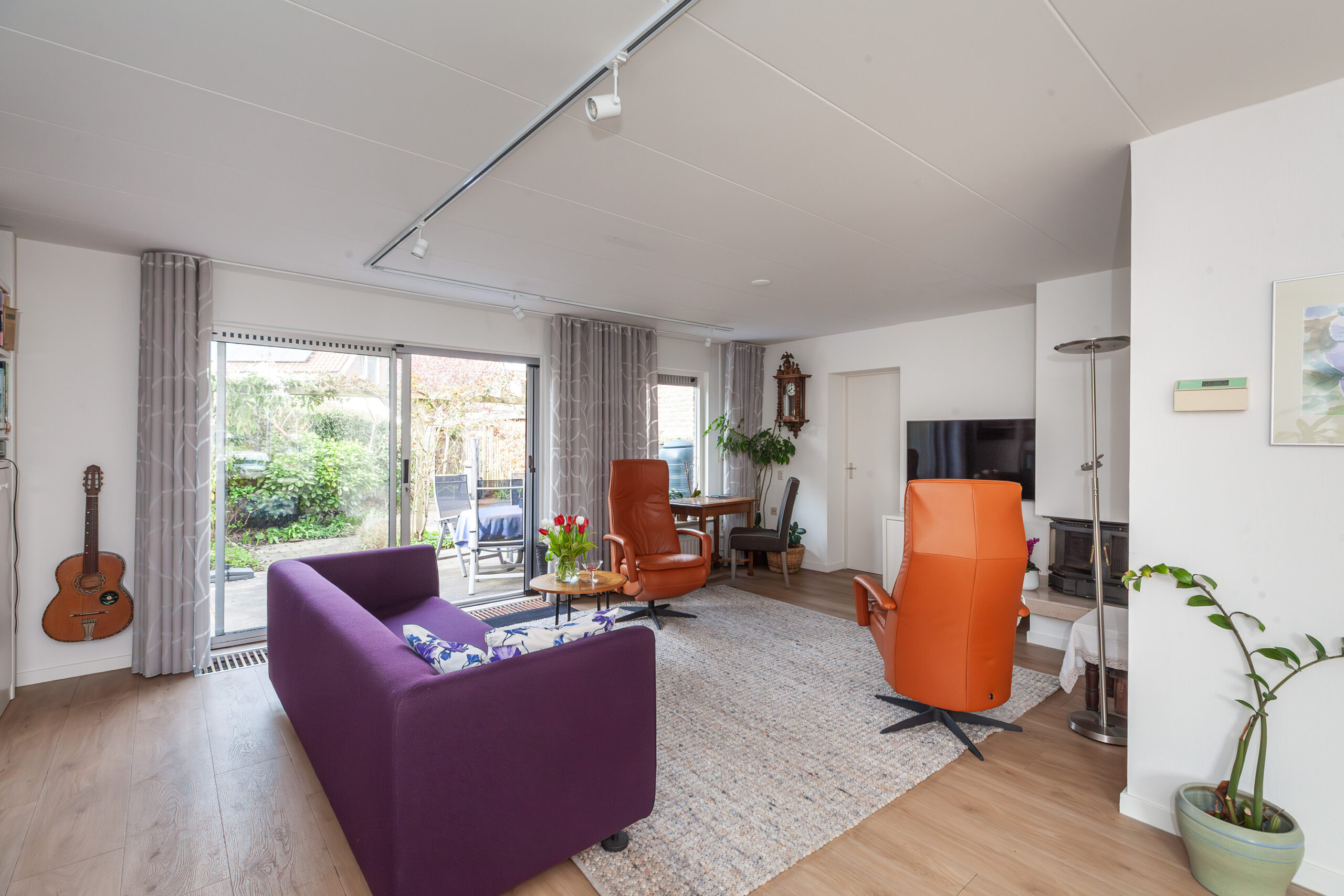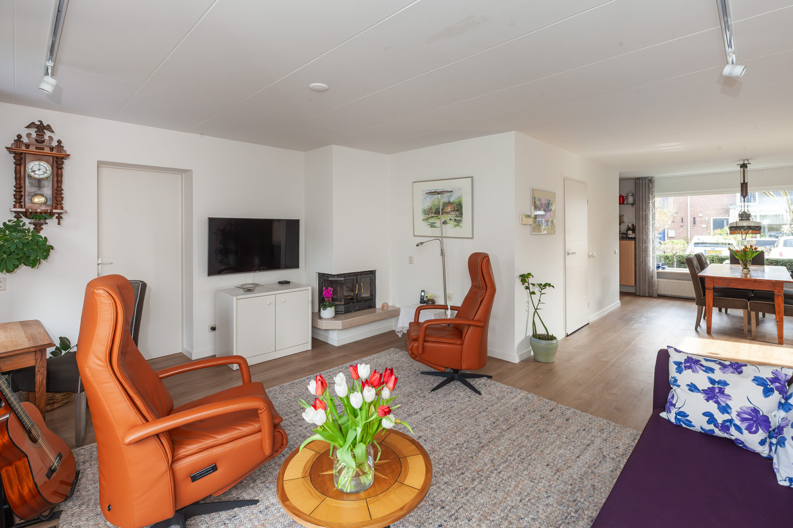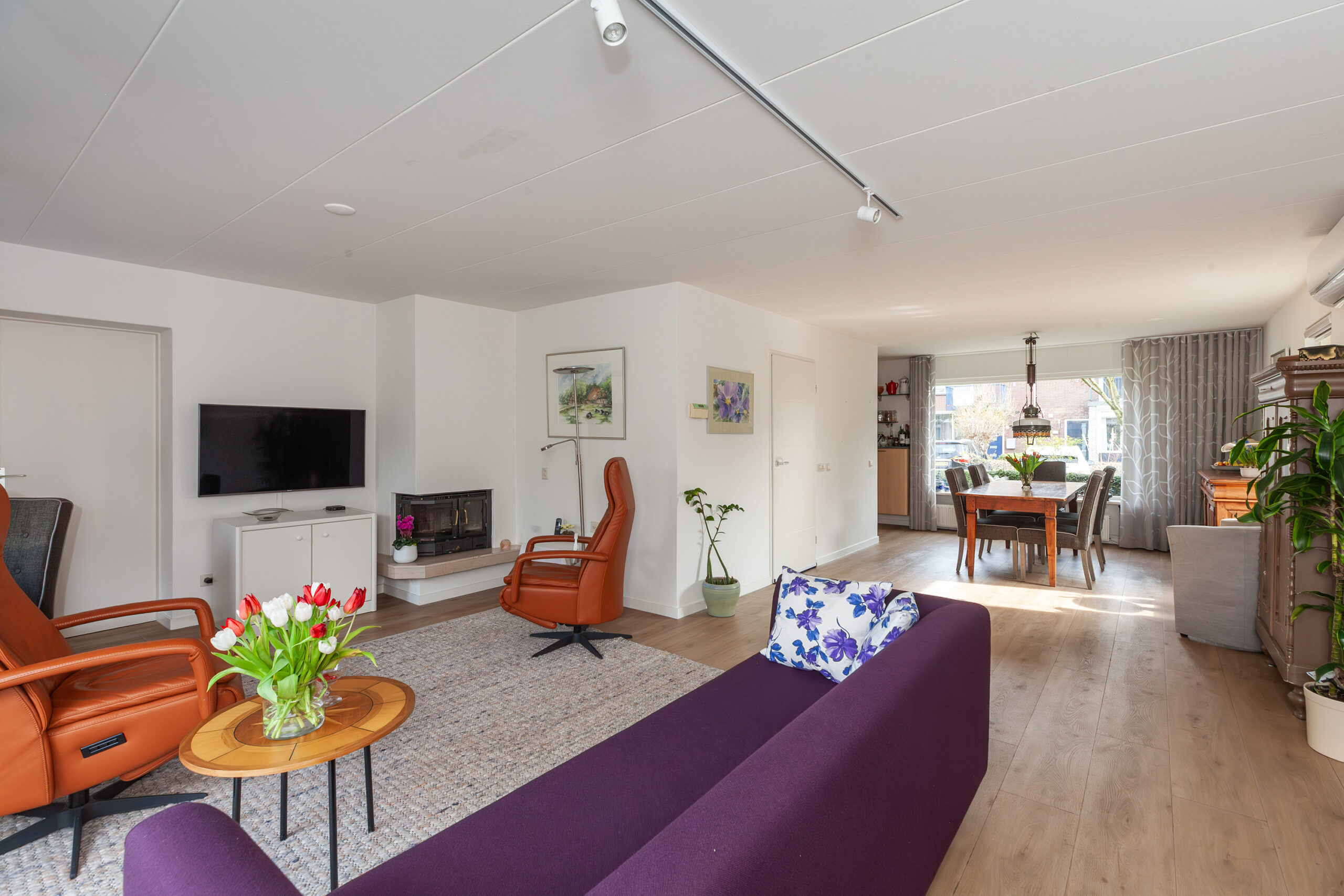 Vanuit de hal stapt u in de woonkamer en meteen valt u op hoe licht het binnenshuis is. Mede door de grote raampartijen en extra raam in de zijgevel geniet u daardoor volop. Aan de voorzijde is de eethoek welke overvloeit in de keuken en aan de achterzijde is de zithoek gegroepeerd rondom de open haard. Via de schuifpui komt u direct in de achtertuin. Verder is er toegang tot de naastgelegen werkkamer en heeft u een airco.
