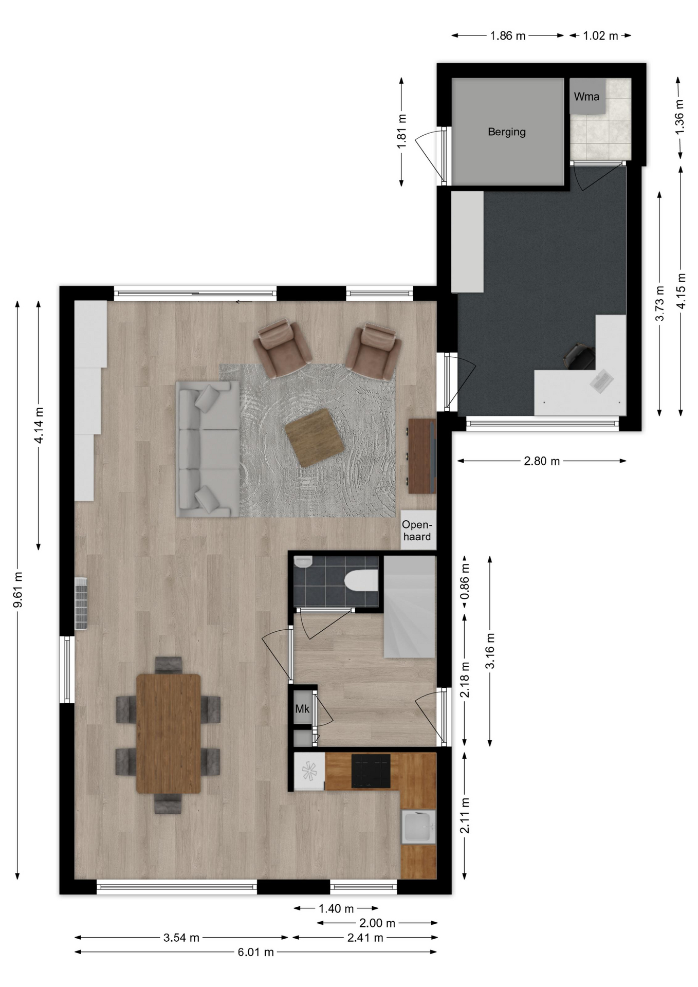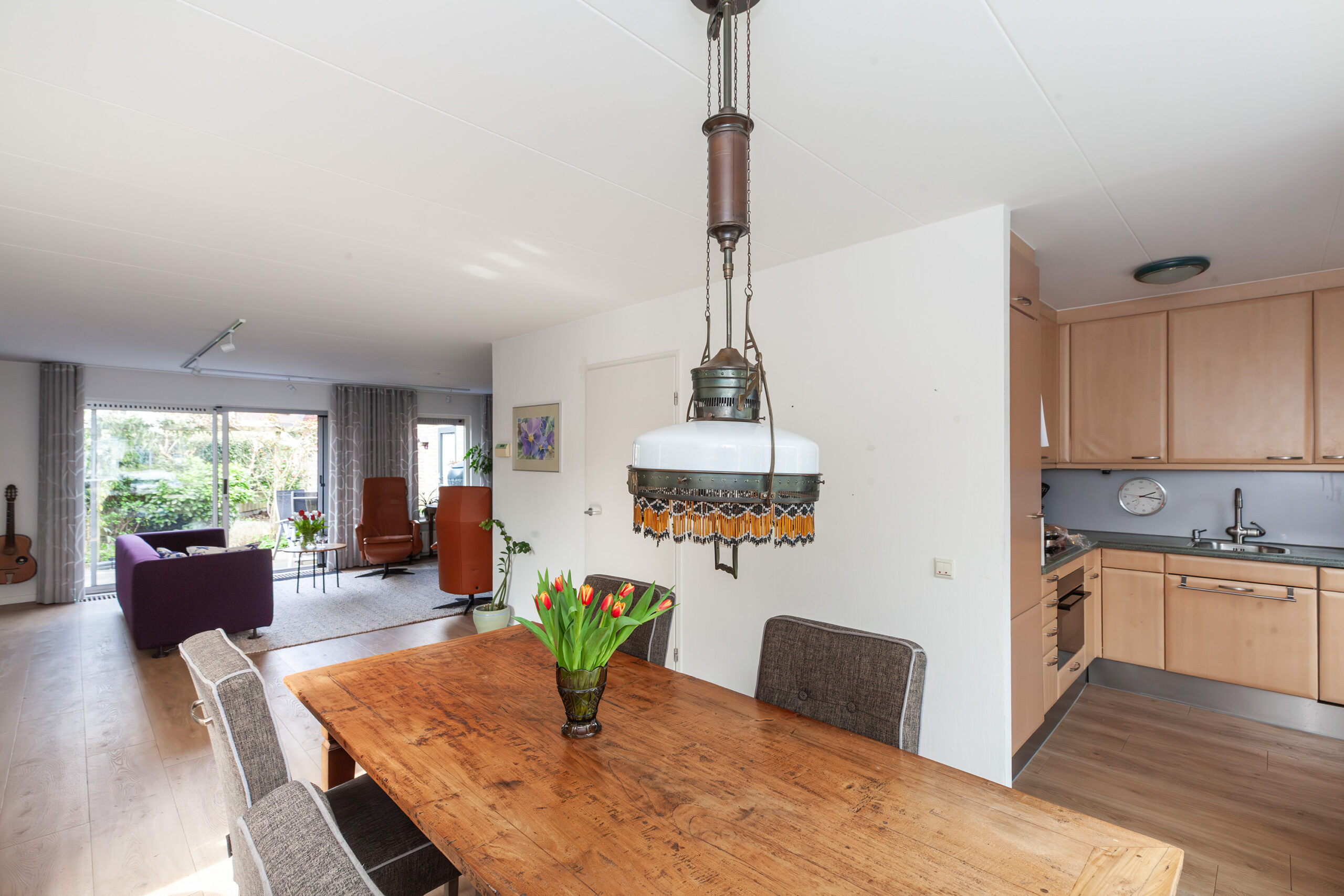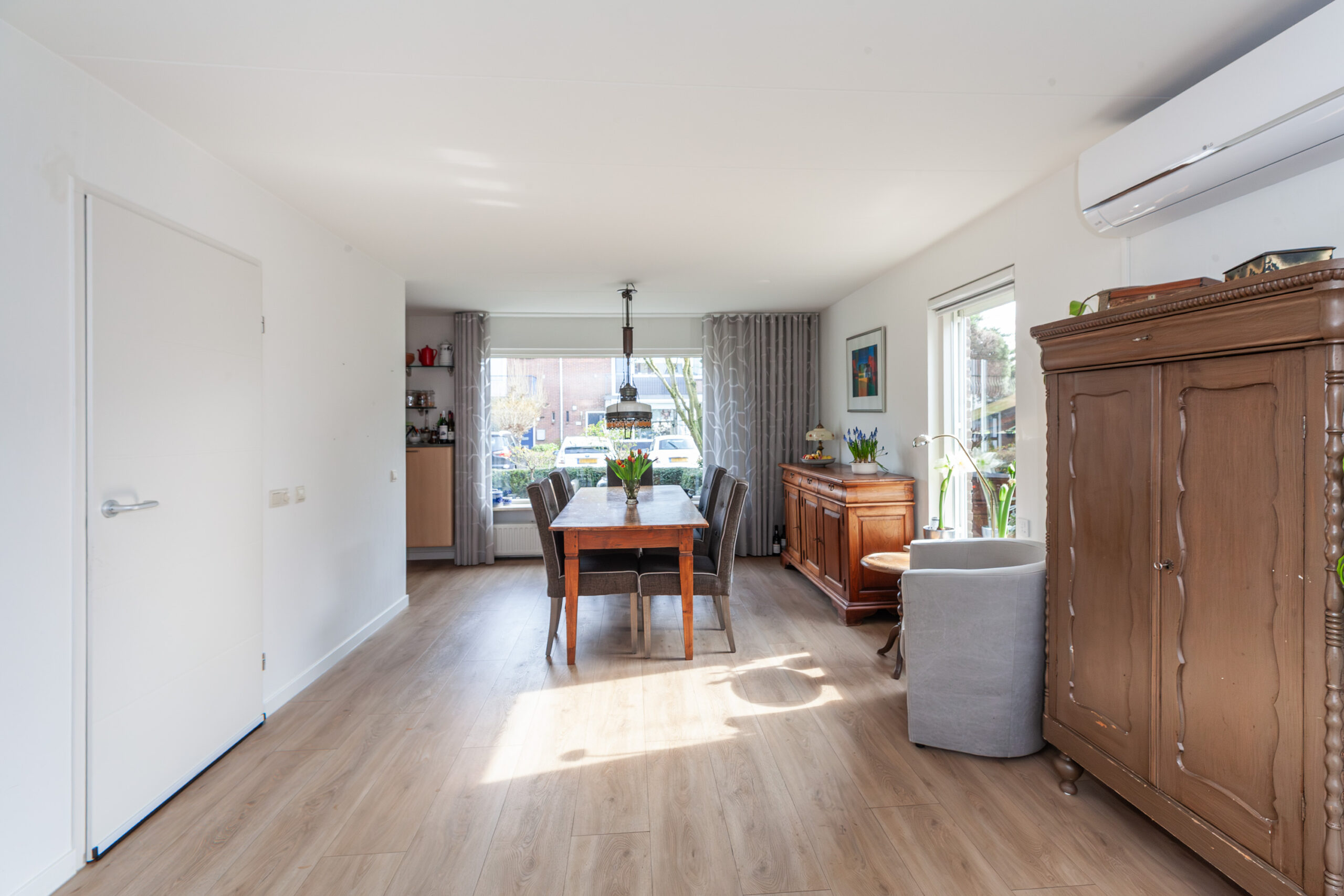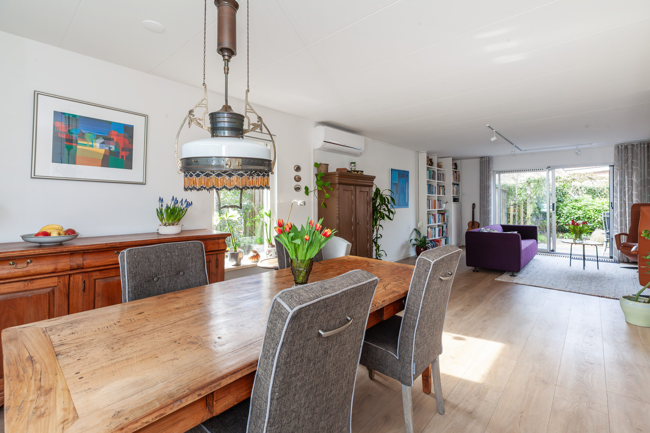 Vanuit de hal stapt u in de woonkamer en meteen valt u op hoe licht het binnenshuis is. Mede door de grote raampartijen en extra raam in de zijgevel geniet u daardoor volop. Aan de voorzijde is de eethoek welke overvloeit in de keuken en aan de achterzijde is de zithoek gegroepeerd rondom de open haard. Via de schuifpui komt u direct in de achtertuin. Verder is er toegang tot de naastgelegen werkkamer en heeft u een airco.