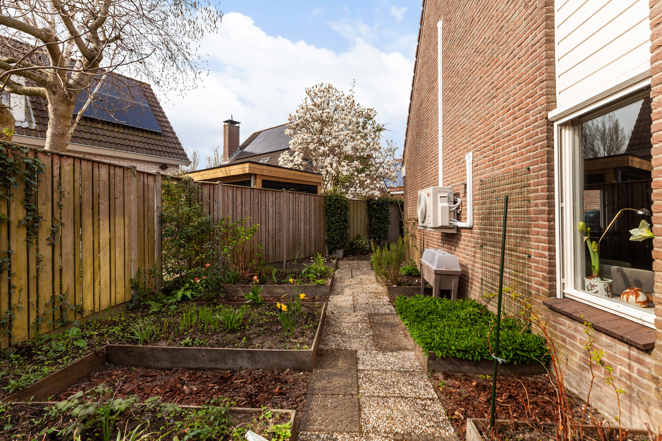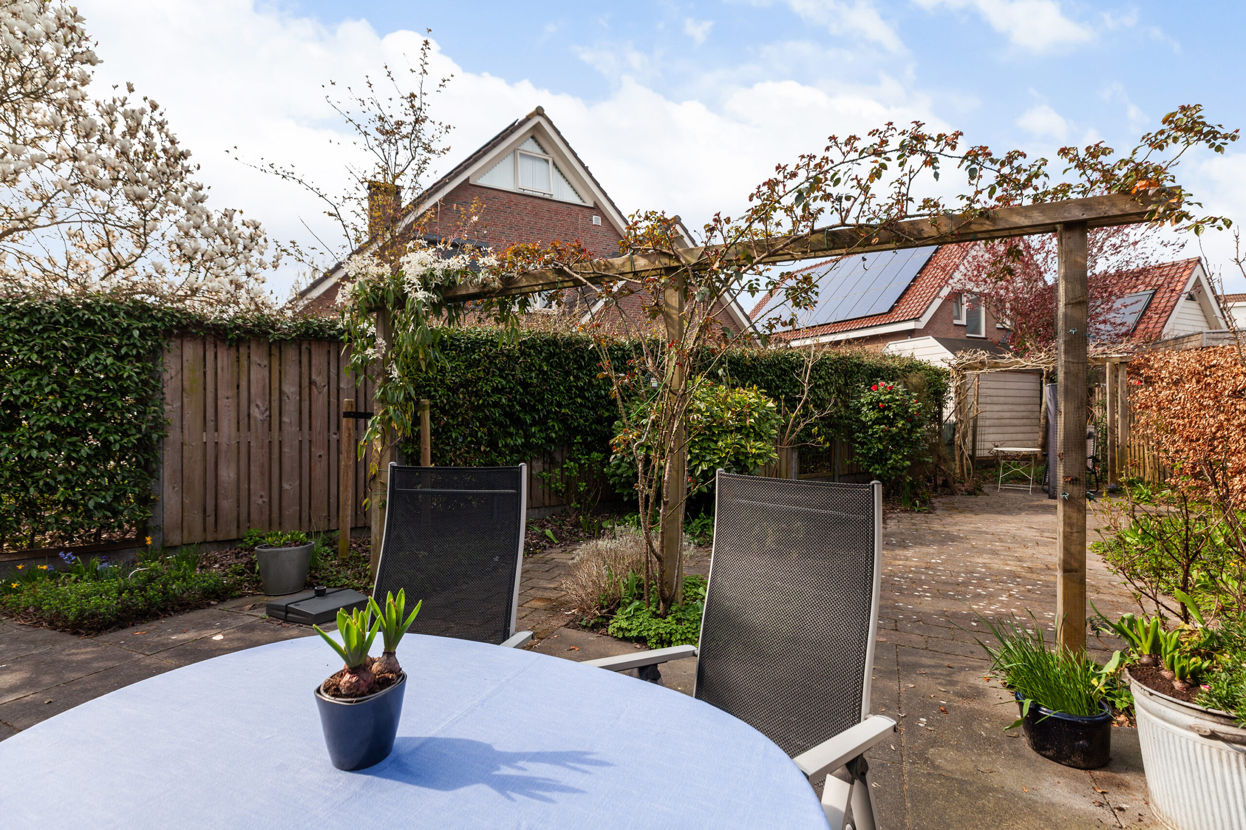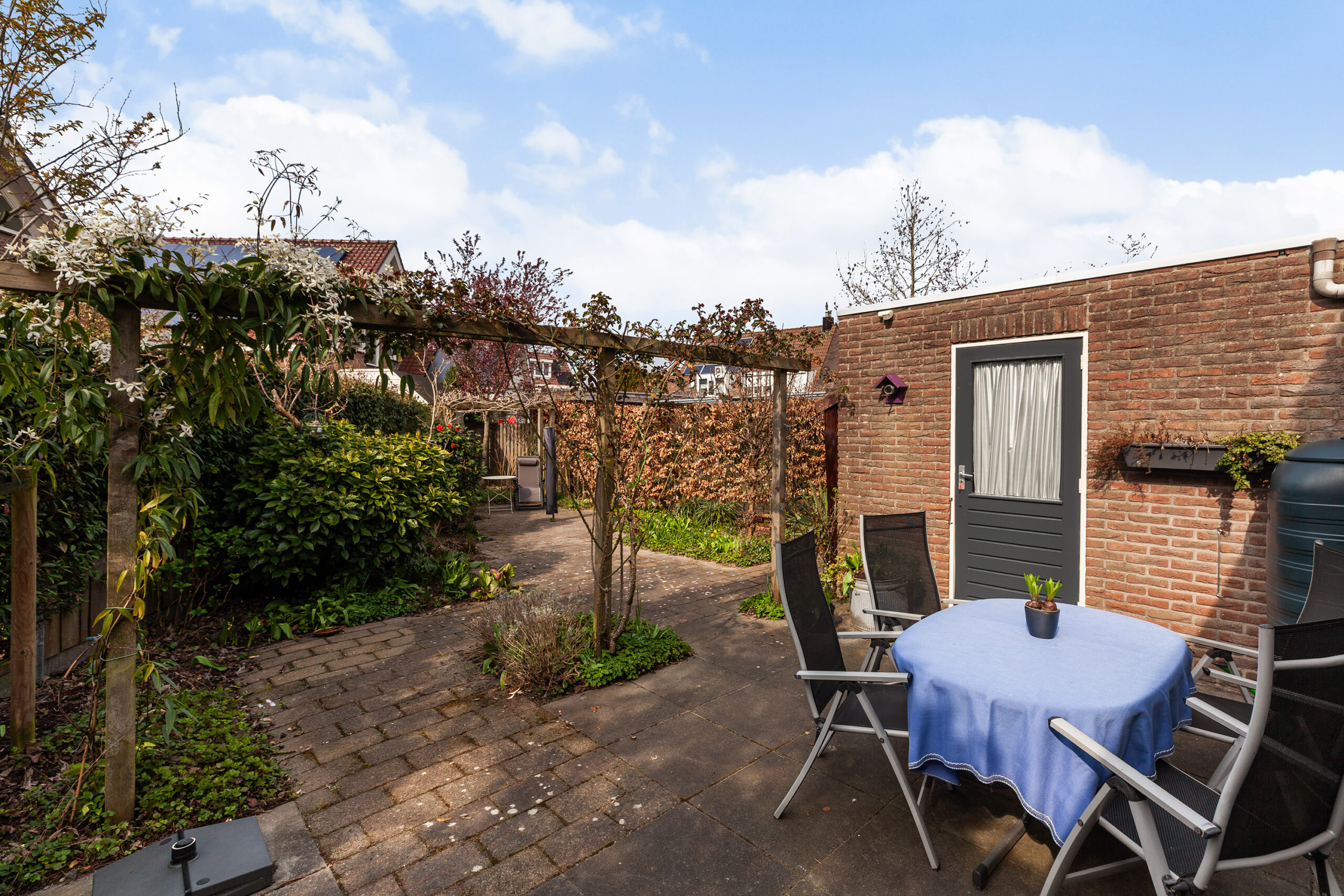 De woning staat op een perceel van 292 m² met een speels ingedeelde achtertuin. Deze heeft een mix van bestrating, diverse bloemen, planten en struiken. Rondom de pergola groeit de heerlijk geurende clematis en de uitbundig bloeiende rozen. Naast het terras heeft de berging van circa 1.86 x 1.81m. Aan de zijzijde loopt u de tuin door naar voorzijde en ook hier treft u diverse beplantingen en een overdekte fietsenstalling. Het is een tuin waar het absoluut goed vertoeven is!
