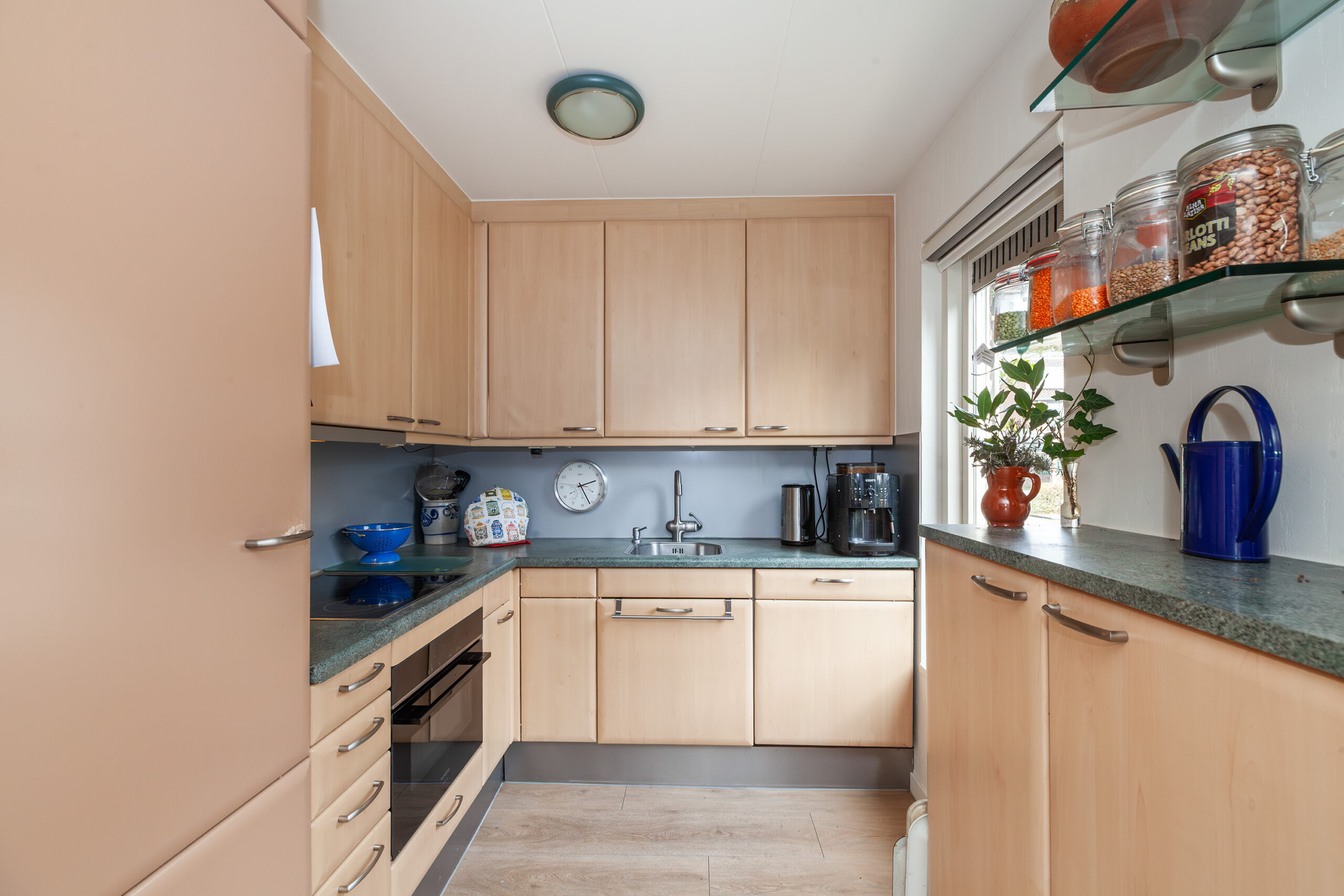 De keuken treft u aan de voorzijde en betreft een hoekopstelling. Aan inbouwapparatuur heeft u de beschikking over een kookplaat, afzuigkap, vaatwasser, combi-oven en koel-/vriescombinatie.
