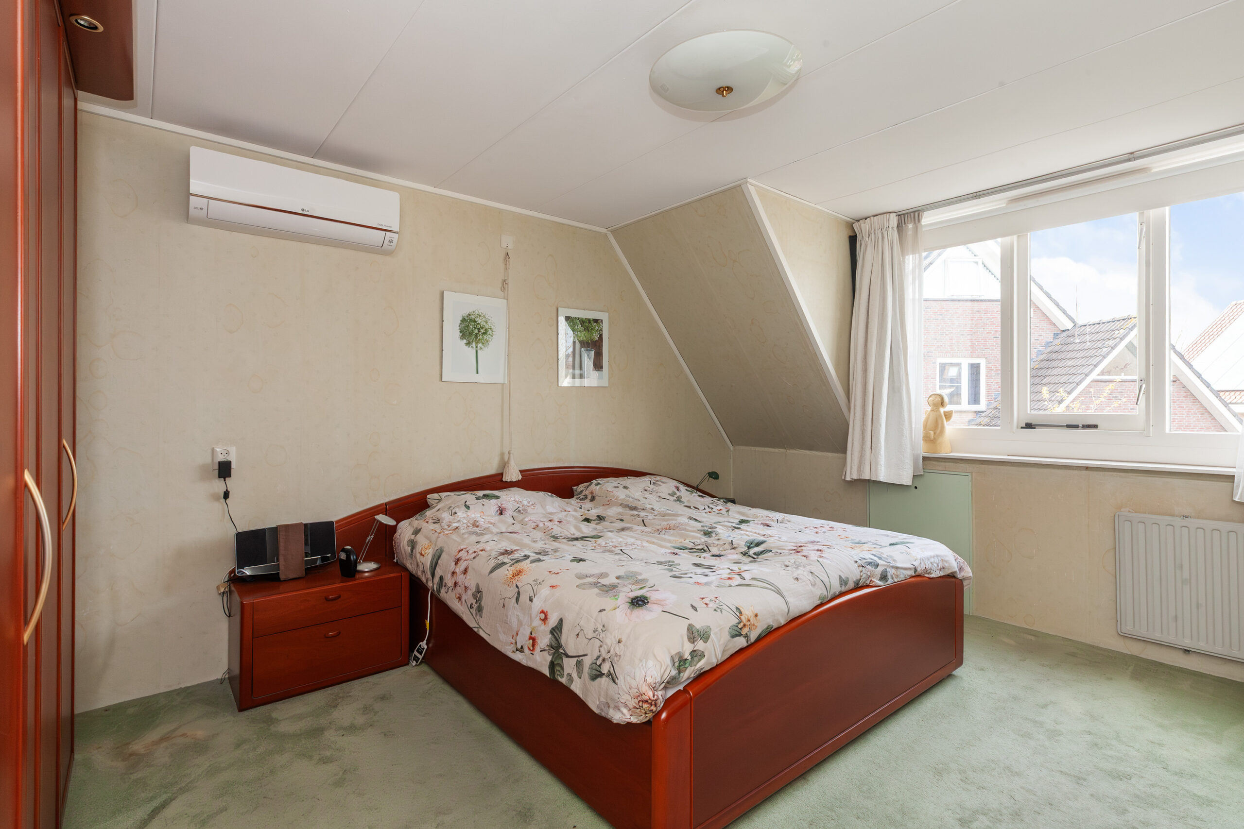 Ruime (ouder) slaapkamer gesitueerd aan de achterzijde van de woning. De kamer is voorzien van een airco en dakkapel met bergruimte onder het schuine dak.