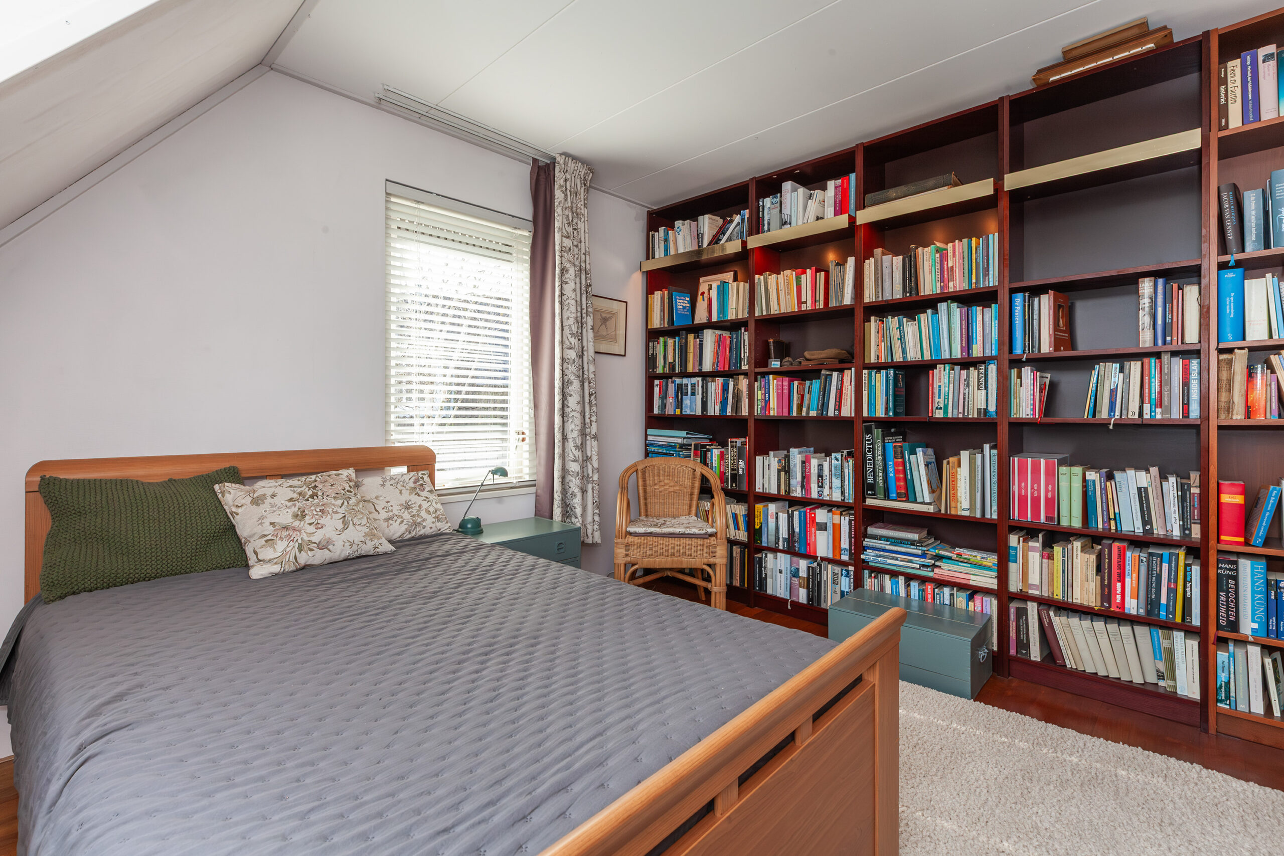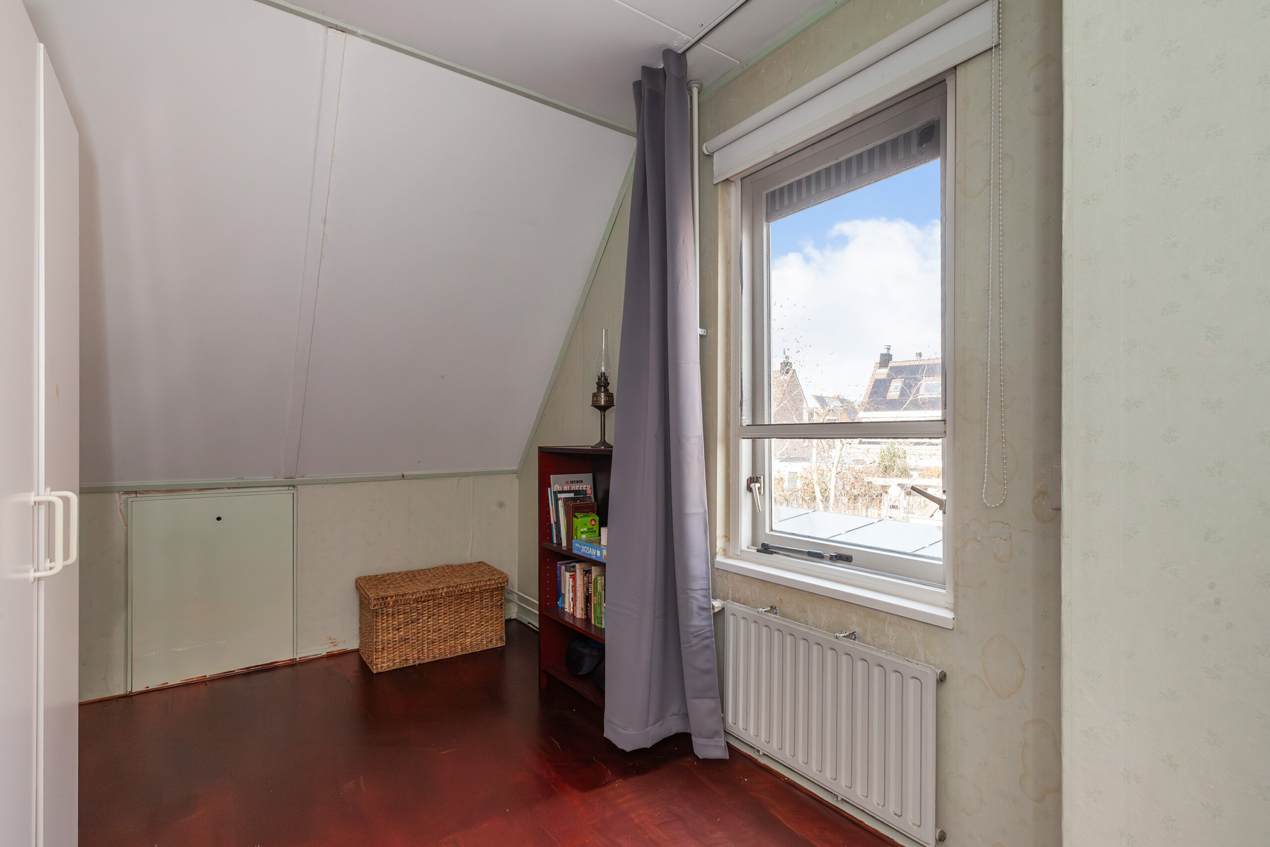 Deze tweede slaapkamer treft u naast slaapkamer I en is ook voorzien van bergruimte onder het schuine dak.