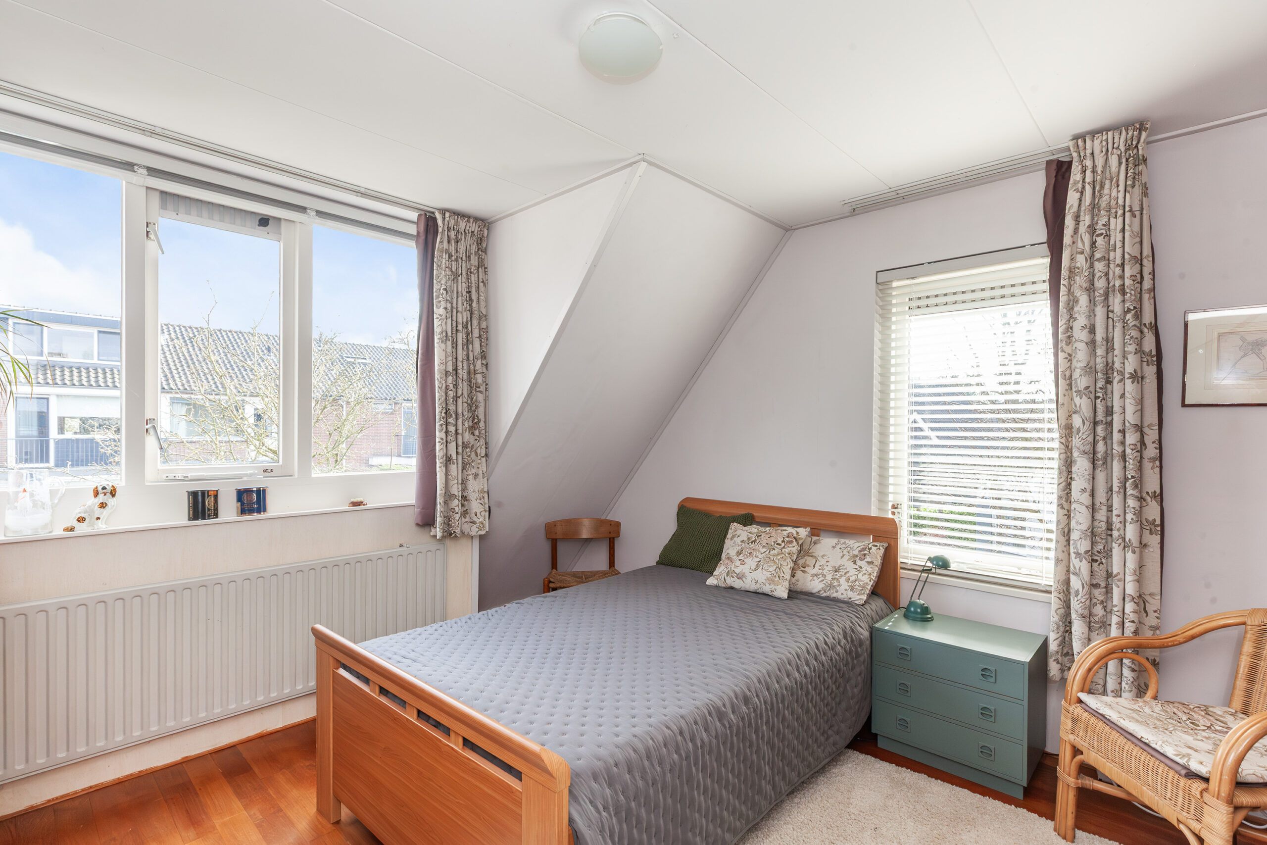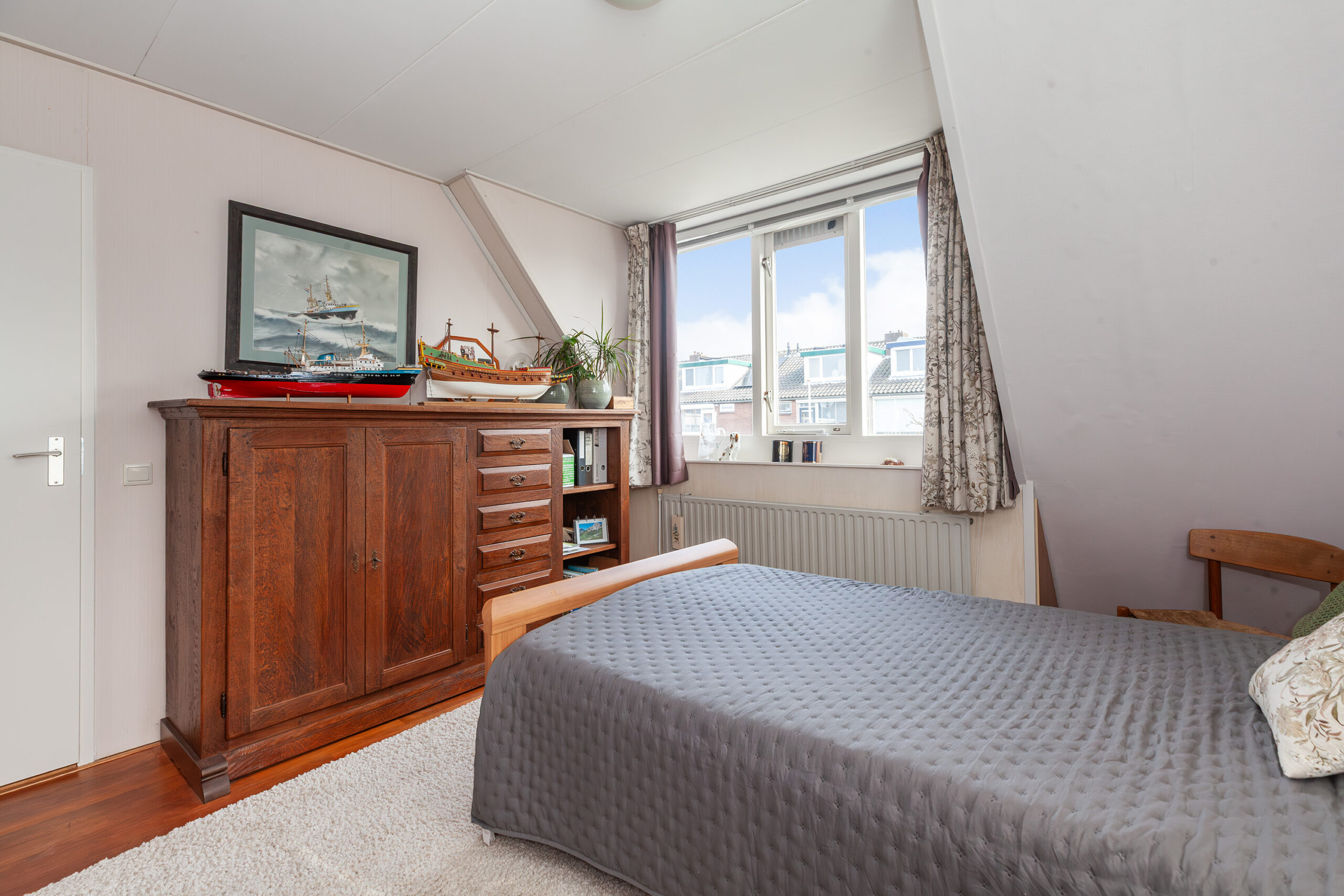 Aan de voorzijde is de derde slaapkamer te vinden. Ook hier is een dakkapel, wat een ruimtelijk effect geeft.
