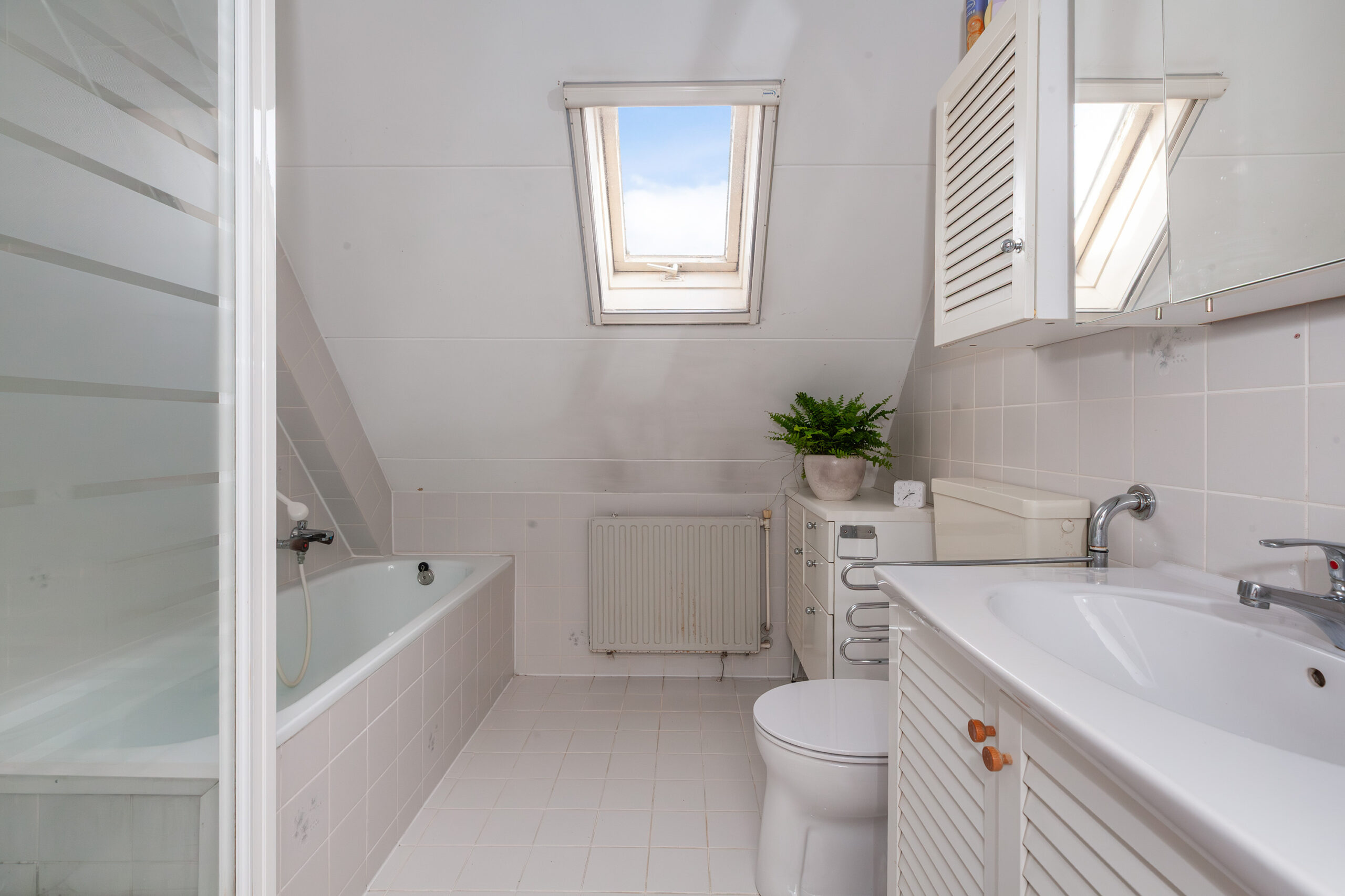 De badkamer is in lichte kleurstelling uitgevoerd met een ligbad, douche, toilet en wastafelmeubel. Tevens is er een tuimelraam.