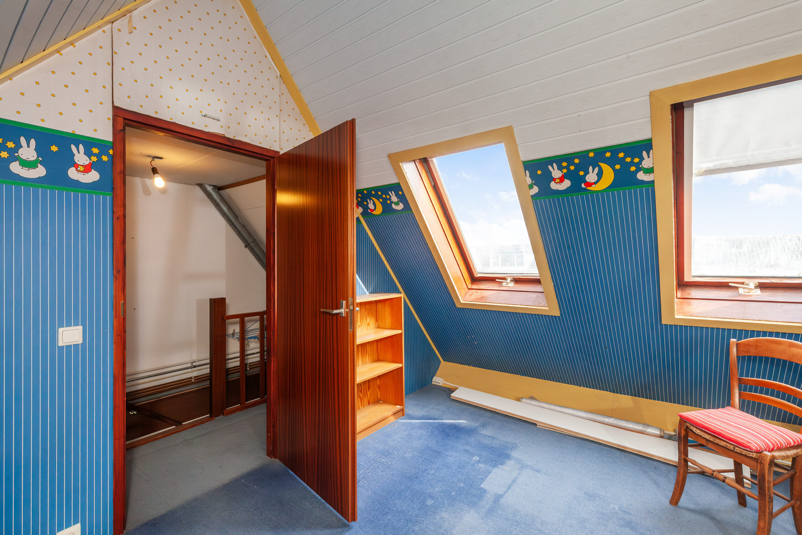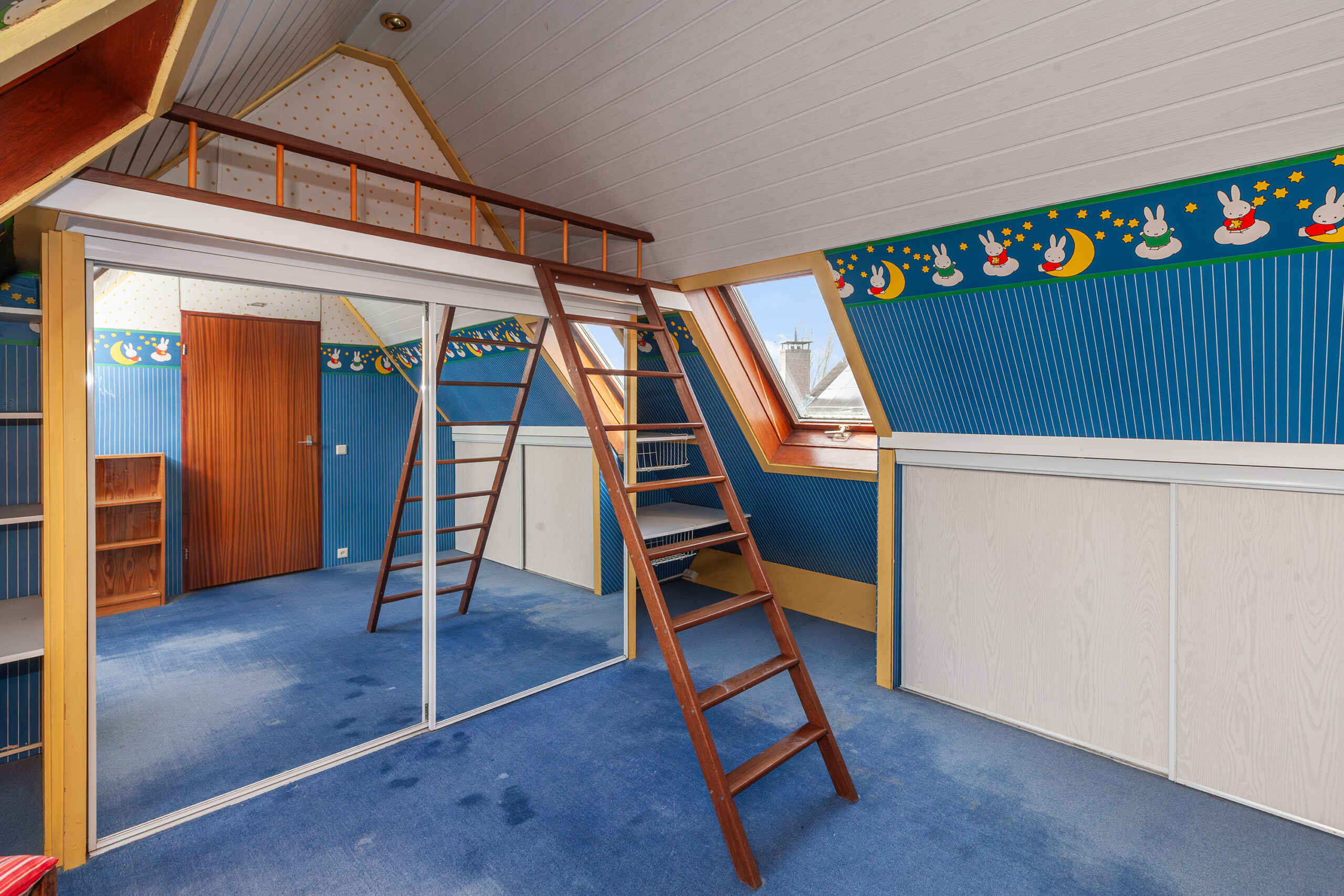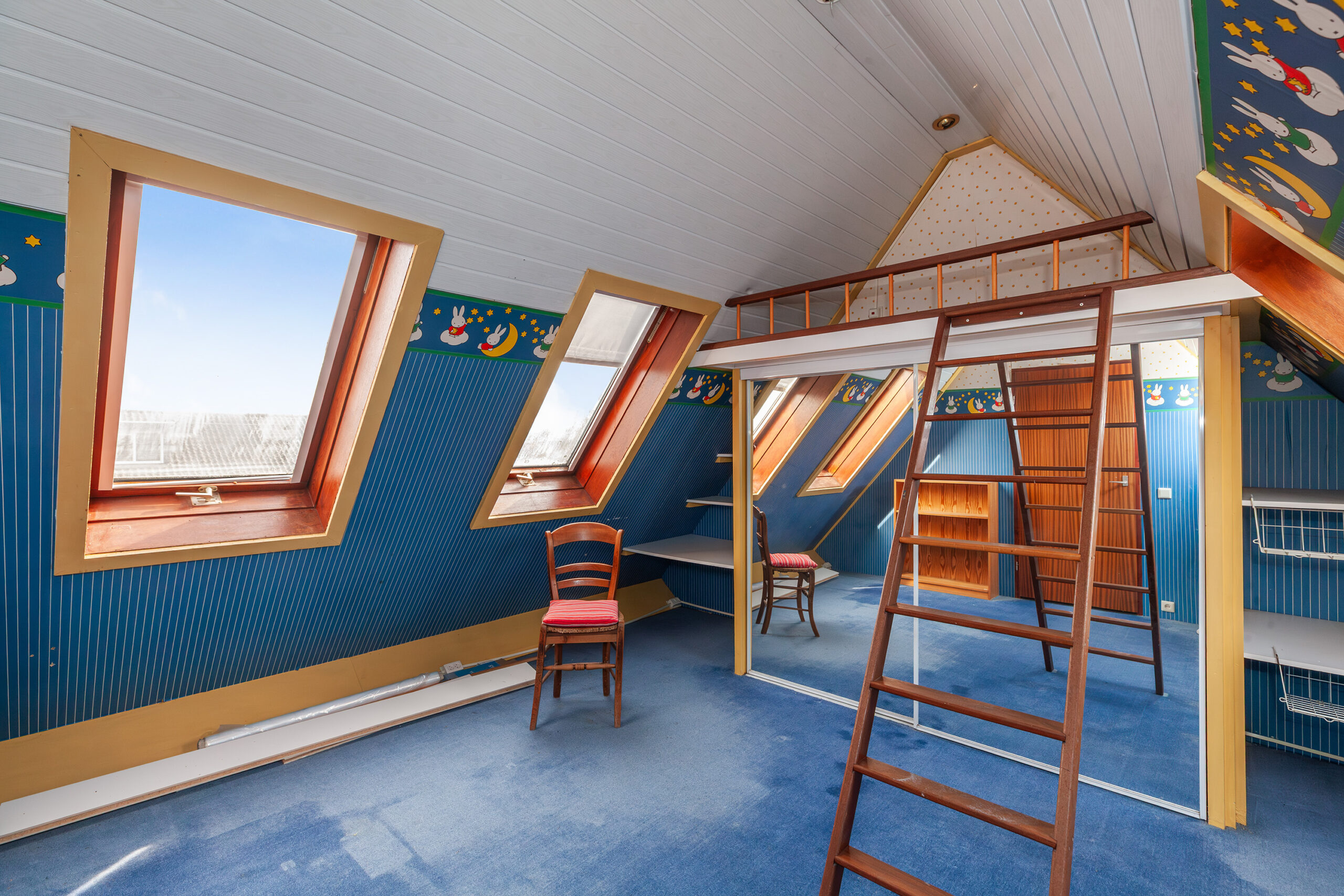 Praktische kamer met diverse vaste kasten. Daarbij is er een hoogslaper boven de grote kast. Doordat er meerdere tuimelramen aanwezig zijn, komt er prettig lichtinval binnen.