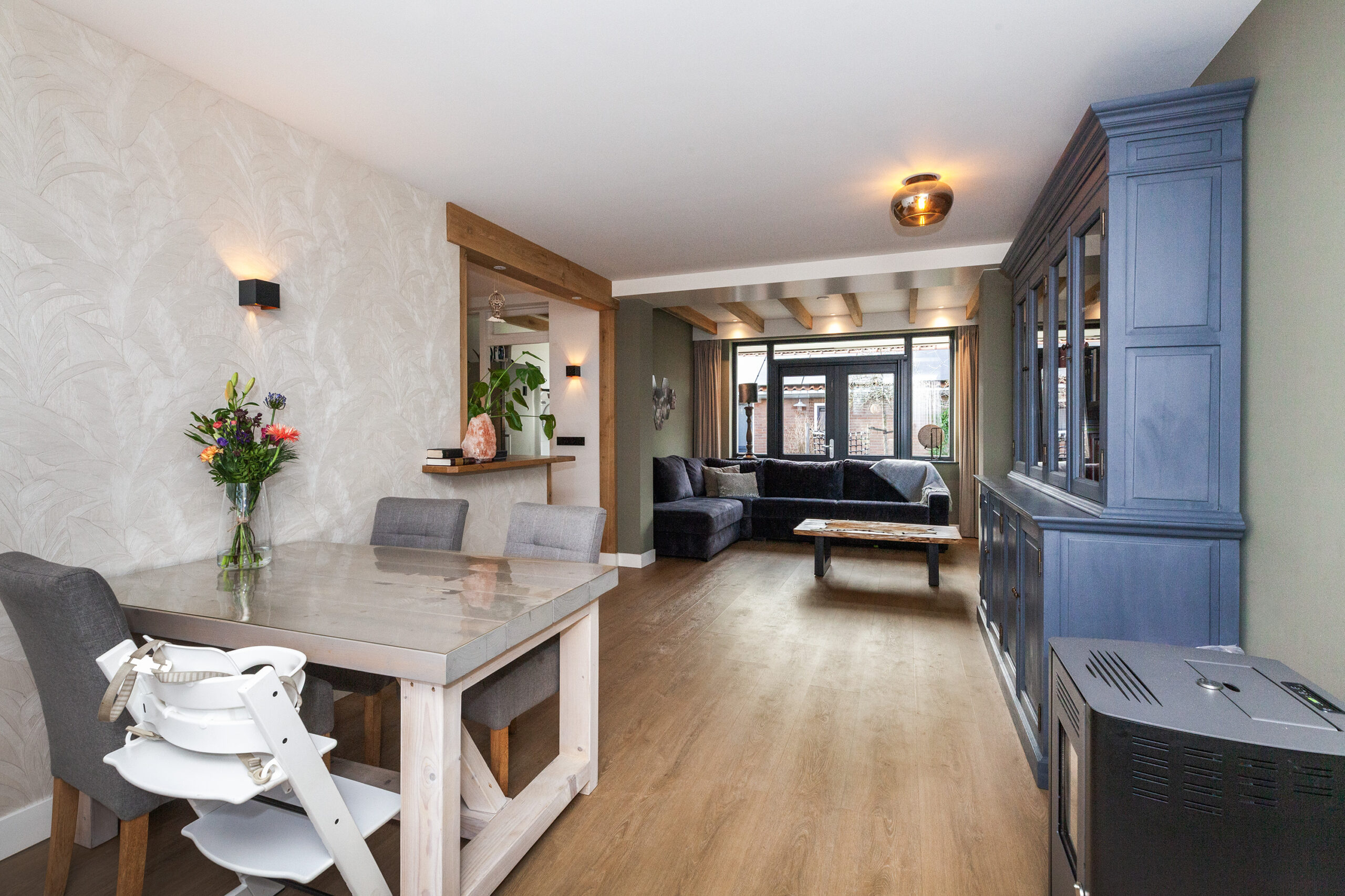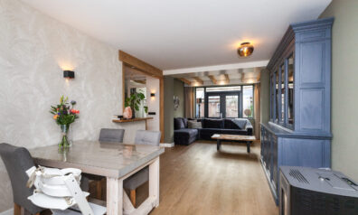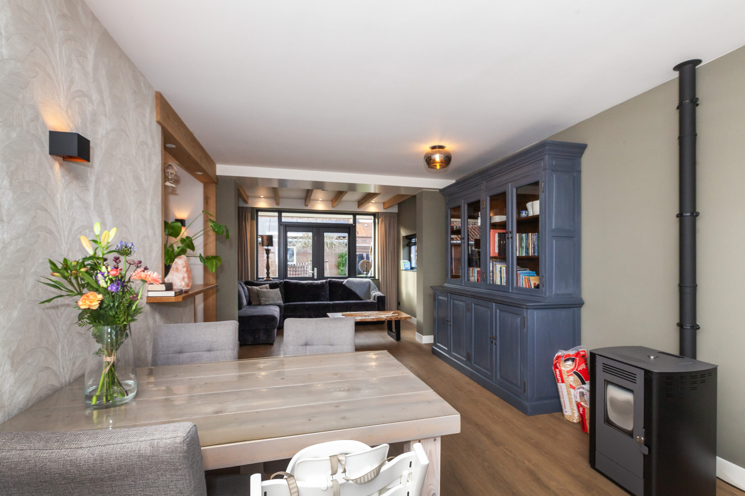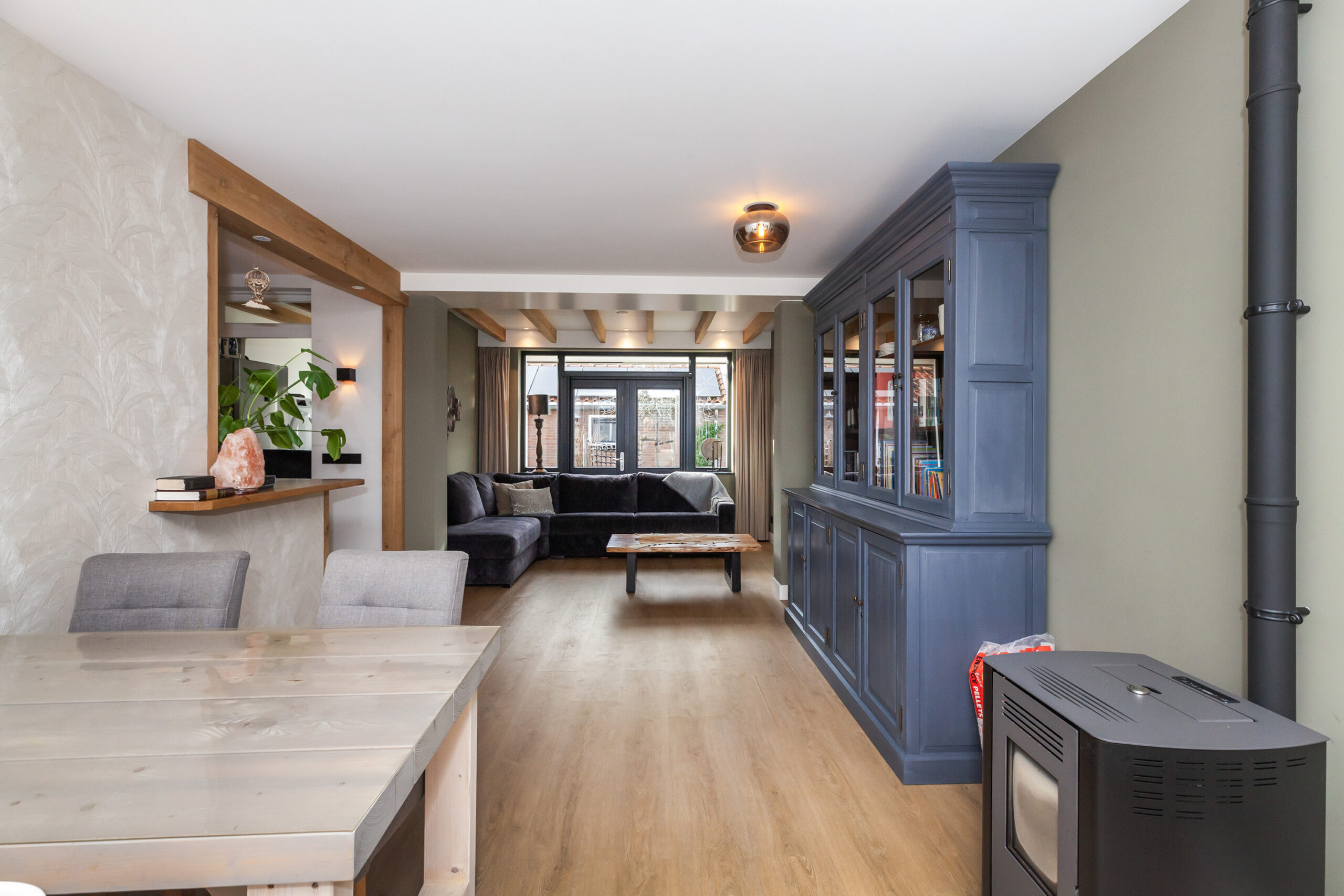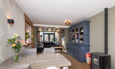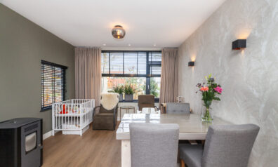 Wat een heerlijke woonkamer is dit! Door de uitbouw aan de achterzijde heeft u niet alleen meer ruimte, maar ook diverse inrichtingsmogelijkheden. Of u nu aan de voorzijde of aan de achterzijde een gezellige zithoek creëert, hier is het mogelijk! Door de extra ramen in de zijgevel en de twee openslaande tuindeuren komt er veel daglicht binnen. Eyecatcher is de sfeervolle pelletkachel, heerlijk voor in de koude wintermaanden.