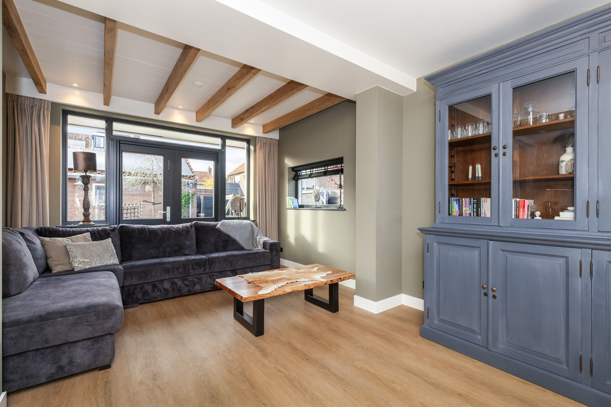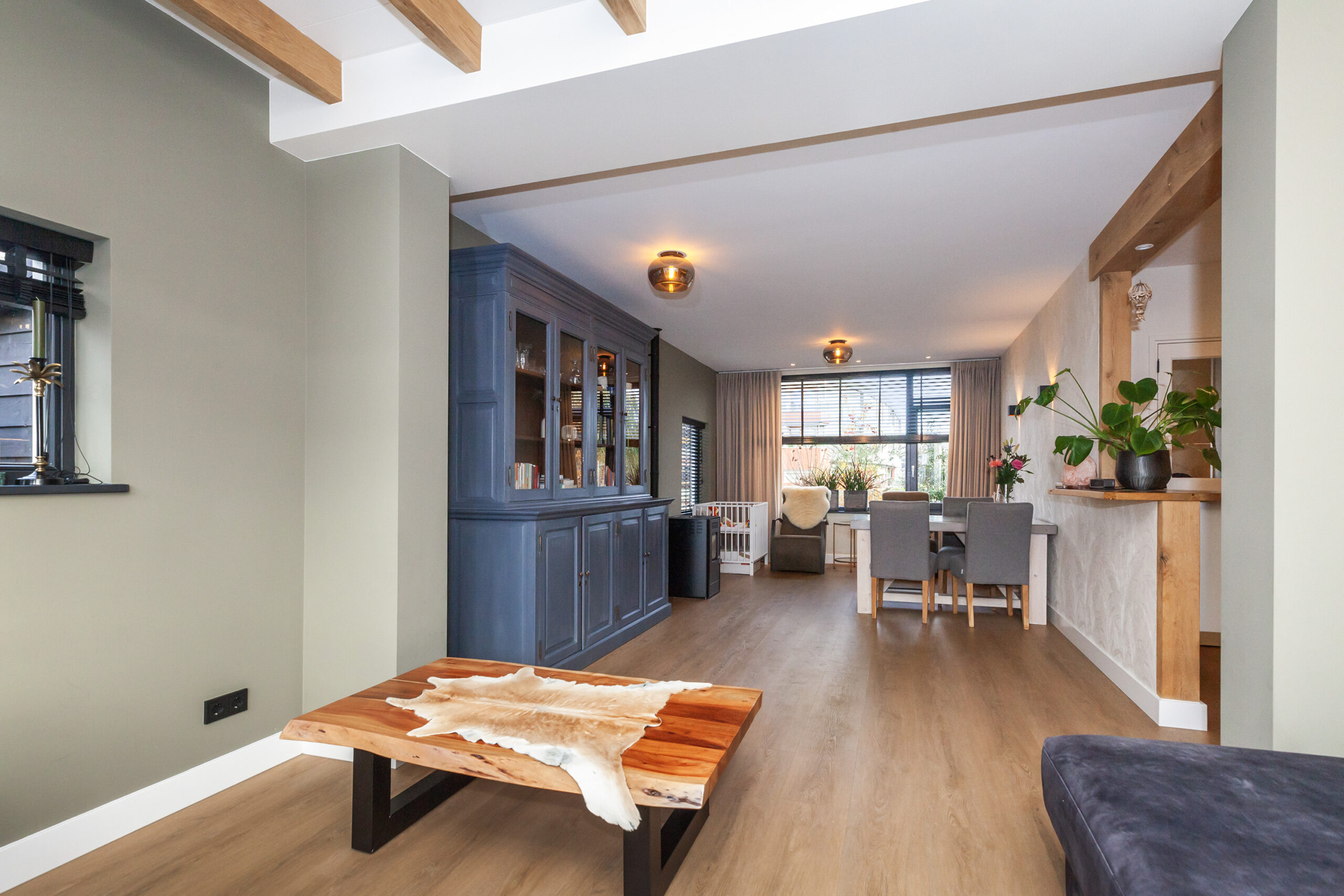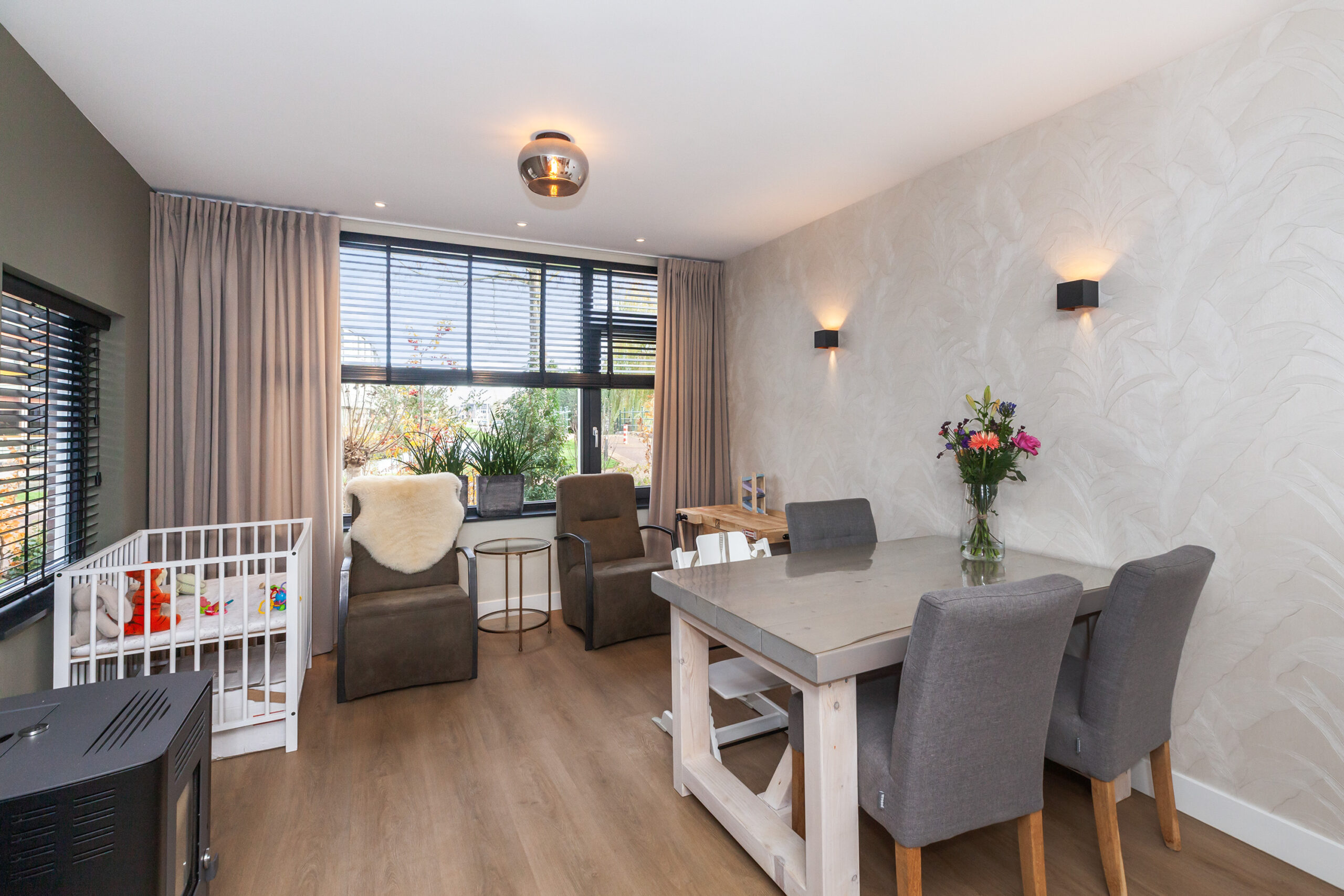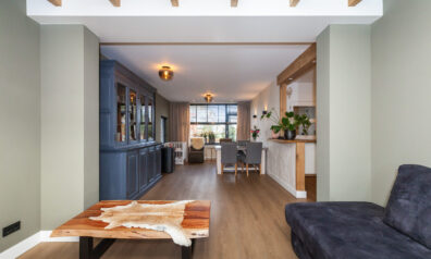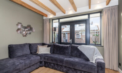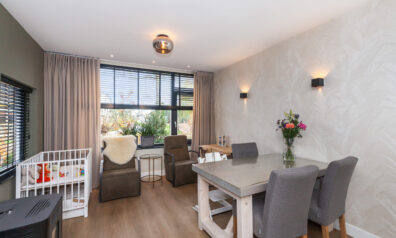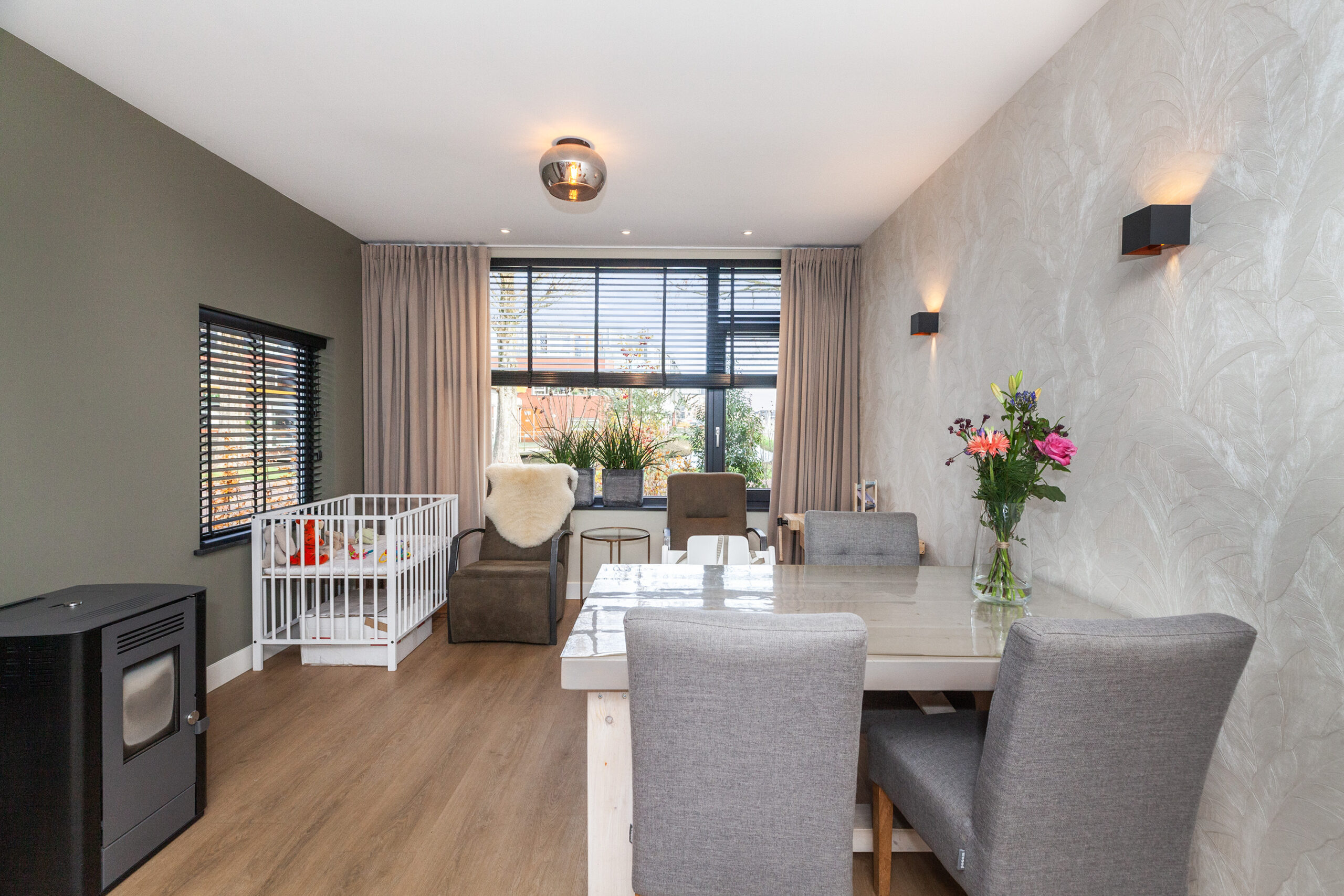Wat een heerlijke woonkamer is dit! Door de uitbouw aan de achterzijde heeft u niet alleen meer ruimte, maar ook diverse inrichtingsmogelijkheden. Of u nu aan de voorzijde of aan de achterzijde een gezellige zithoek creëert, hier is het mogelijk! Door de extra ramen in de zijgevel en de twee openslaande tuindeuren komt er veel daglicht binnen. Eyecatcher is de sfeervolle pelletkachel, heerlijk voor in de koude wintermaanden.