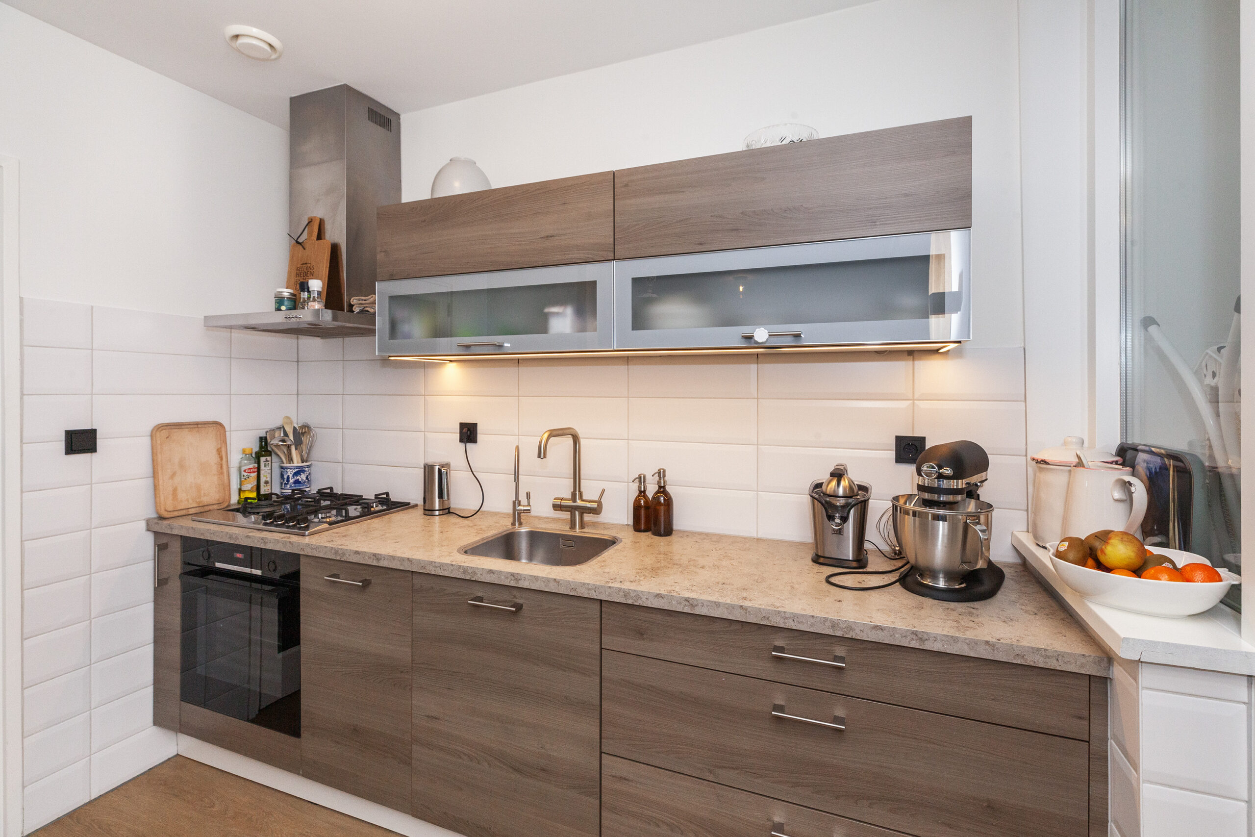 U stapt binnen in een keurige keuken welke voorzien is van alle denkbare gemakken! Aan de rechte opstelling heeft u een 4-pits gaskookplaat, afzuigkap, oven en de spoelbak met een Quooker. Een gezellige bar van eikenhout maakt de verbinding met de woonkamer en hier heeft u extra opbergruimte in de keukenkastjes. Verder is de keuken voorzien van een vaatwasser.
