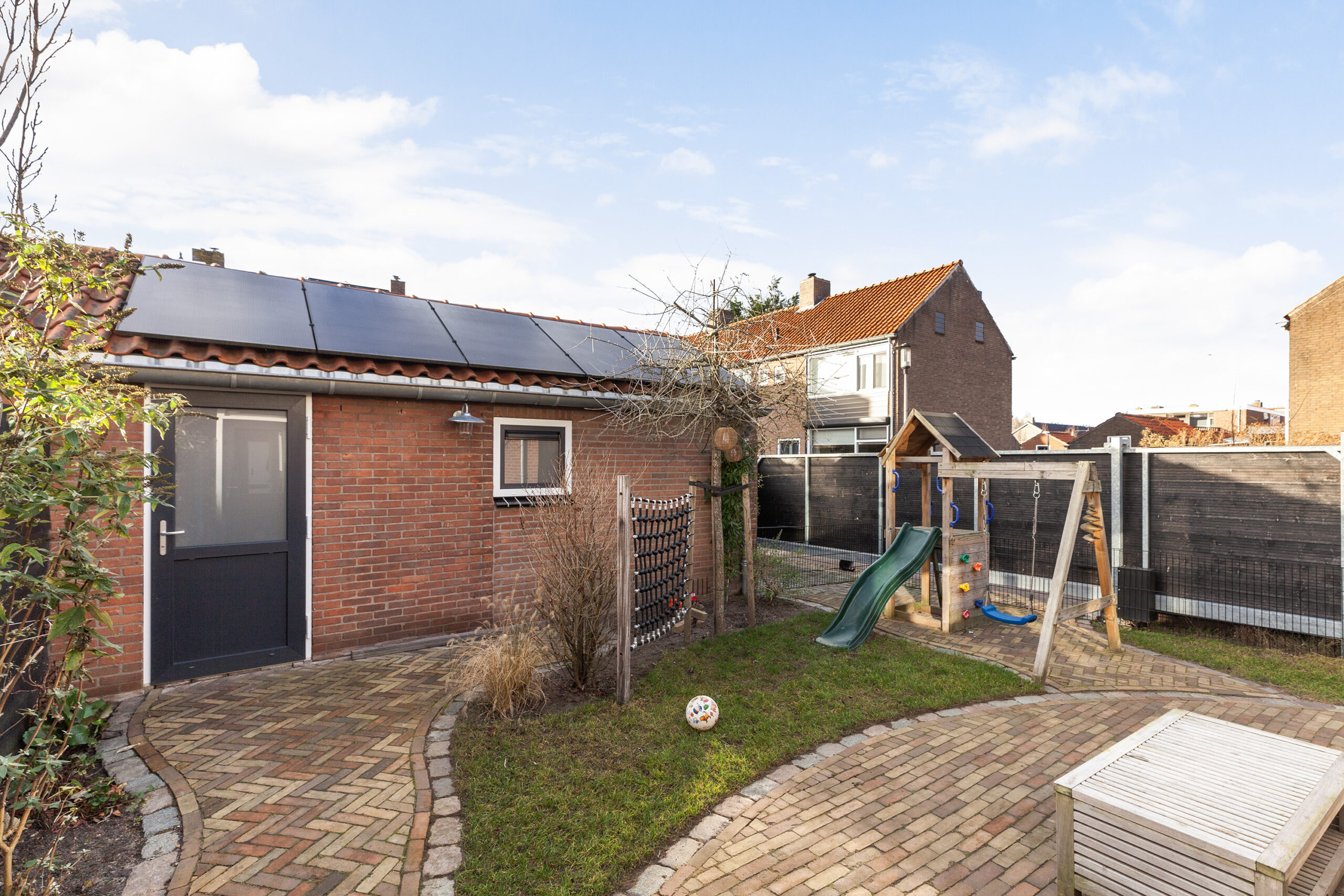 In 2023 is de tuin volledig vernieuwd en deze is gesitueerd op het westen waardoor u tot in de late avonduurtjes kunt genieten van de zon. Er is ook een groot zonnescherm aan de woning. De tuin is ingericht met bestrating en een frisgroen gras. Achter in de tuin staat een grote garage van circa 5.88 x 2.91m en voorzien van dakisolatie. Er is ook een grote zolder (circa 9 m²) waardoor u extra opbergmogelijkheden hebt. Ook in de garage zijn allerlei slimme en praktische details waardoor veel gemak hiervan zult hebben. Via de elektrische poort kunt u dan ook met de auto naar deze garage. Aan de zijzijde is nog een extra berging van circa 3.04 x 2.40m, ideaal voor het plaatsen van bijvoorbeeld de fietsen of containers.