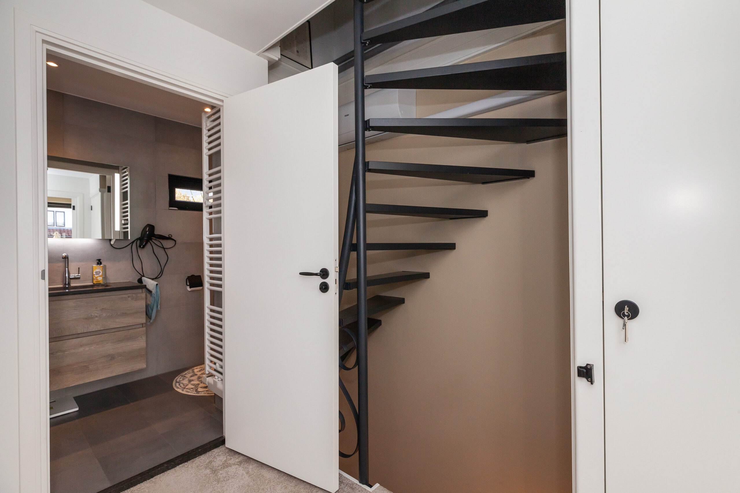 Vanaf de overloop komt u in de drie slaapkamers en de badkamer. Tevens is er een praktische inbouwkast waar nog aansluitingen zijn om de wasmachine en droger te plaatsen. Bij de trap is een airco waar u op alle woonlagen plezier van zult hebben vanwege het grote vermogen.