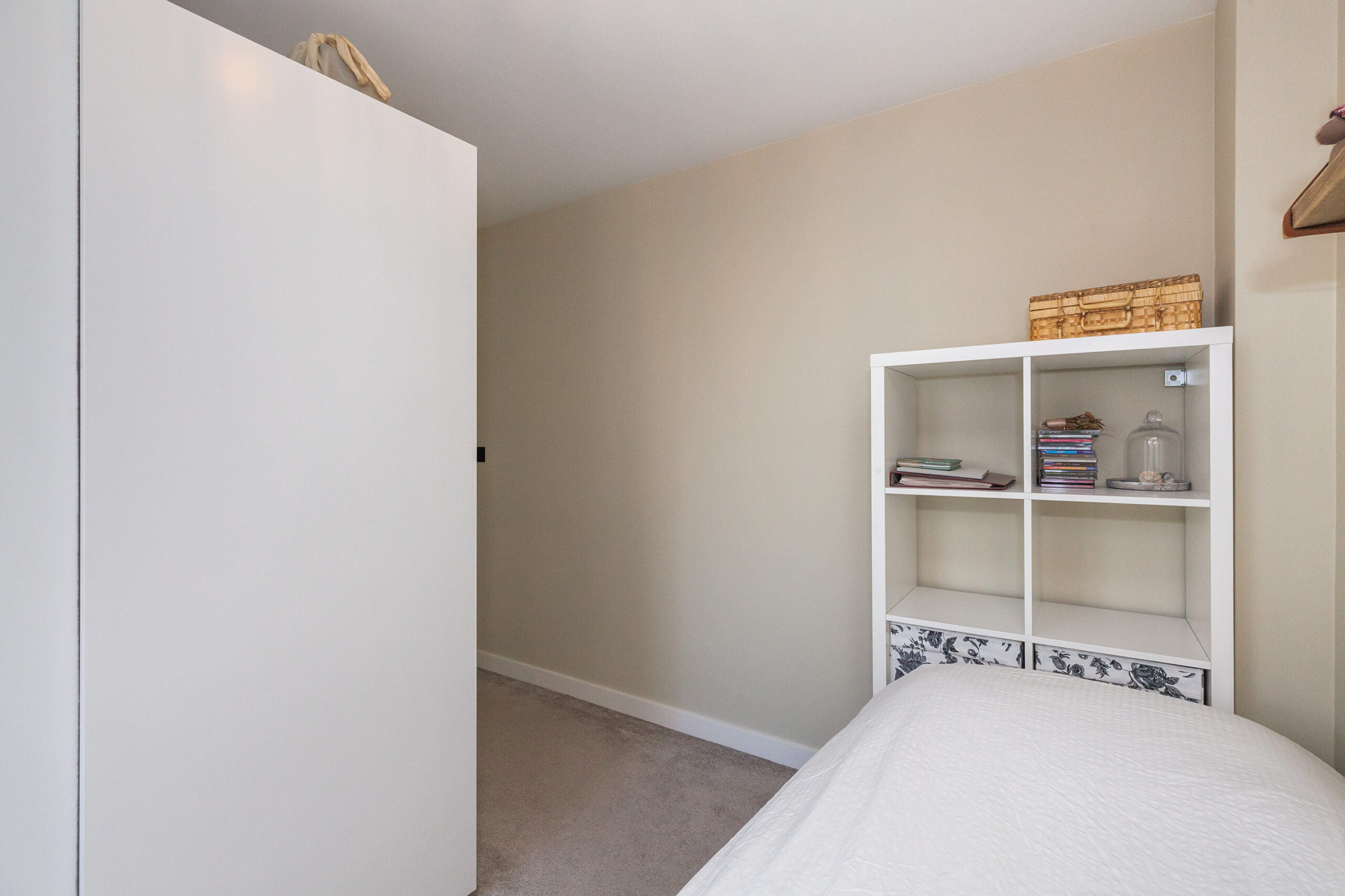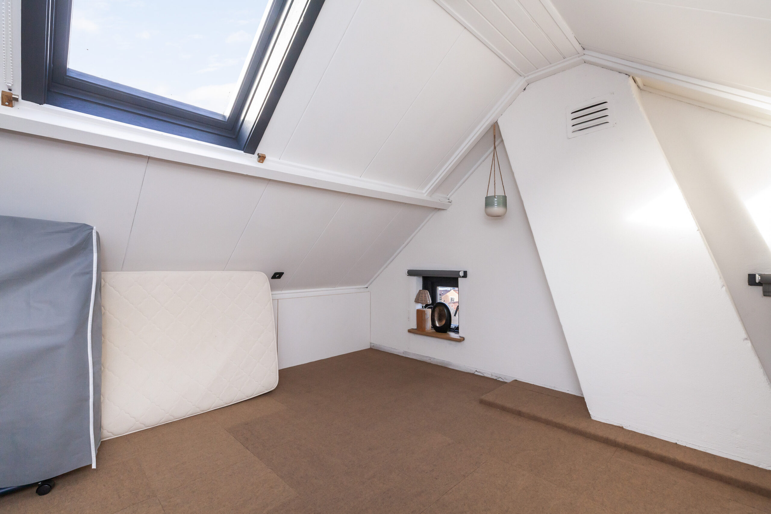 Praktische kamer voorzien van bergingen onder de schuine dakdelen en een groot tuimelraam.