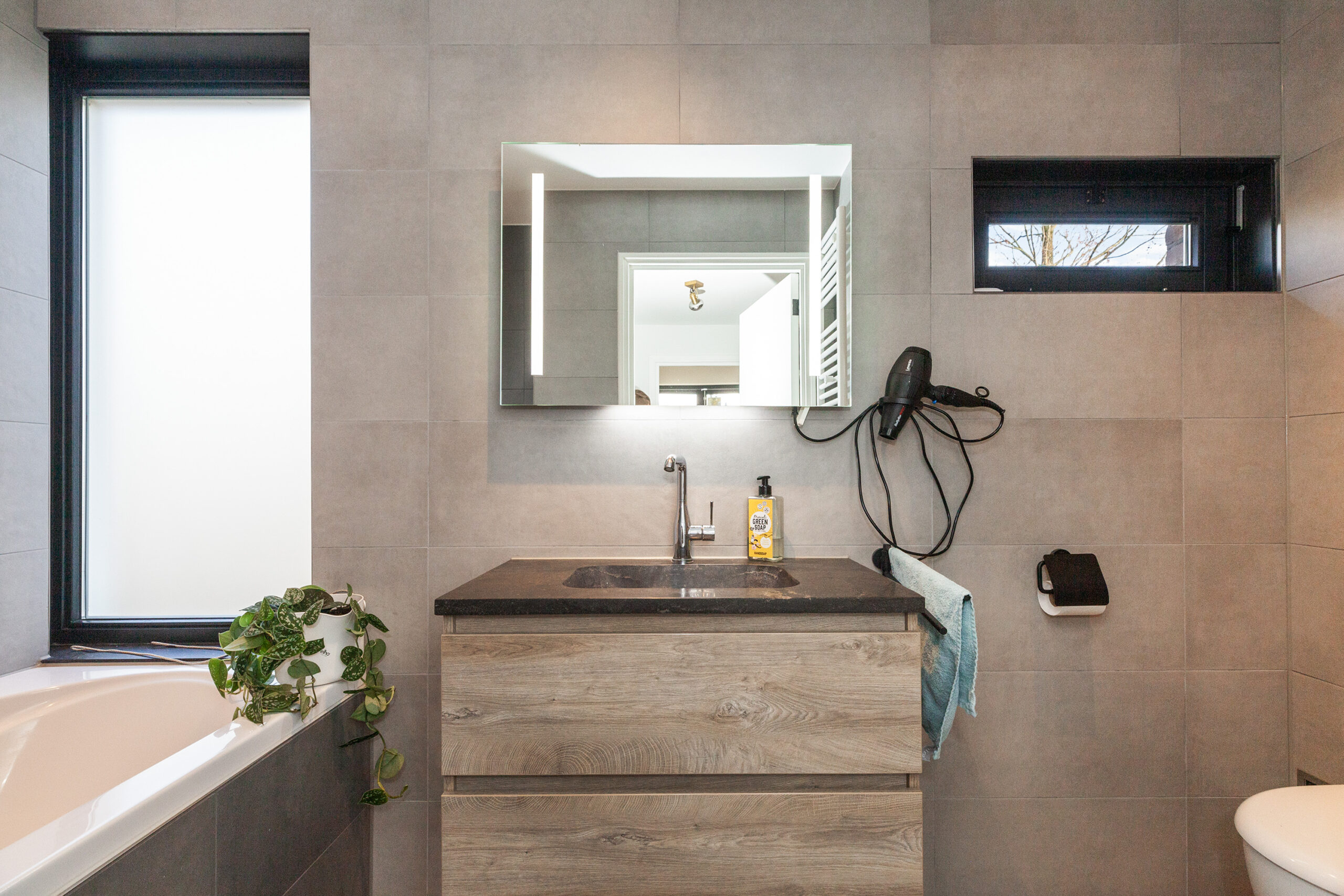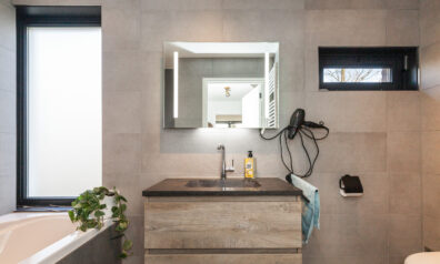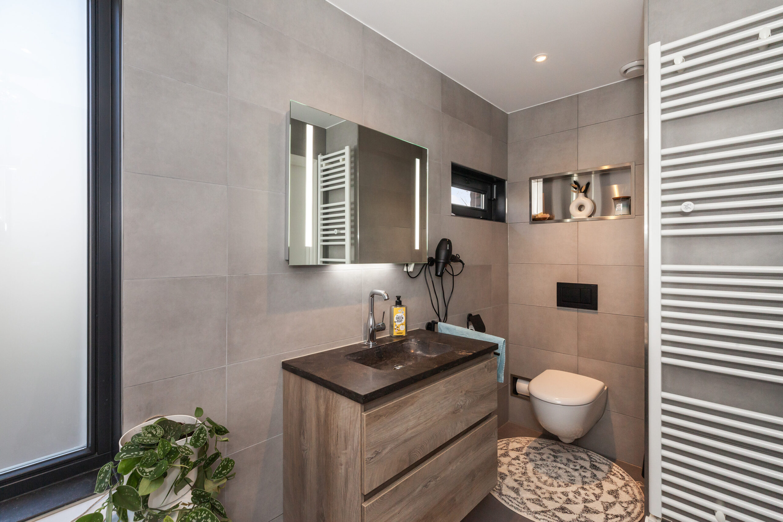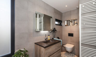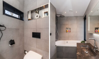 De badkamer is zo praktisch ingericht dat u alle gemakken hier hebt! Er is namelijk een ligbad met douche, toilet, designradiator en een wastafelmeubel. Daarbij heeft u uiteraard ook vloerverwarming.