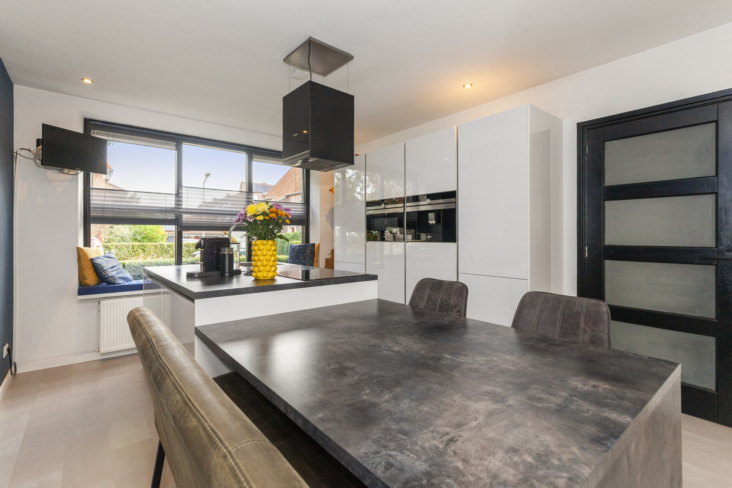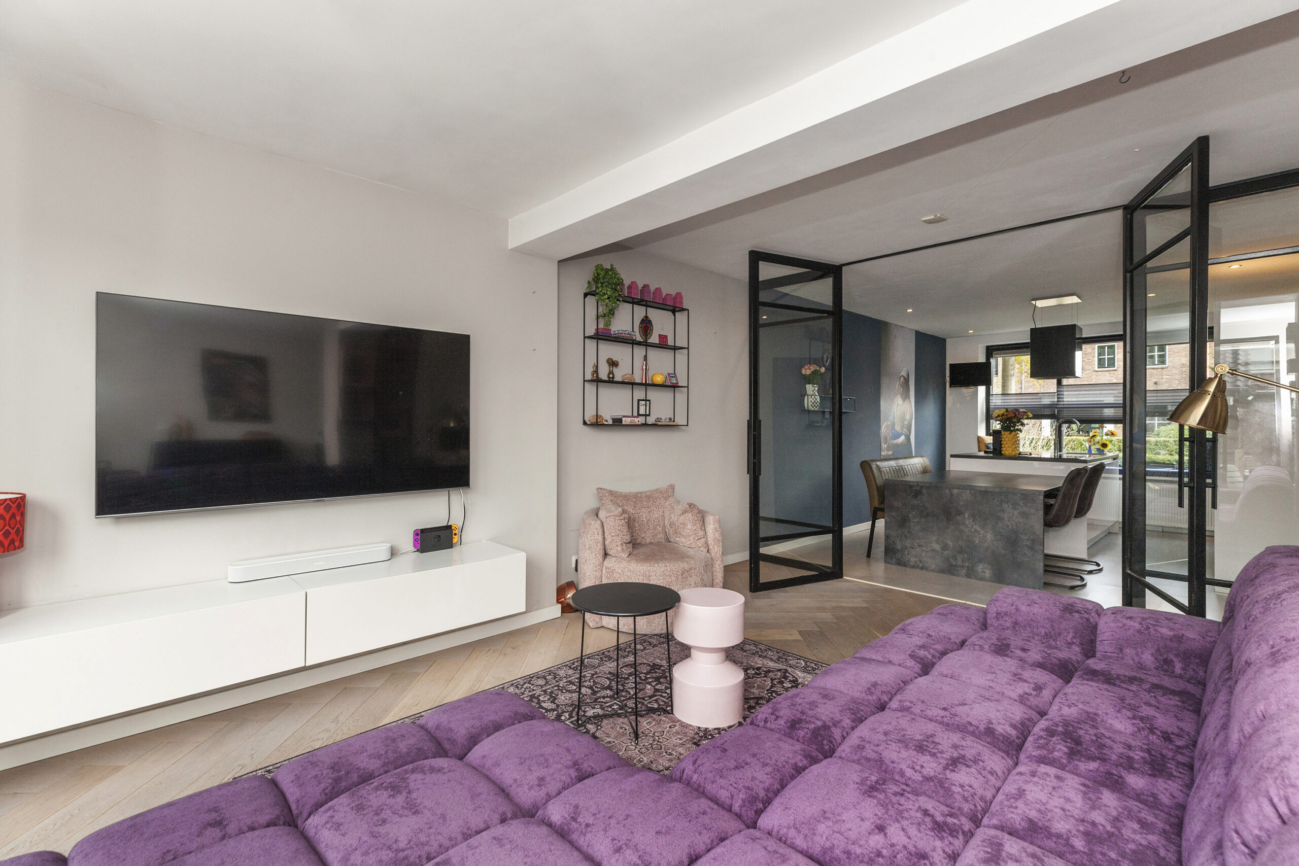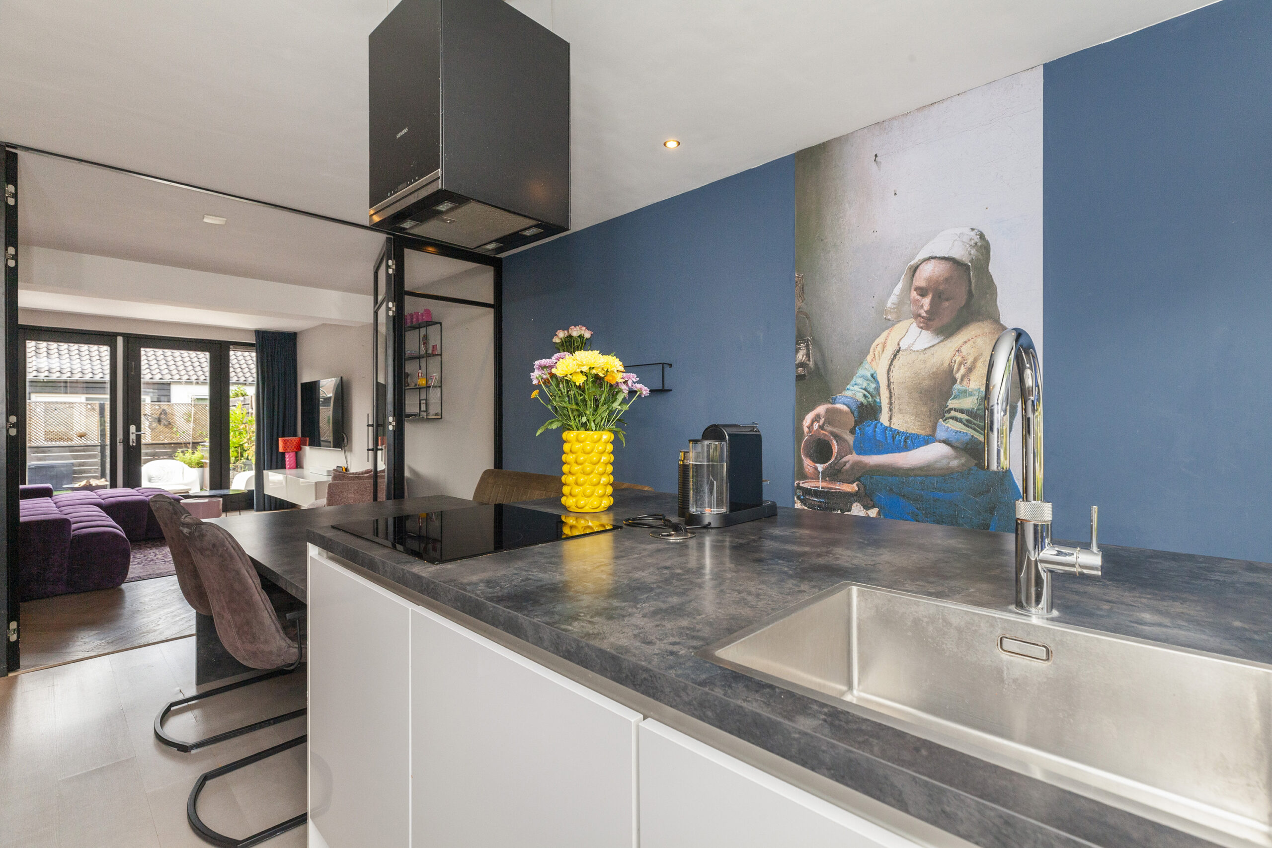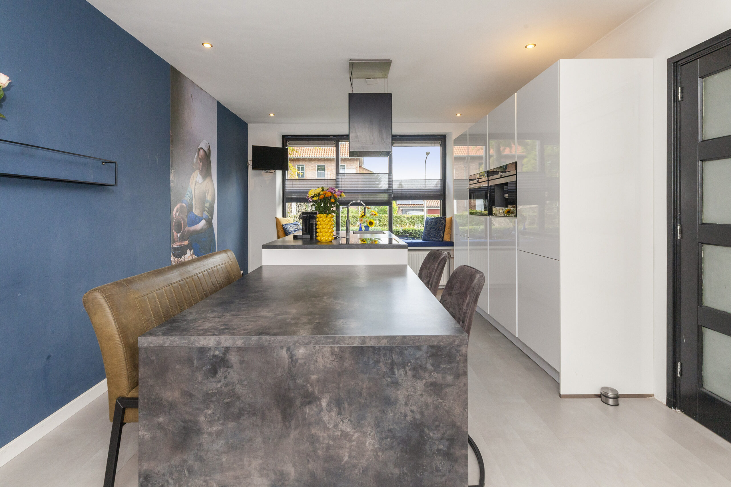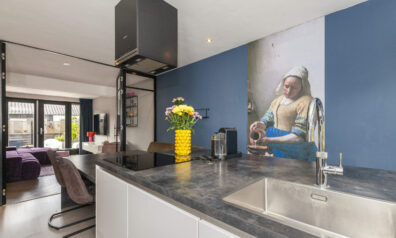 Een bijzonder sfeervol detail is het behang met ‘Het Melkmeisje’, dat de keuken een karaktervolle en unieke uitstraling geeft. In het raamkozijn is een gezellig zitbankje gecreëerd met leuk zicht over de voorgelegen straat. Het verlengde van het kookeiland fungeert als eettafel en via twee openslaande deuren is er direct toegang tot de woonkamer, wat zorgt voor een open en uitnodigend geheel.