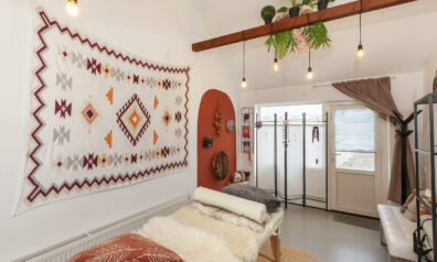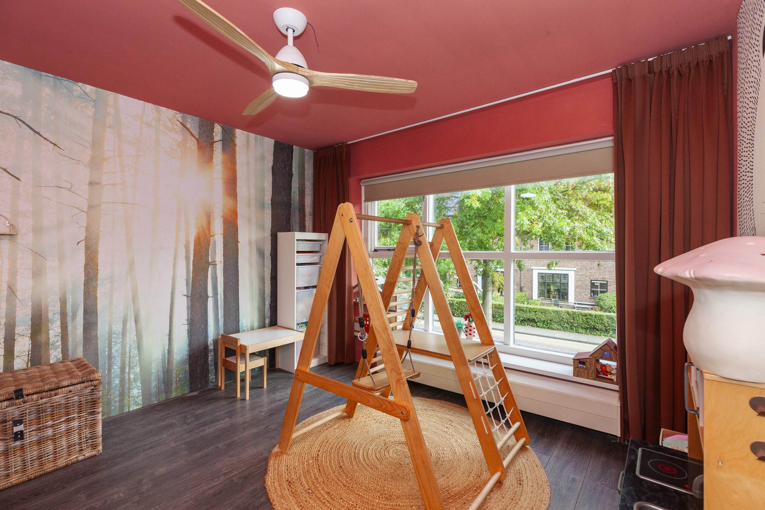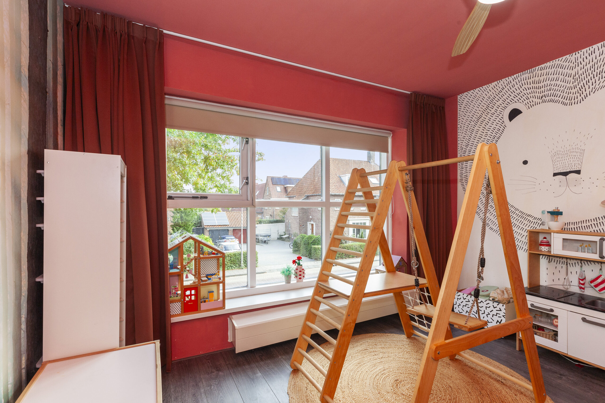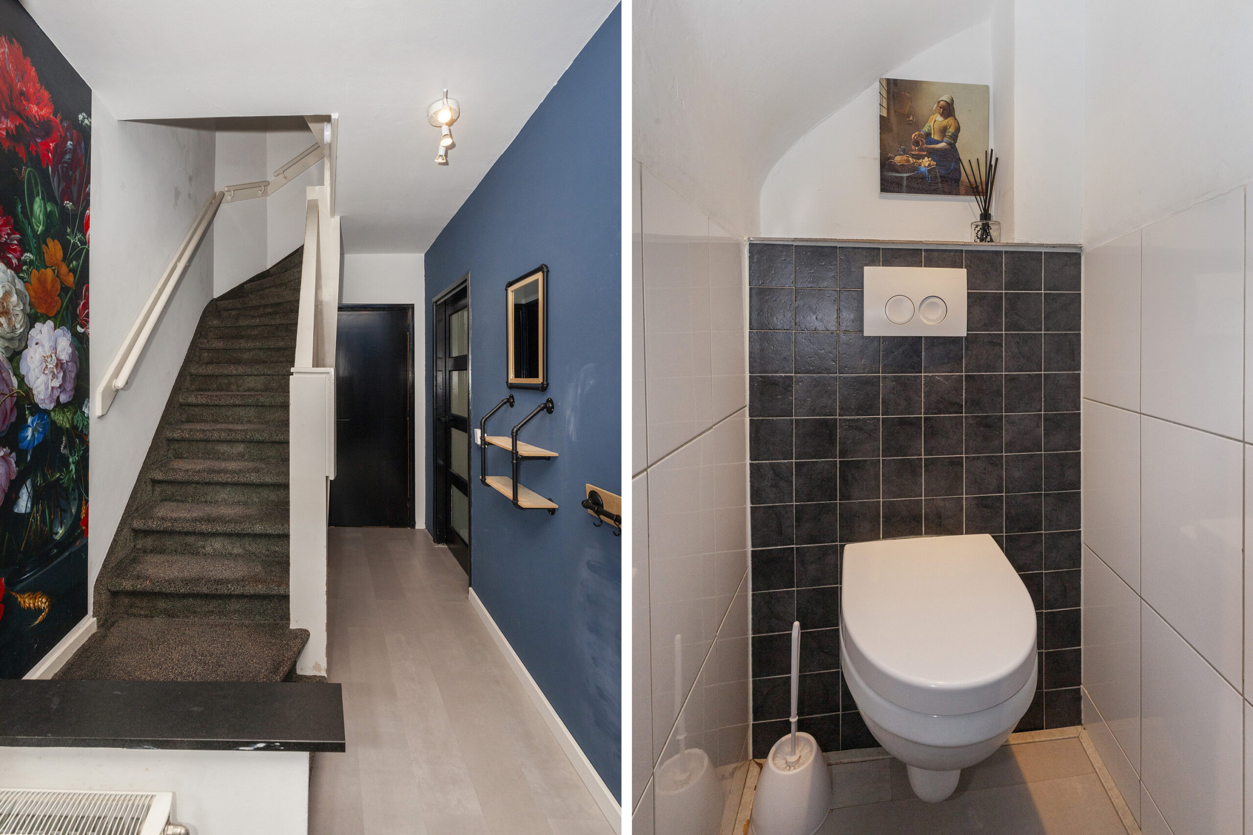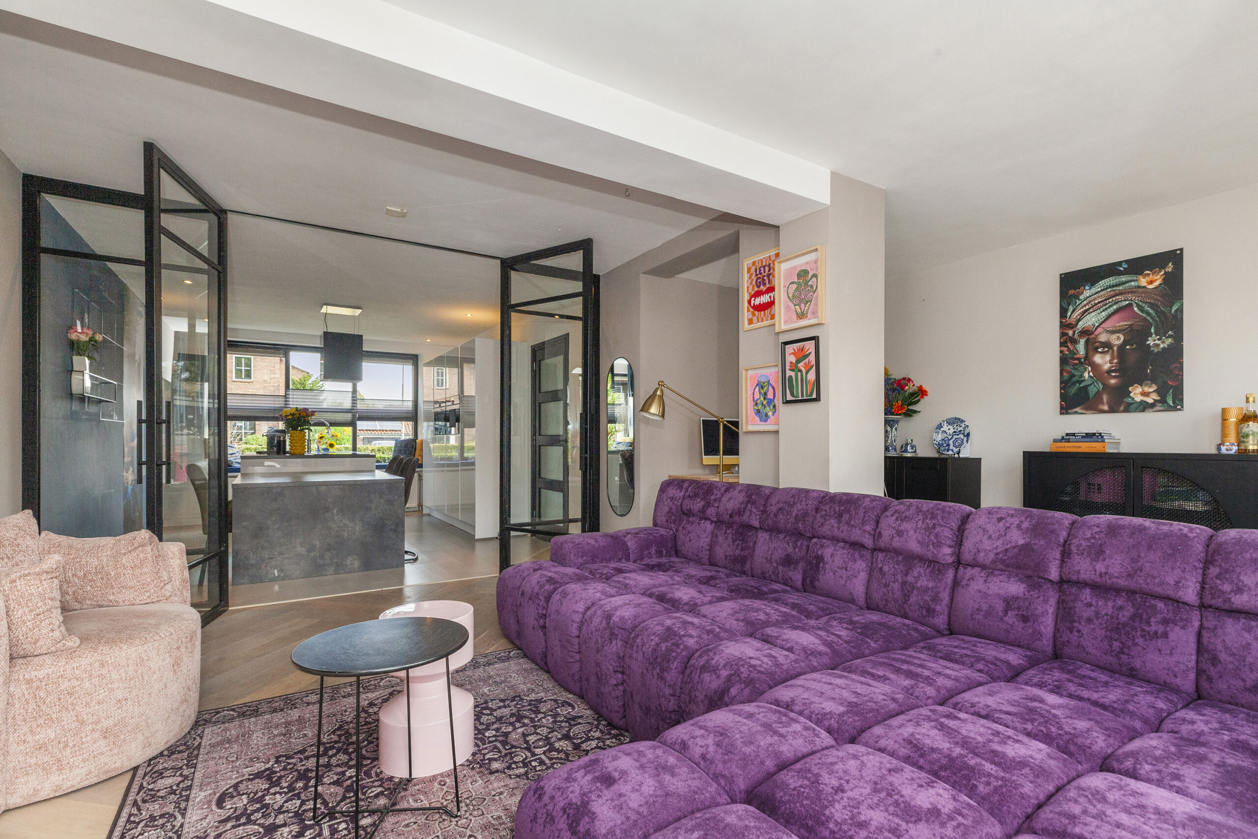 Een bijzonder sfeervol detail is het behang met ‘Het Melkmeisje’, dat de keuken een karaktervolle en unieke uitstraling geeft. In het raamkozijn is een gezellig zitbankje gecreëerd met leuk zicht over de voorgelegen straat. Het verlengde van het kookeiland fungeert als eettafel en via twee openslaande deuren is er direct toegang tot de woonkamer, wat zorgt voor een open en uitnodigend geheel.