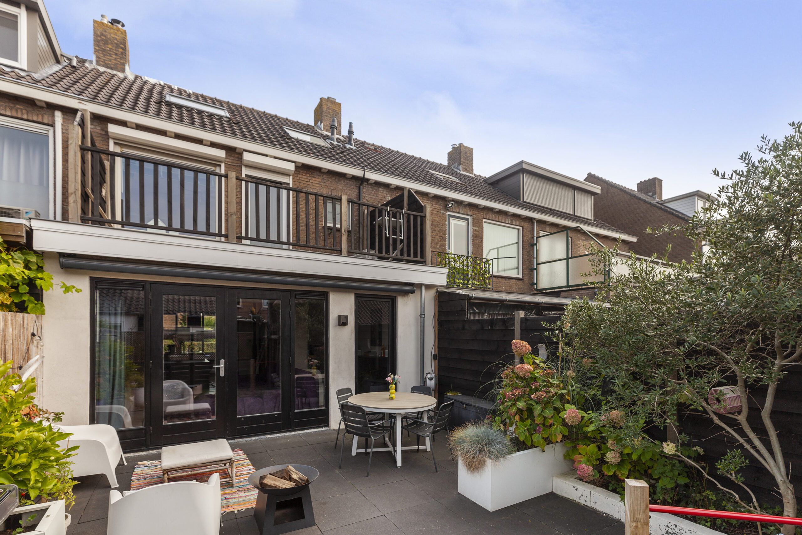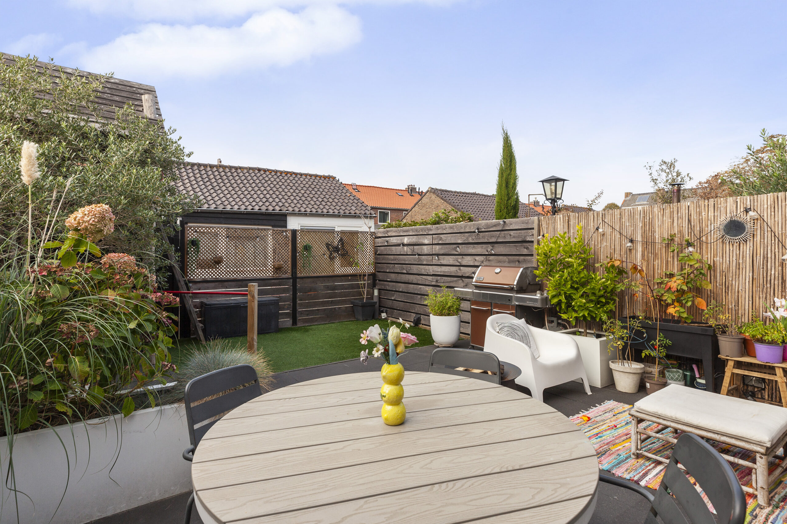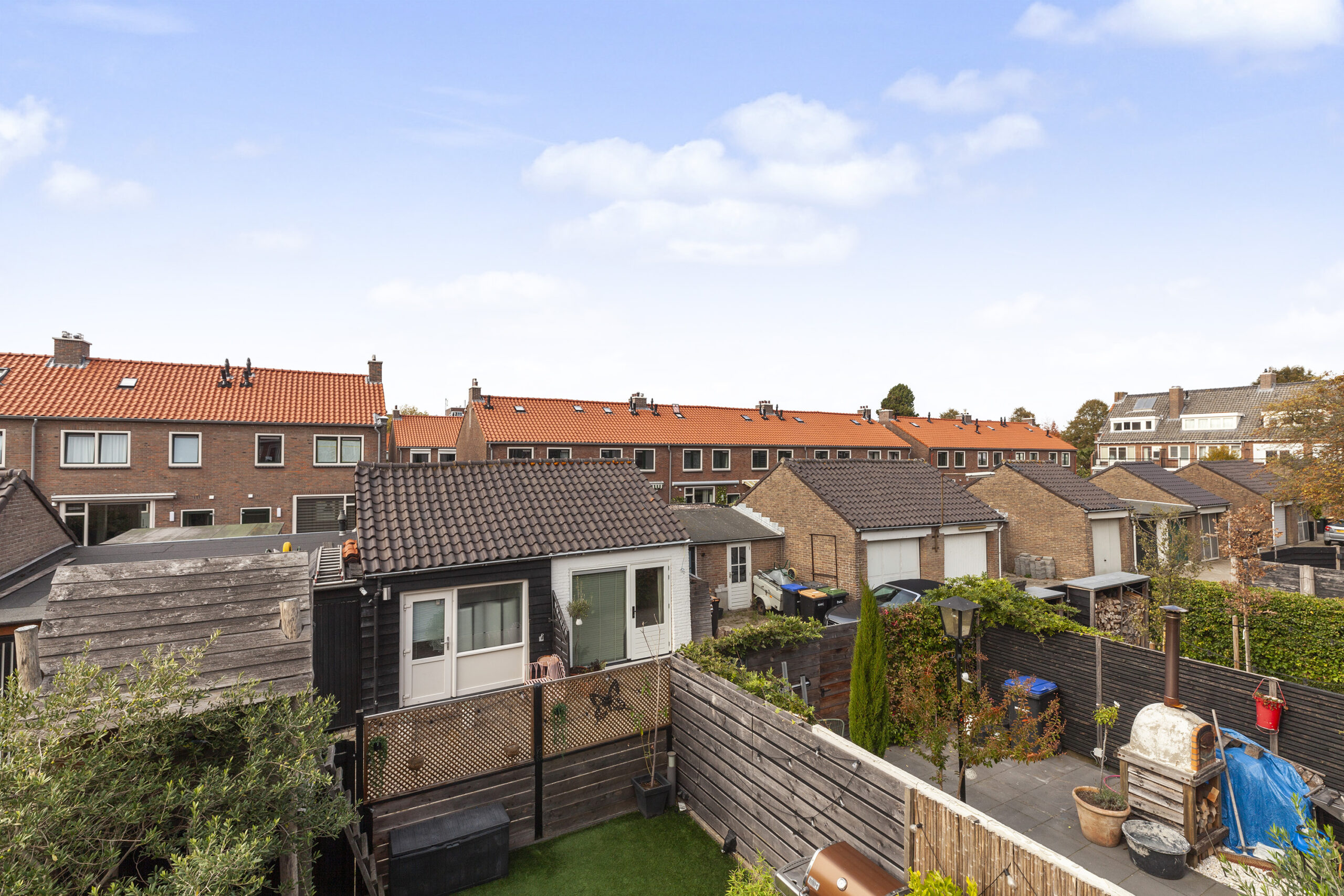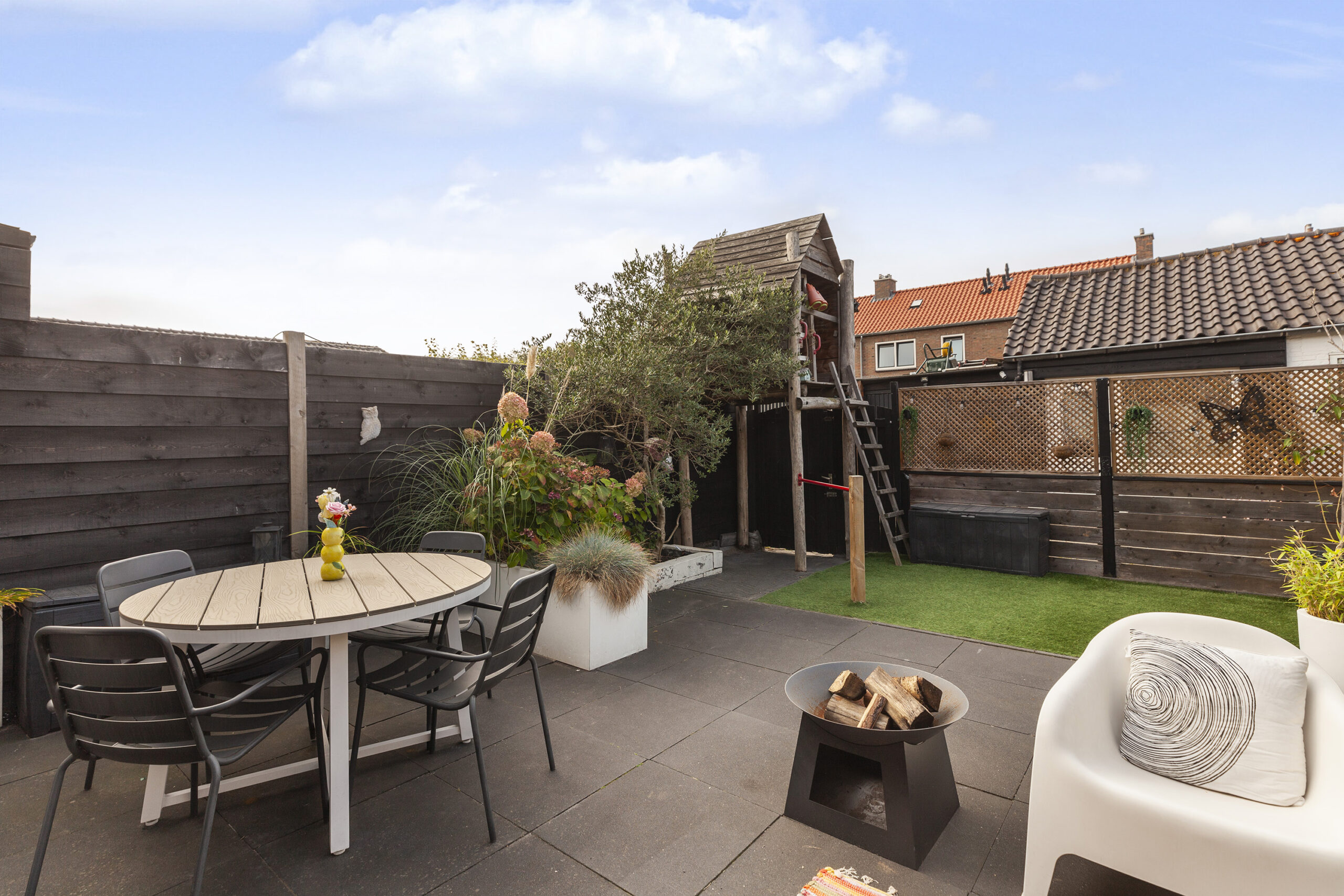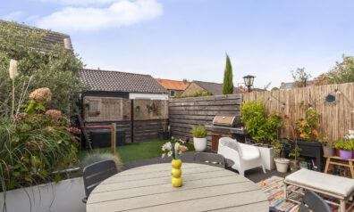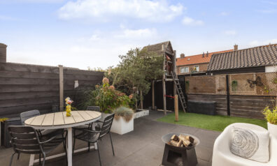 De achtertuin is gesitueerd op het westen en biedt u veel privacy. Er is een terras, met een elektrisch zonnescherm, planten bak, kunstgras en een leuke speelhut voor de kinderen. Via de achtergelegen poort komt u in een straatje waar u de garage en praktijkruimte heeft.