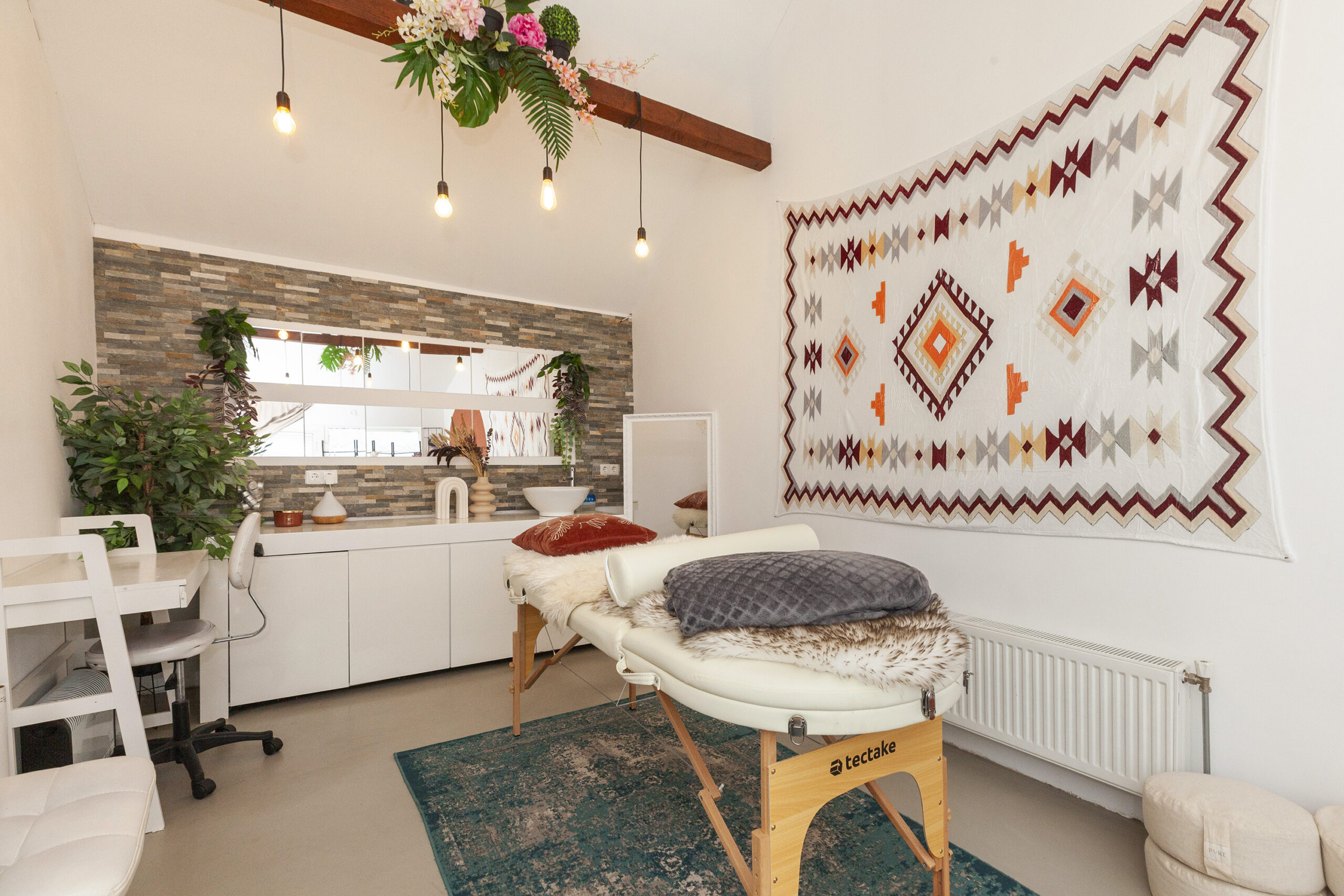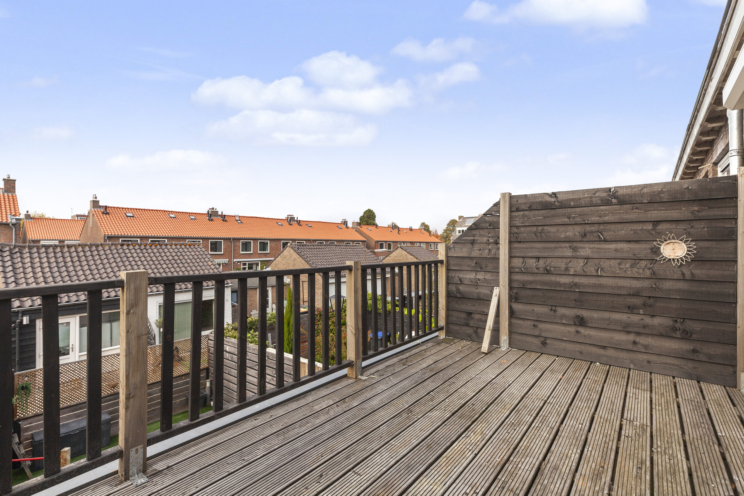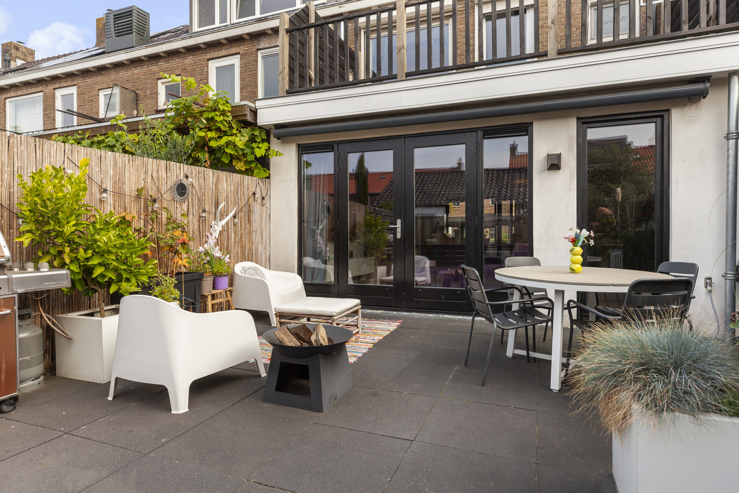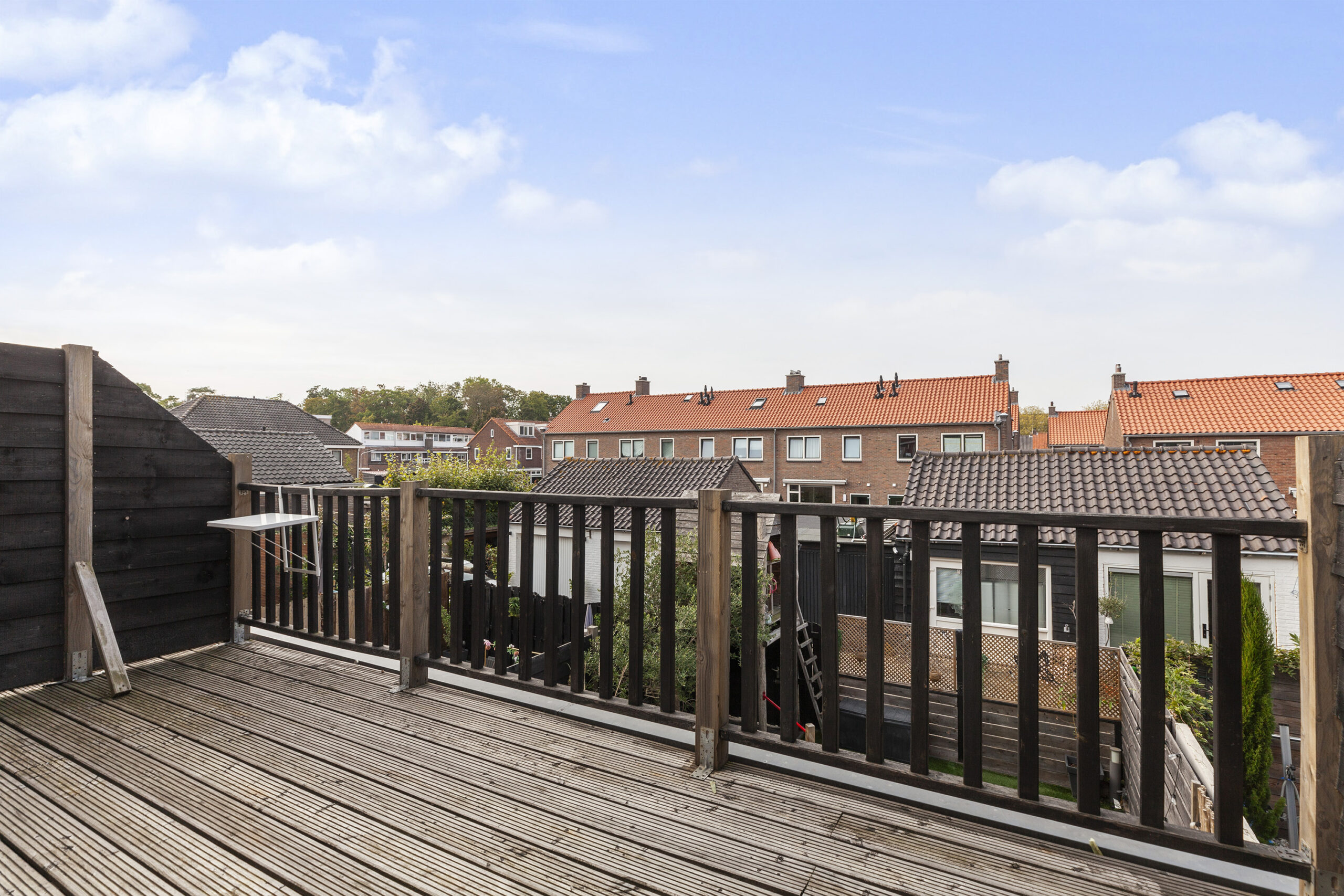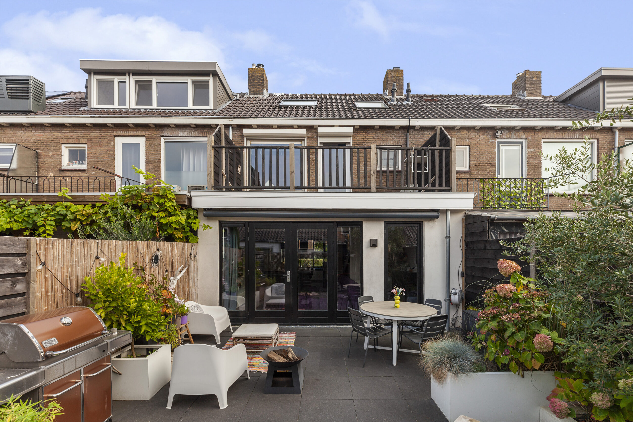 De achtertuin is gesitueerd op het westen en biedt u veel privacy. Er is een terras, met een elektrisch zonnescherm, planten bak, kunstgras en een leuke speelhut voor de kinderen. Via de achtergelegen poort komt u in een straatje waar u de garage en praktijkruimte heeft.