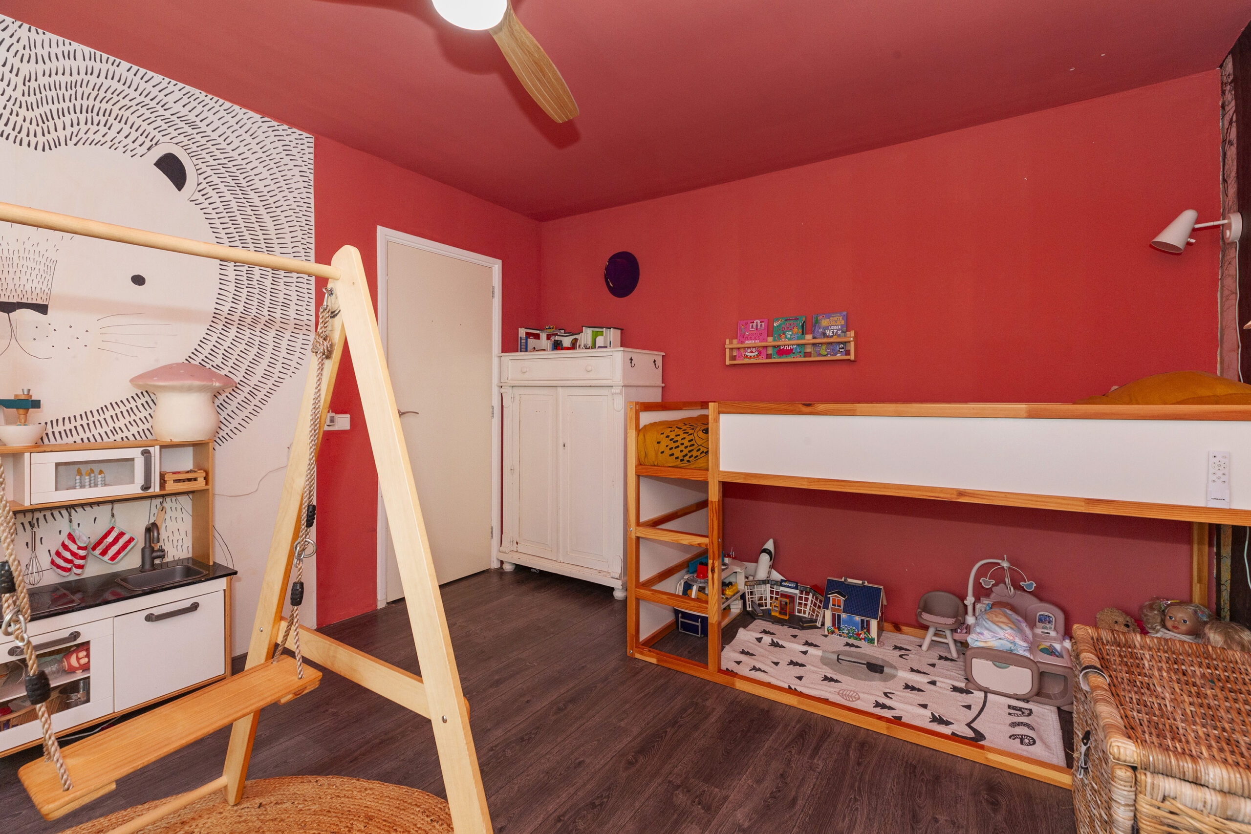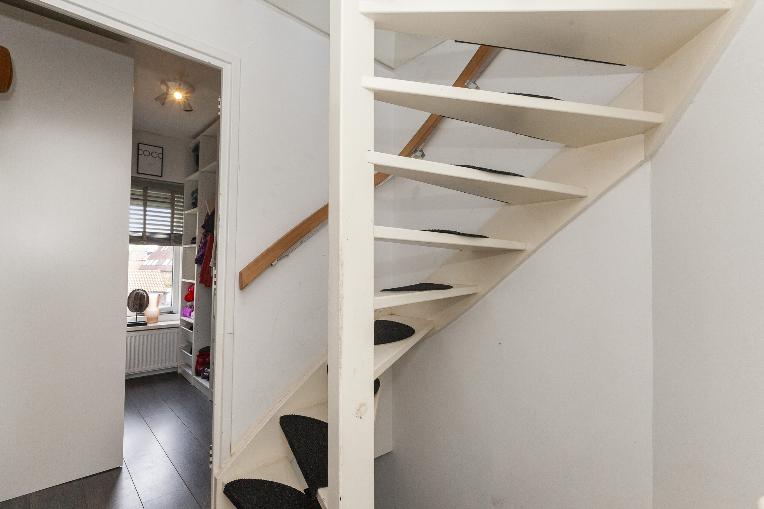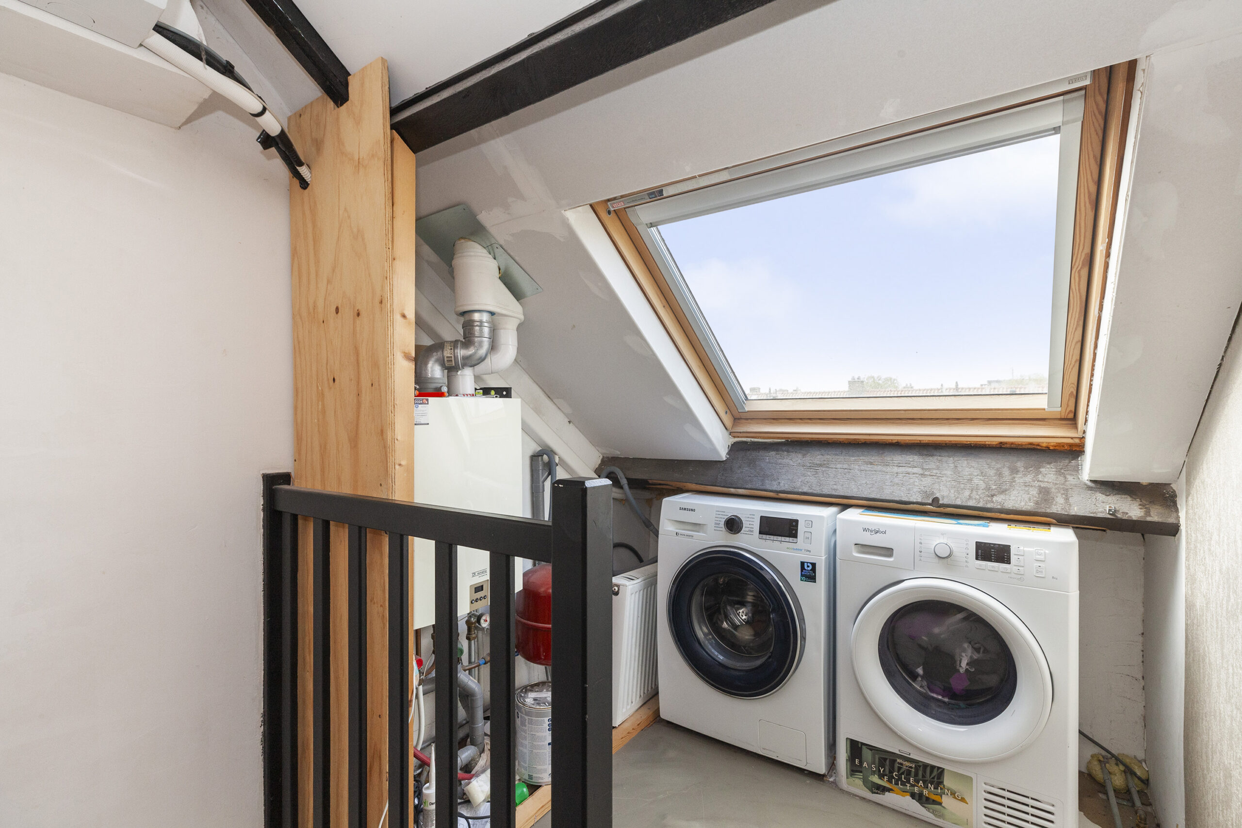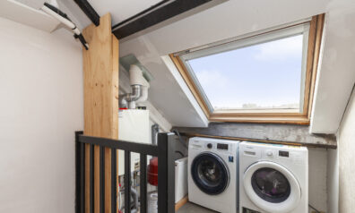 Op de tweede verdieping is meer ruimte dan u op het eerste oog verwacht. Op de ruime overloop heeft u aan de achterzijde een groot tuimelraam, de C.V.-ketel en de aansluitingen voor uw wasmachine en droger. Aan de andere zijde is er een grote inloopberging, ideaal voor het opbergen van allerlei spullen! Boven de trap hangt een airco waar u zowel op deze verdieping, als op de eerste verdieping plezier van heeft. Via de grote schuifdeur komt u in de vierde slaapkamer.
