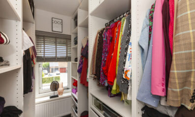 Eveneens aan de voorzijde is deze derde slaapkamer. Momenteel is deze ingericht als dressingroom. Ook hier is het raam voorzien van een rolluik.