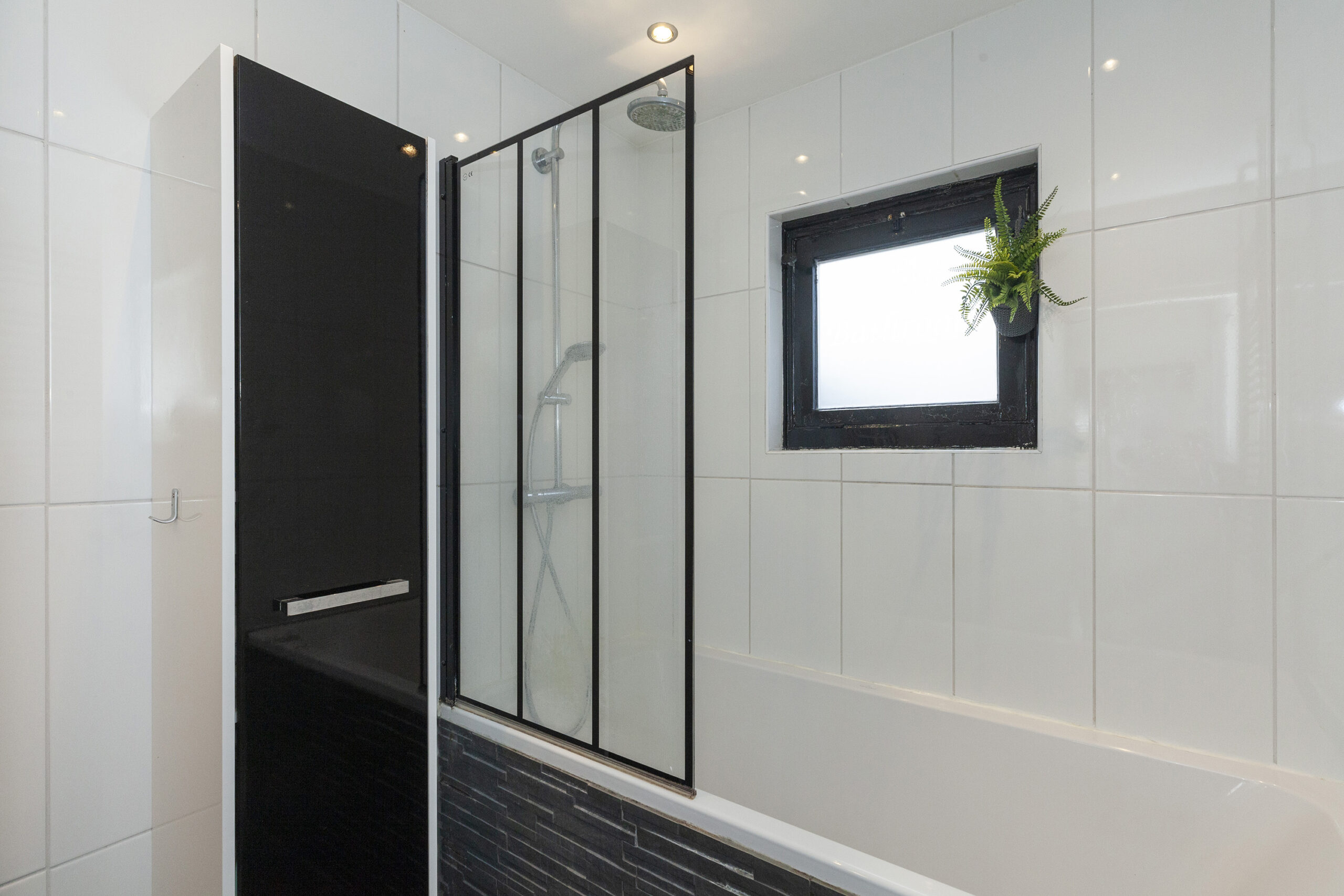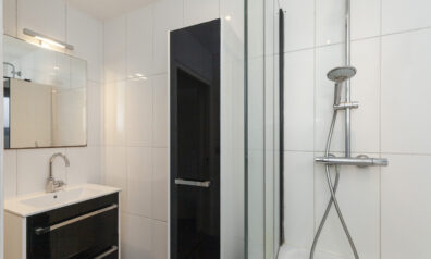 De badkamer is keurig netjes en strak afgewerkt. Er is een ligbad met een regen- en handdouche, designradiator en een wastafelmeubel.