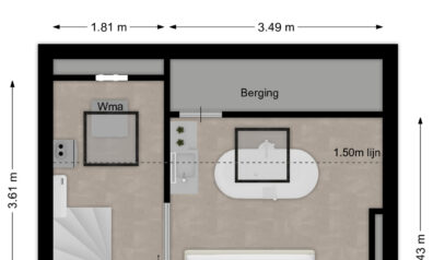 De toiletruimte is onder de trap gevestigd en voorzien van een vrijhangend closet. Er is mogelijkheid om de toiletruimte te verplaatsen naar de naastgelegen berging.