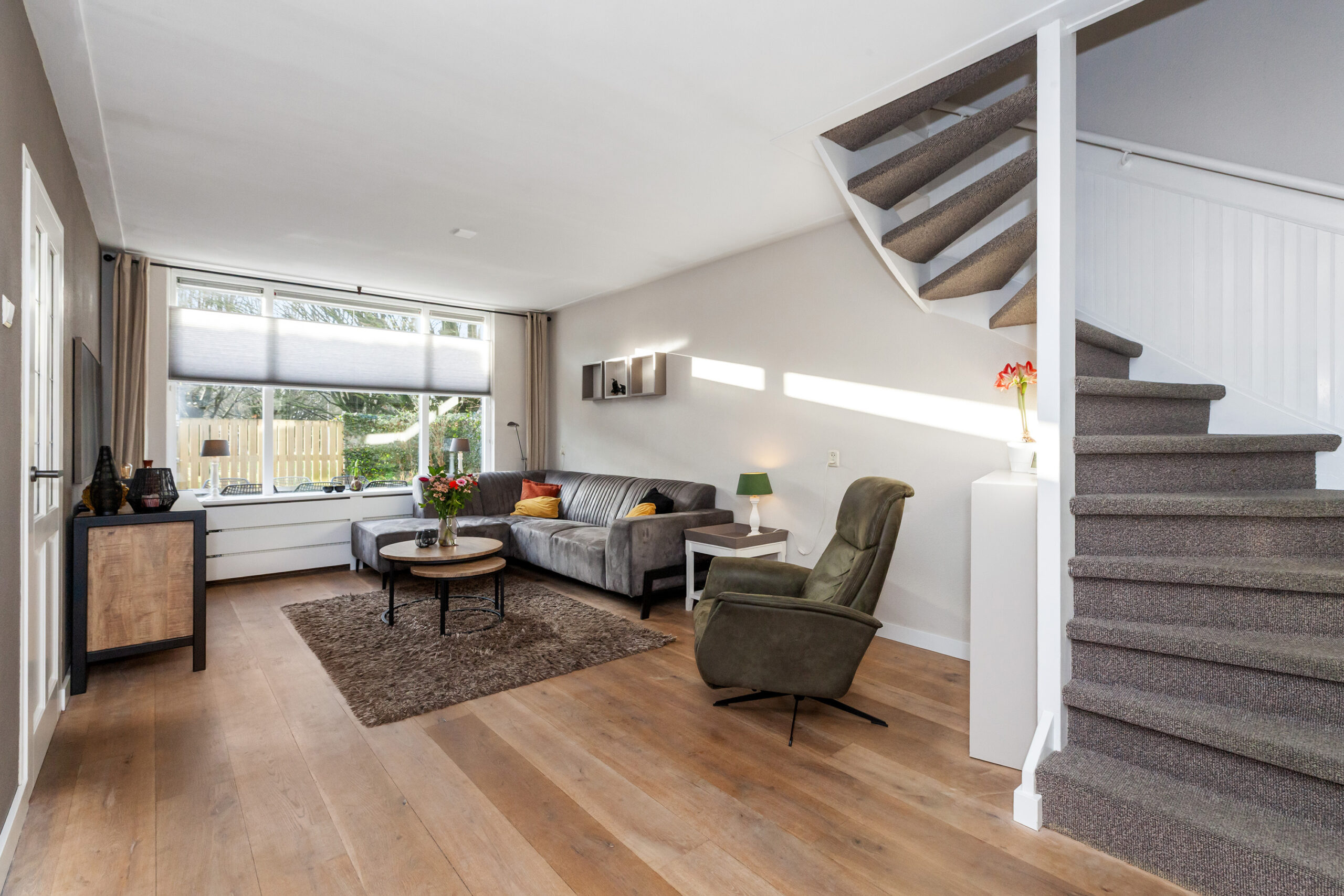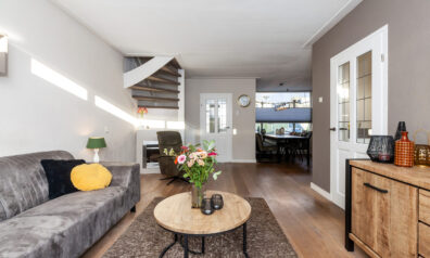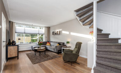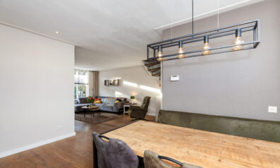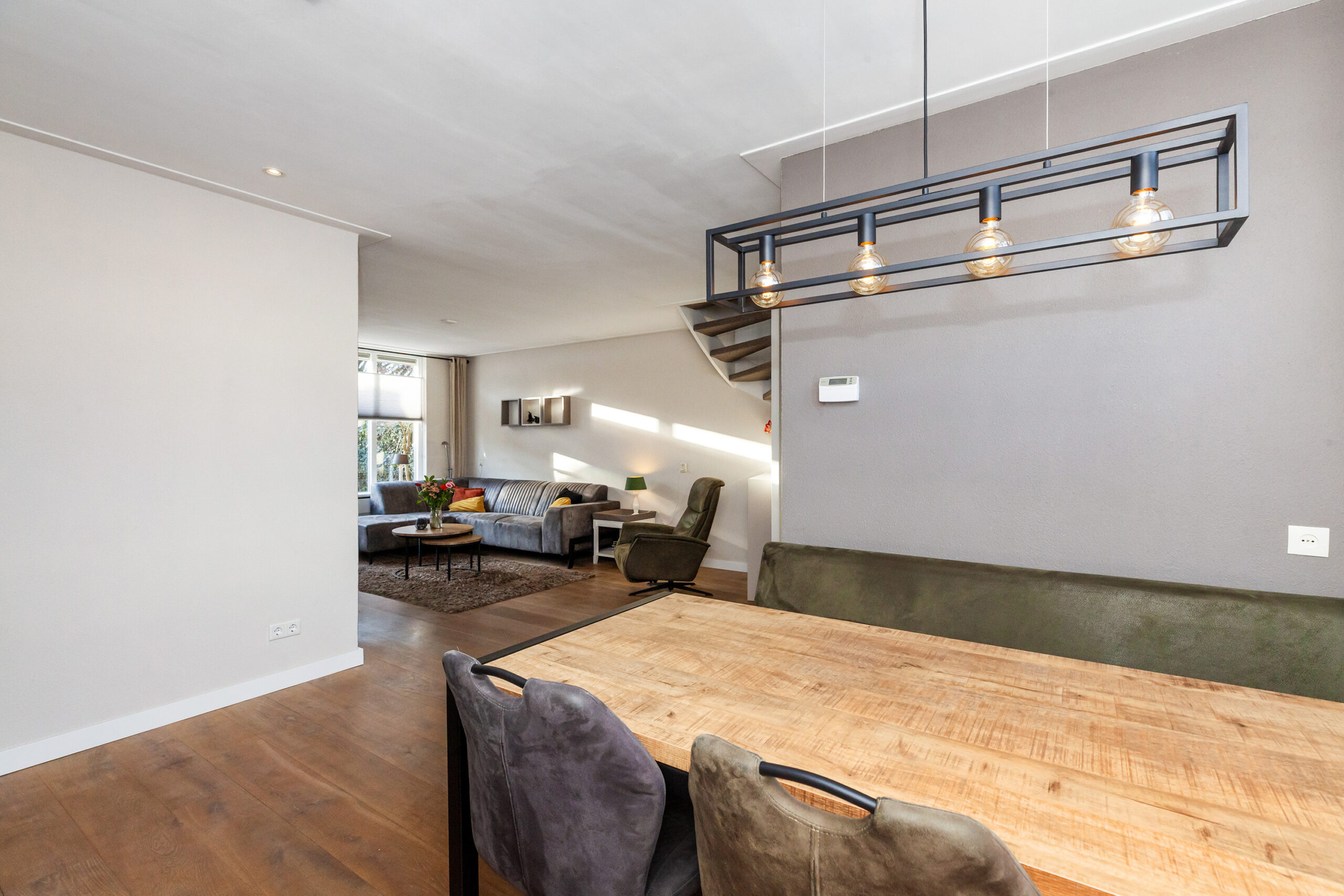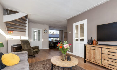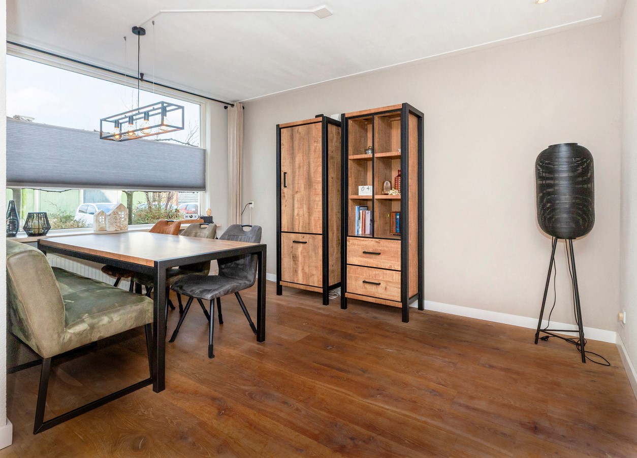 Wat een fijne woonkamer is dit! Door de speelse Z-vormige indeling en de prettige lichtinval krijgt u nog meer het huiselijke gevoel. Momenteel is er aan de voorzijde alle ruimte voor de knusse eethoek en aan de achterzijde is de gezellige zithoek. Neemt u de trap, dan komt u op de eerste verdieping of neemt u de deur naar de keuken.