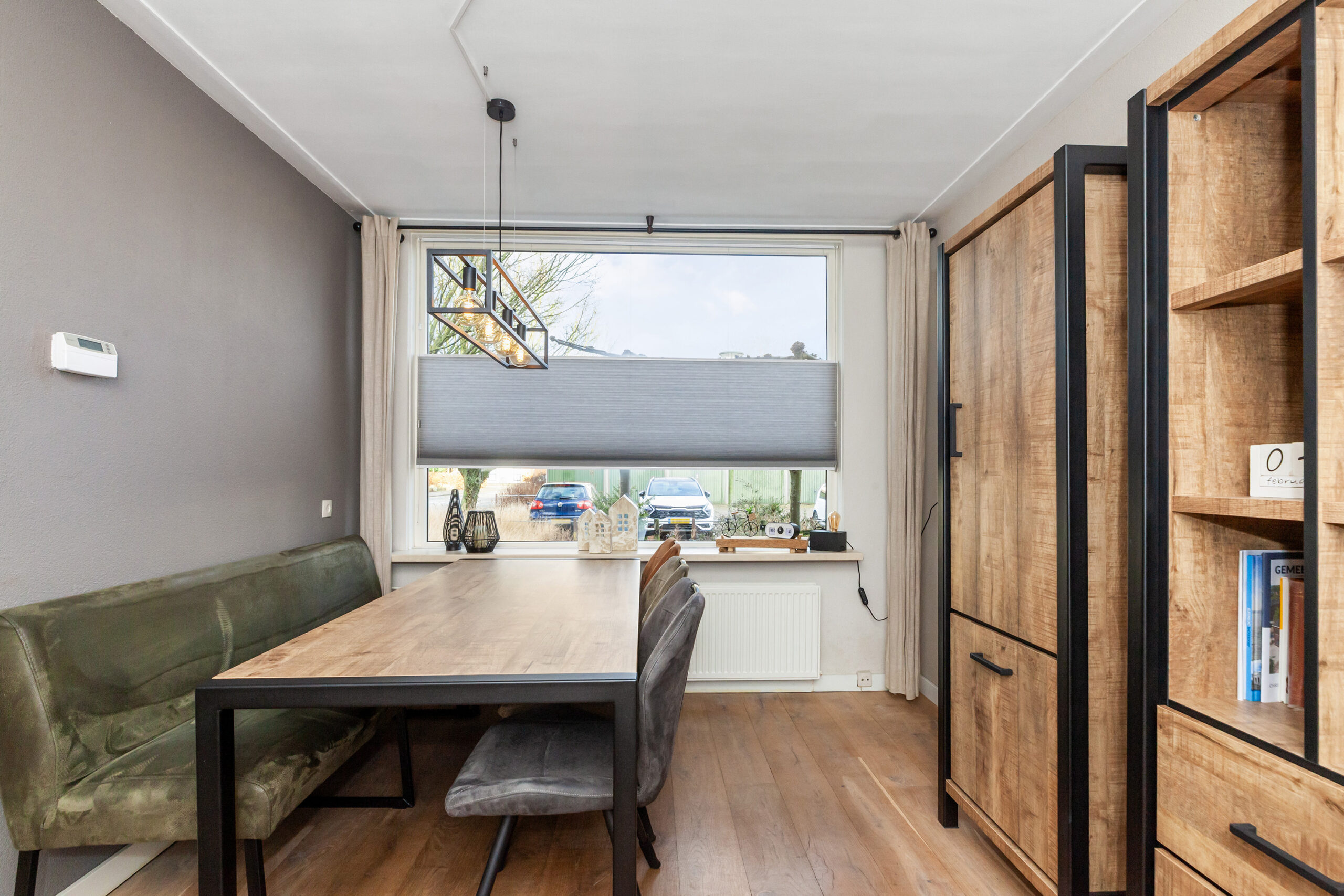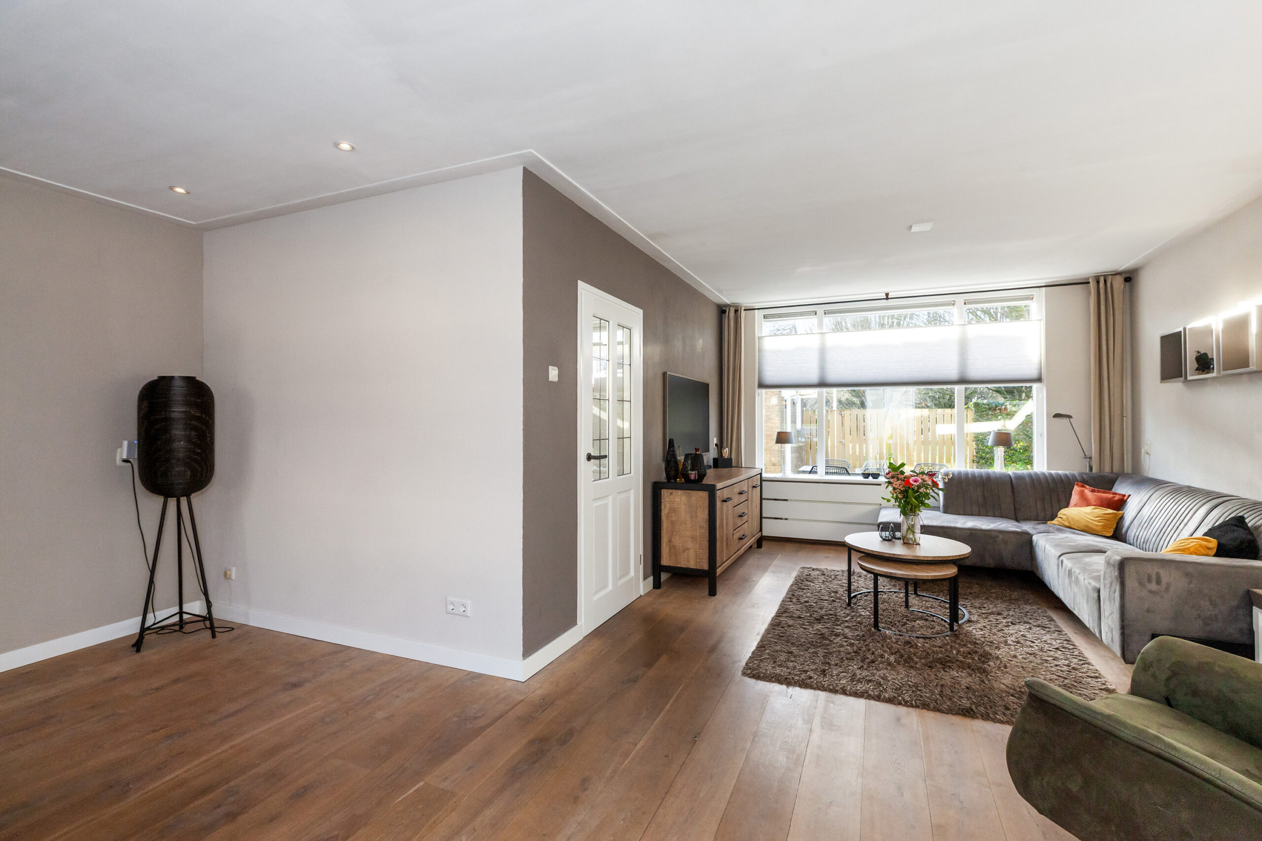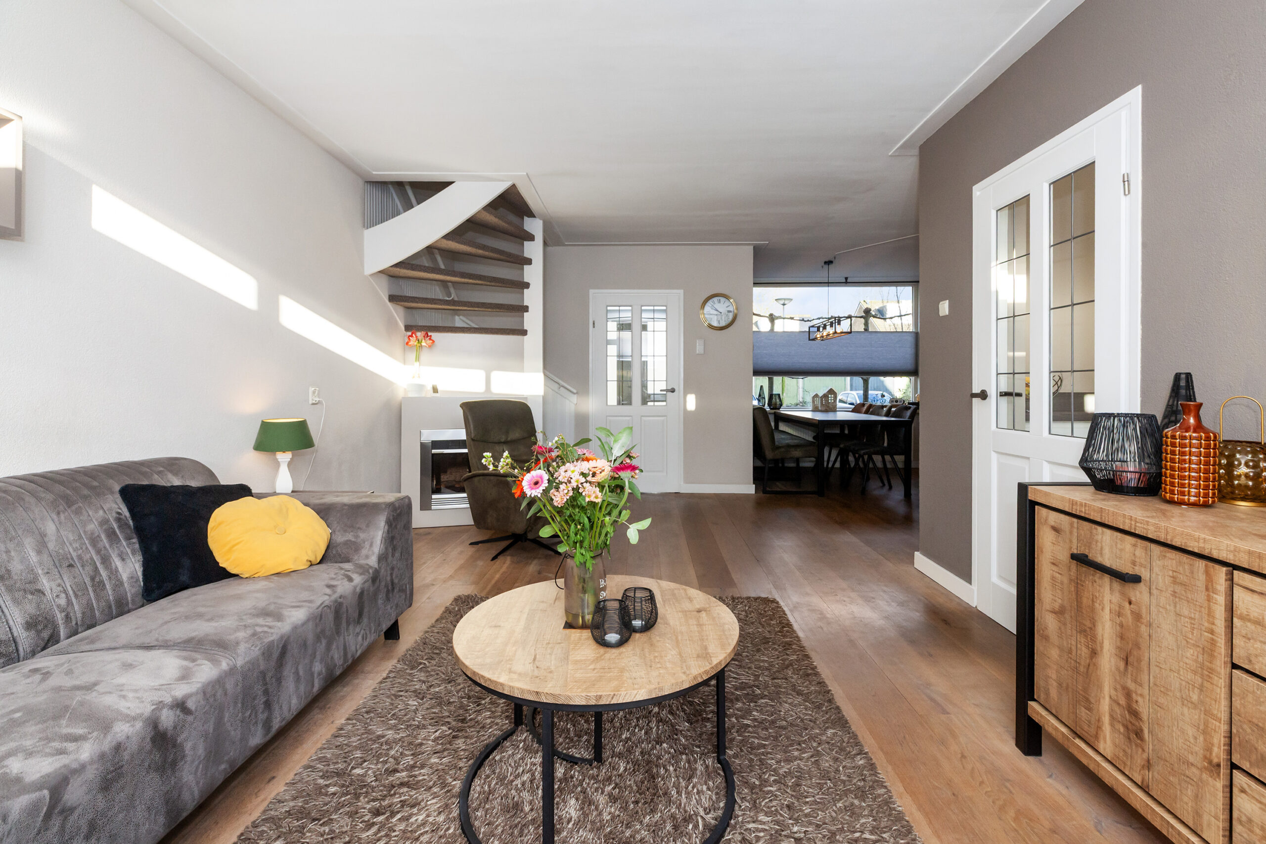 Wat een fijne woonkamer is dit! Door de speelse Z-vormige indeling en de prettige lichtinval krijgt u nog meer het huiselijke gevoel. Momenteel is er aan de voorzijde alle ruimte voor de knusse eethoek en aan de achterzijde is de gezellige zithoek. Neemt u de trap, dan komt u op de eerste verdieping of neemt u de deur naar de keuken.