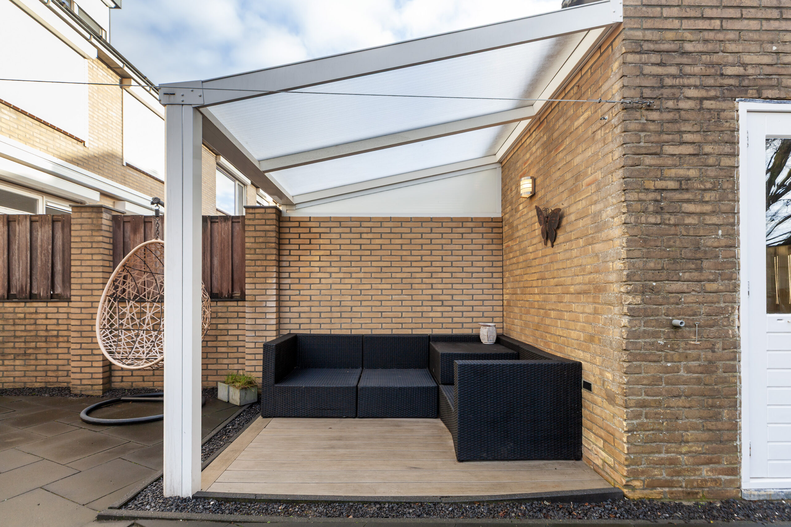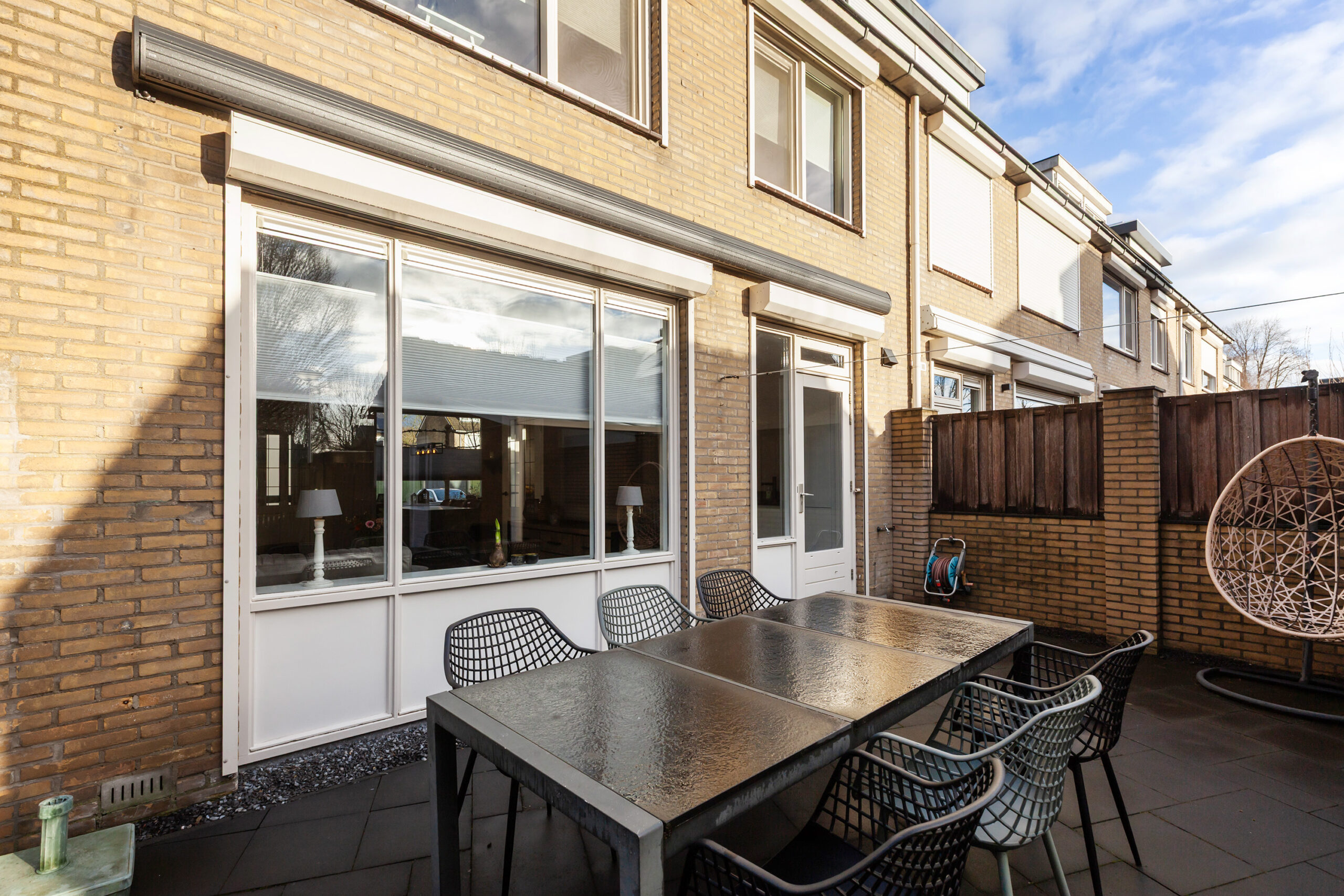 Over de volle breedte van de woning is een elektrisch zonnescherm aanwezig en bij het woonkamerraam en de achterdeur zijn rolluiken geplaatst. Daarnaast beschikt de woning over een ruime stenen berging van circa 3.58 x 2.03m en een bergzolder over de hele breedte. Daarbij is er ook aangrenzende overkapping. Zowel via de zij- als achterzijde is de tuin bereikbaar.