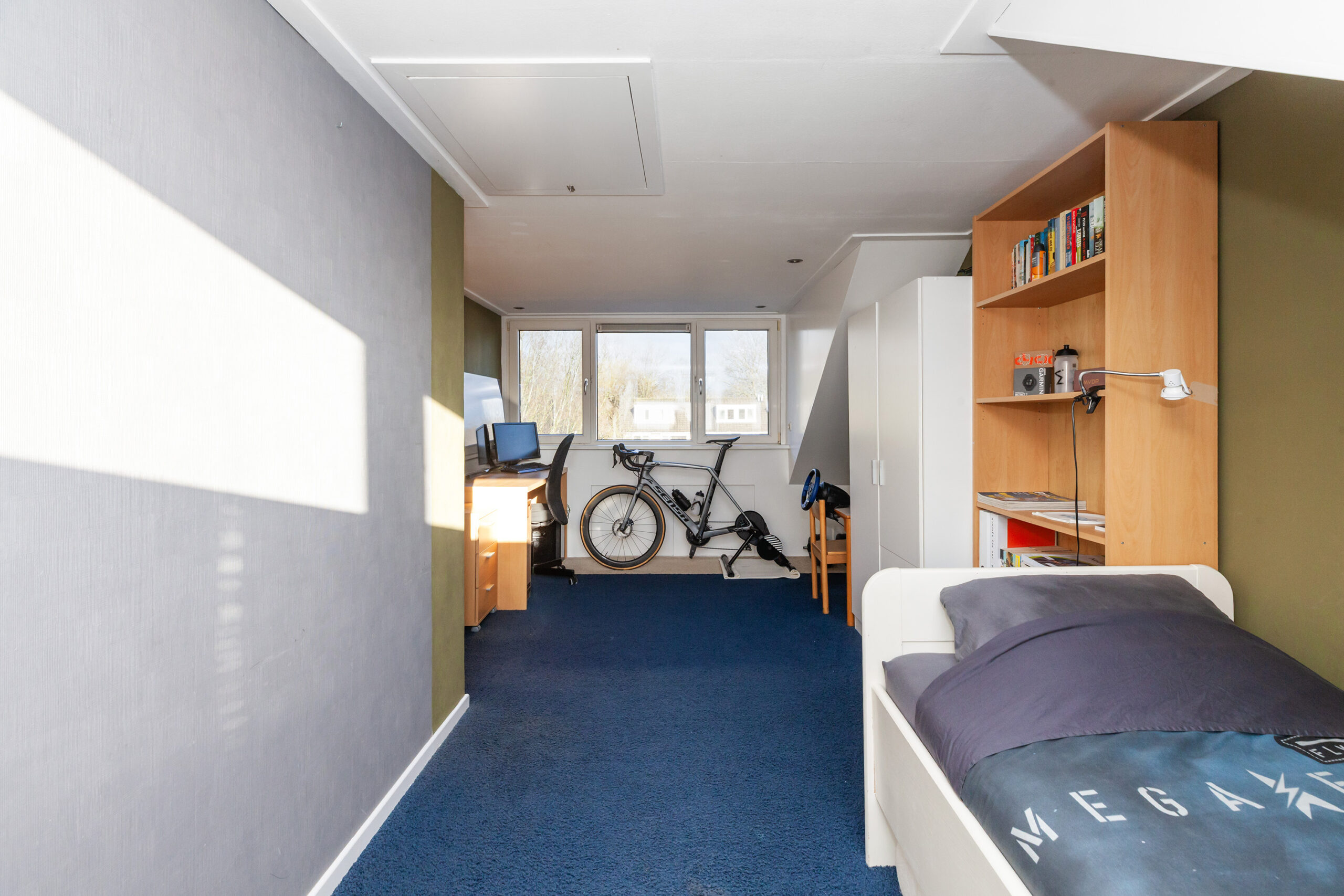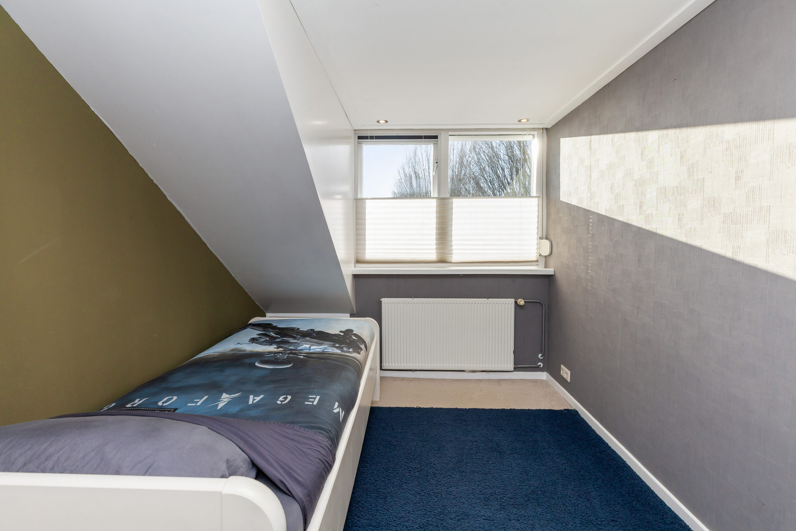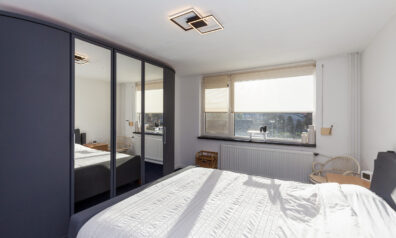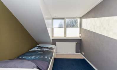 Deze grootste kamer is ruim zes meter diep en biedt extra bergruimte onder de schuine kap, evenals toegang tot een kleine bergzolder. De dakkapel aan de voorzijde is uitgevoerd met kunststof kozijnen en een elektrisch rolluik. Aan de achterzijde is eveneens een dakkapel aanwezig met handbediend rolluik.