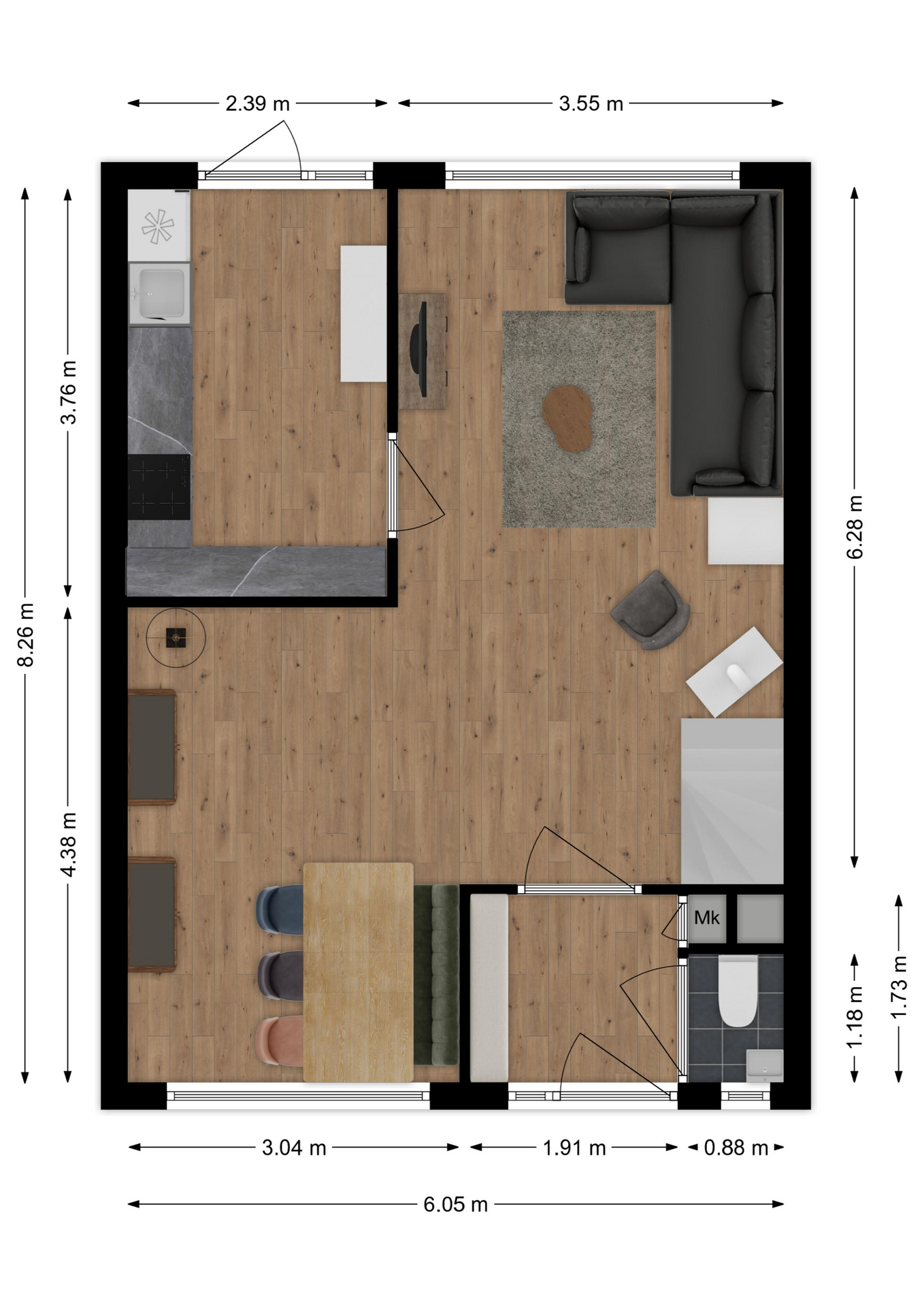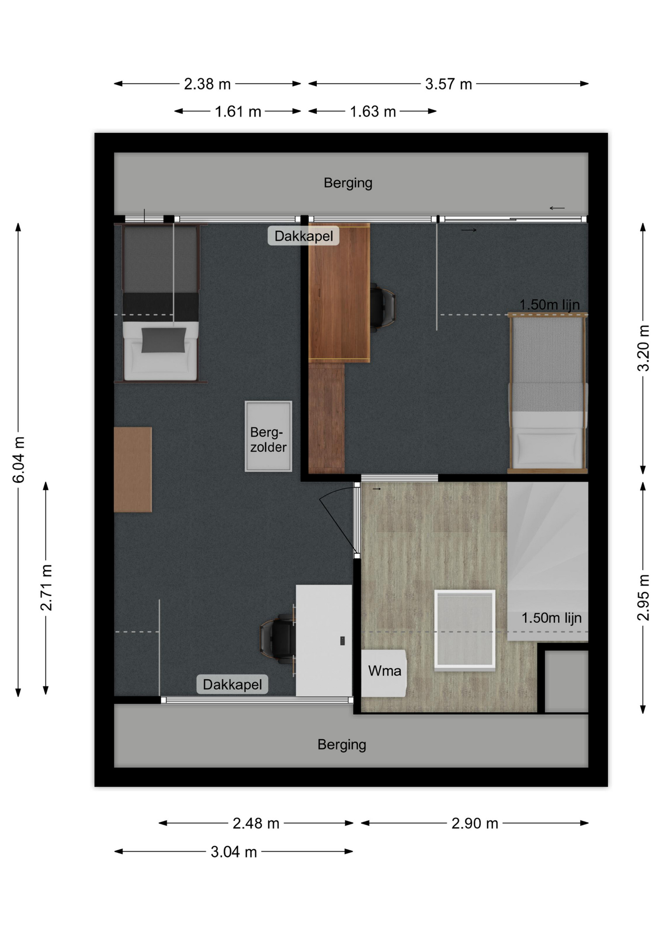 Maatvoering: Circa 6.04 x 3.04/2.38m