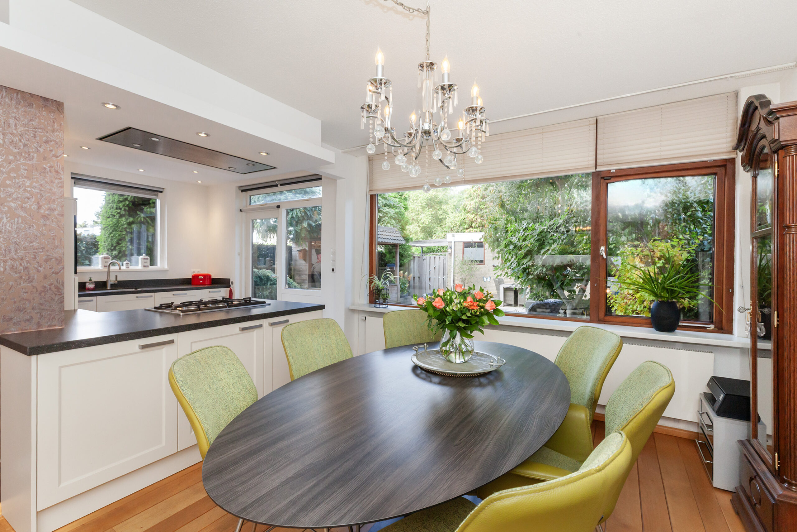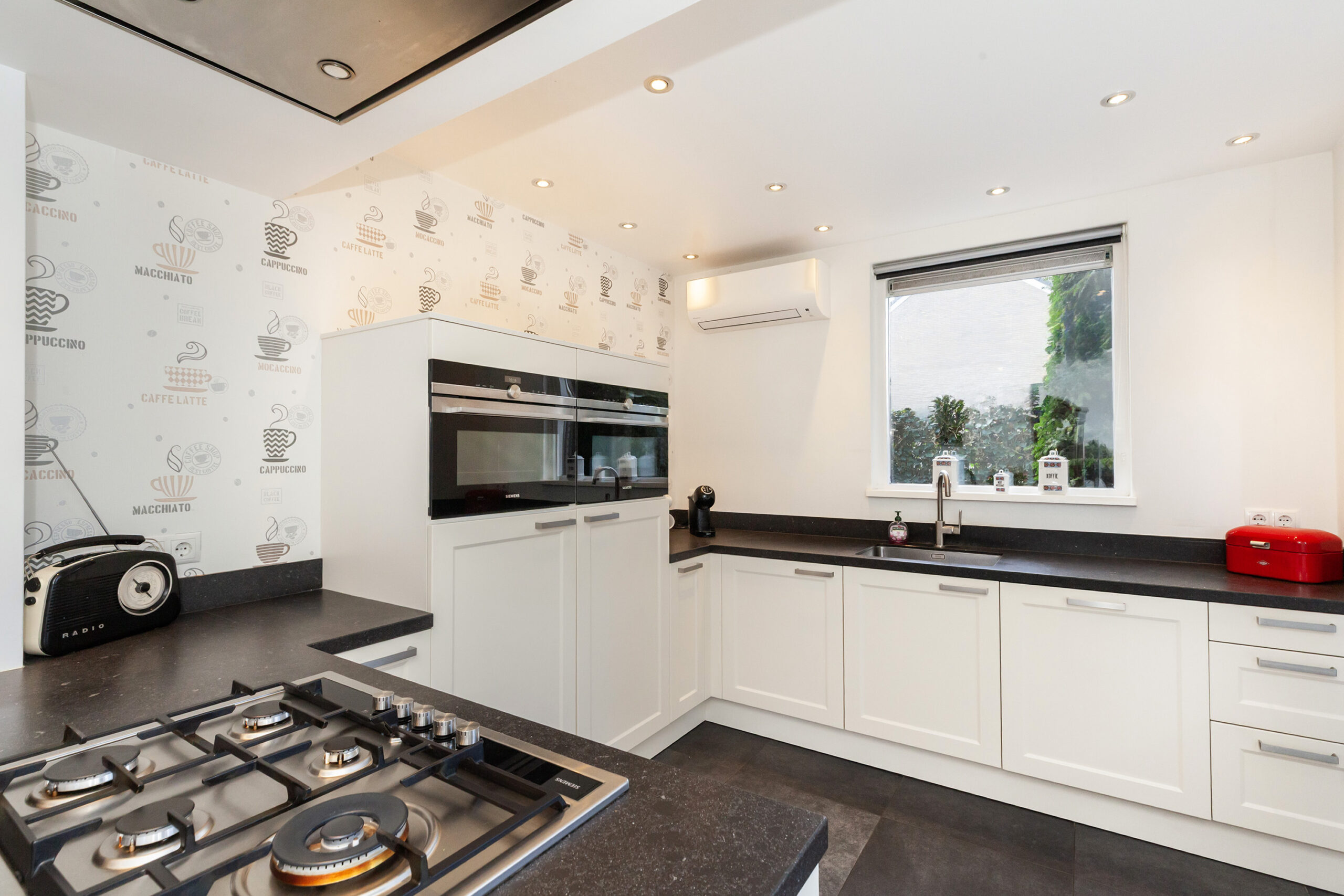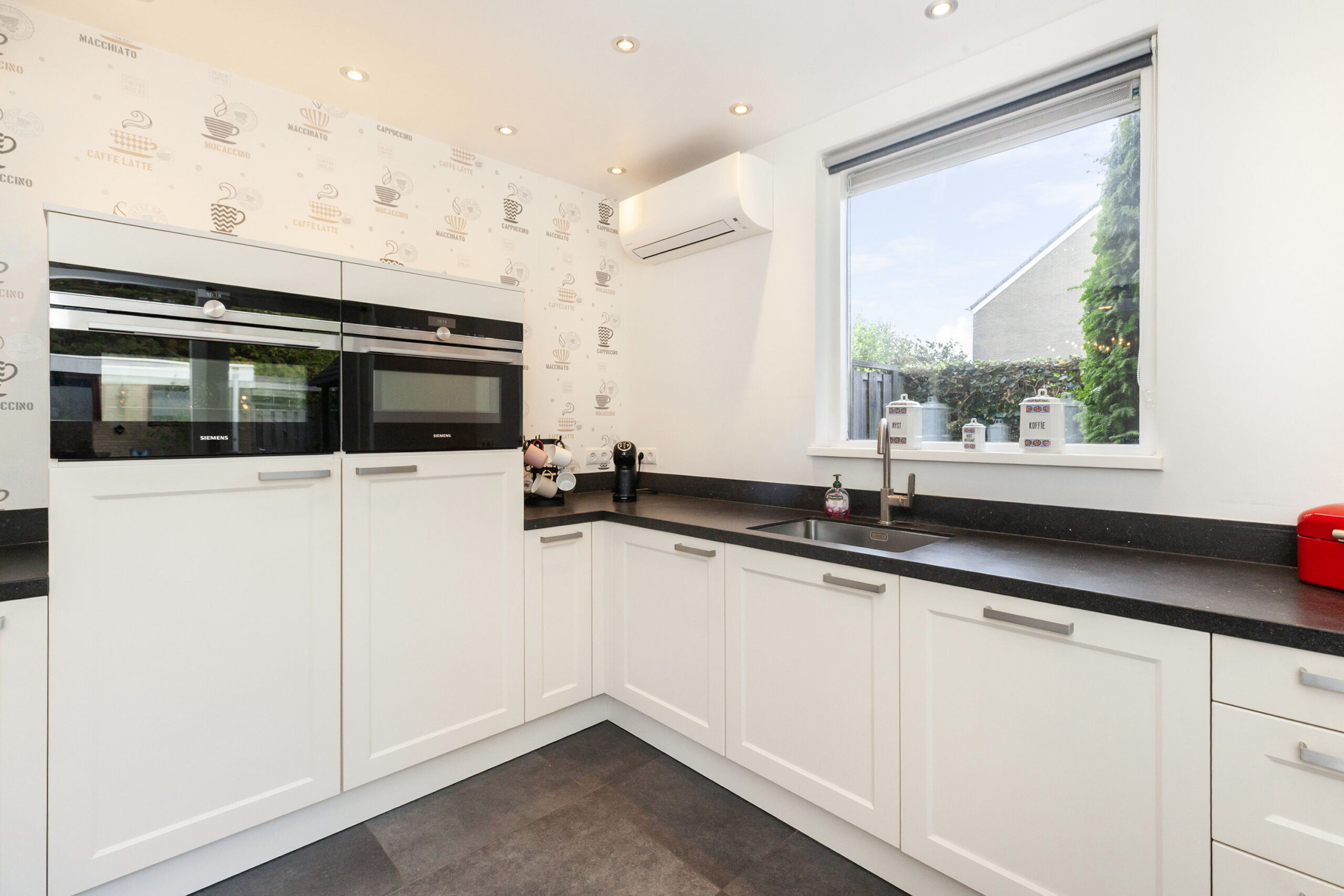 De keuken is aan de achterzijde gesitueerd. Door de extra ramen in de zijgevel, geniet u van de zon in huis de gehele dag door, zo ook in deze fijne keuken! Aan de U-opstelling heeft u volop werkruimte aan het aanrechtblad en daarbij heeft u ook veel keukenkastjes met een Le Man kast. Aan keukenapparatuur is er de beschikking over een 5-pits gaskookplaat, afzuigkap, vaatwasser, combi-oven, oven en koelkast. Verder is er een airco en heeft u vloerverwarming.