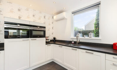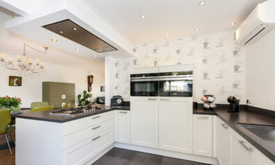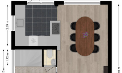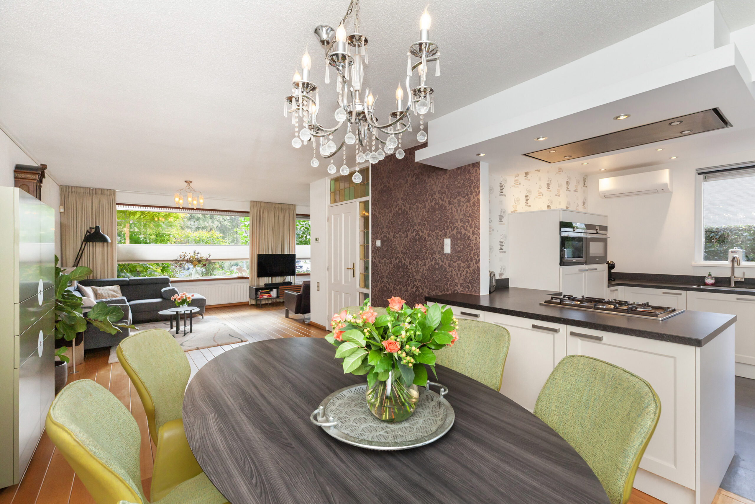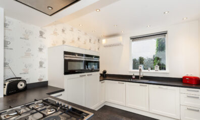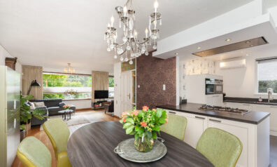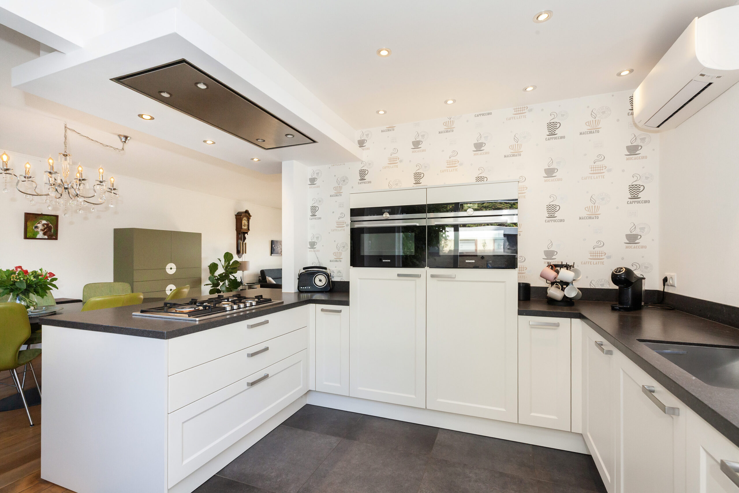 De keuken is aan de achterzijde gesitueerd. Door de extra ramen in de zijgevel, geniet u van de zon in huis de gehele dag door, zo ook in deze fijne keuken! Aan de U-opstelling heeft u volop werkruimte aan het aanrechtblad en daarbij heeft u ook veel keukenkastjes met een Le Man kast. Aan keukenapparatuur is er de beschikking over een 5-pits gaskookplaat, afzuigkap, vaatwasser, combi-oven, oven en koelkast. Verder is er een airco en heeft u vloerverwarming.