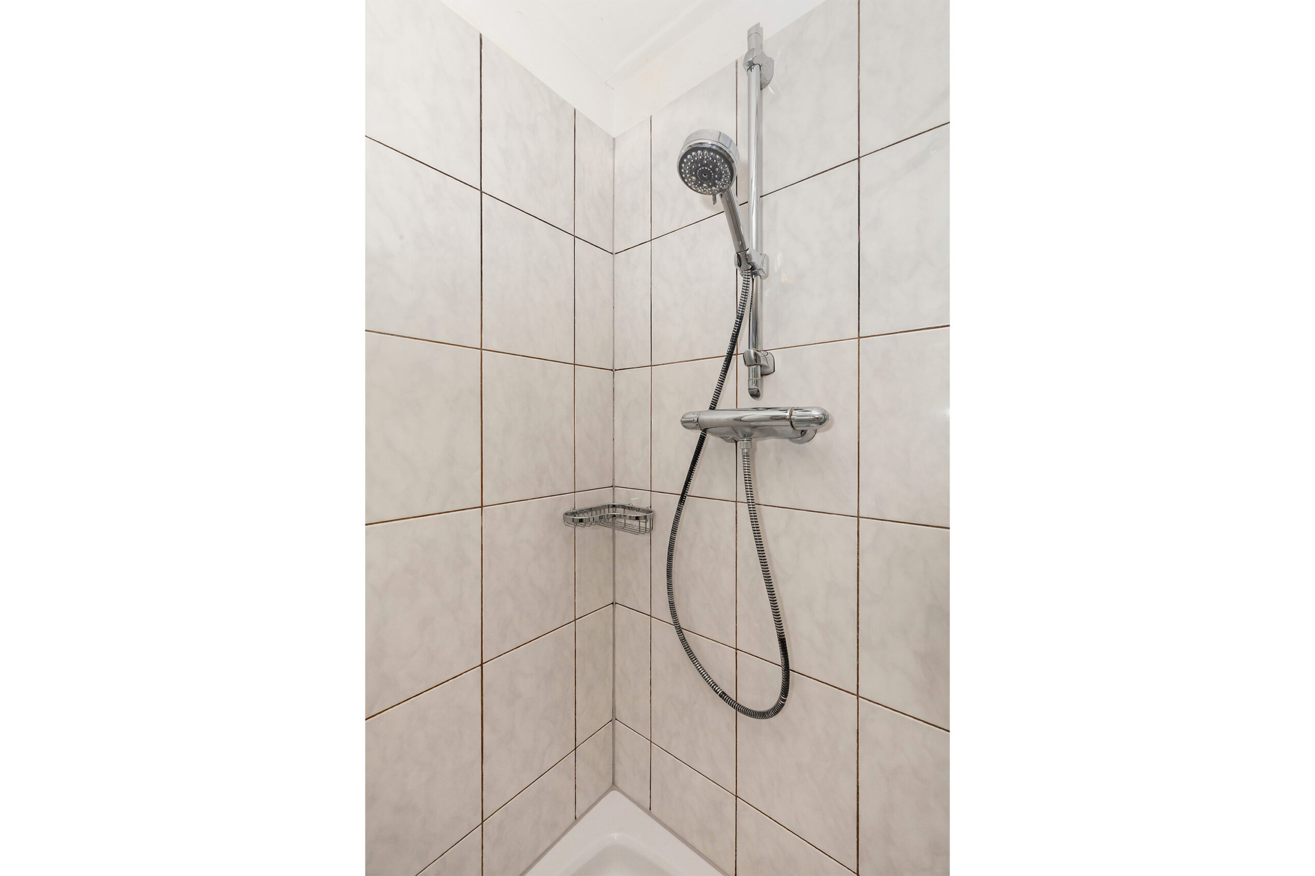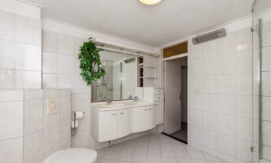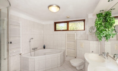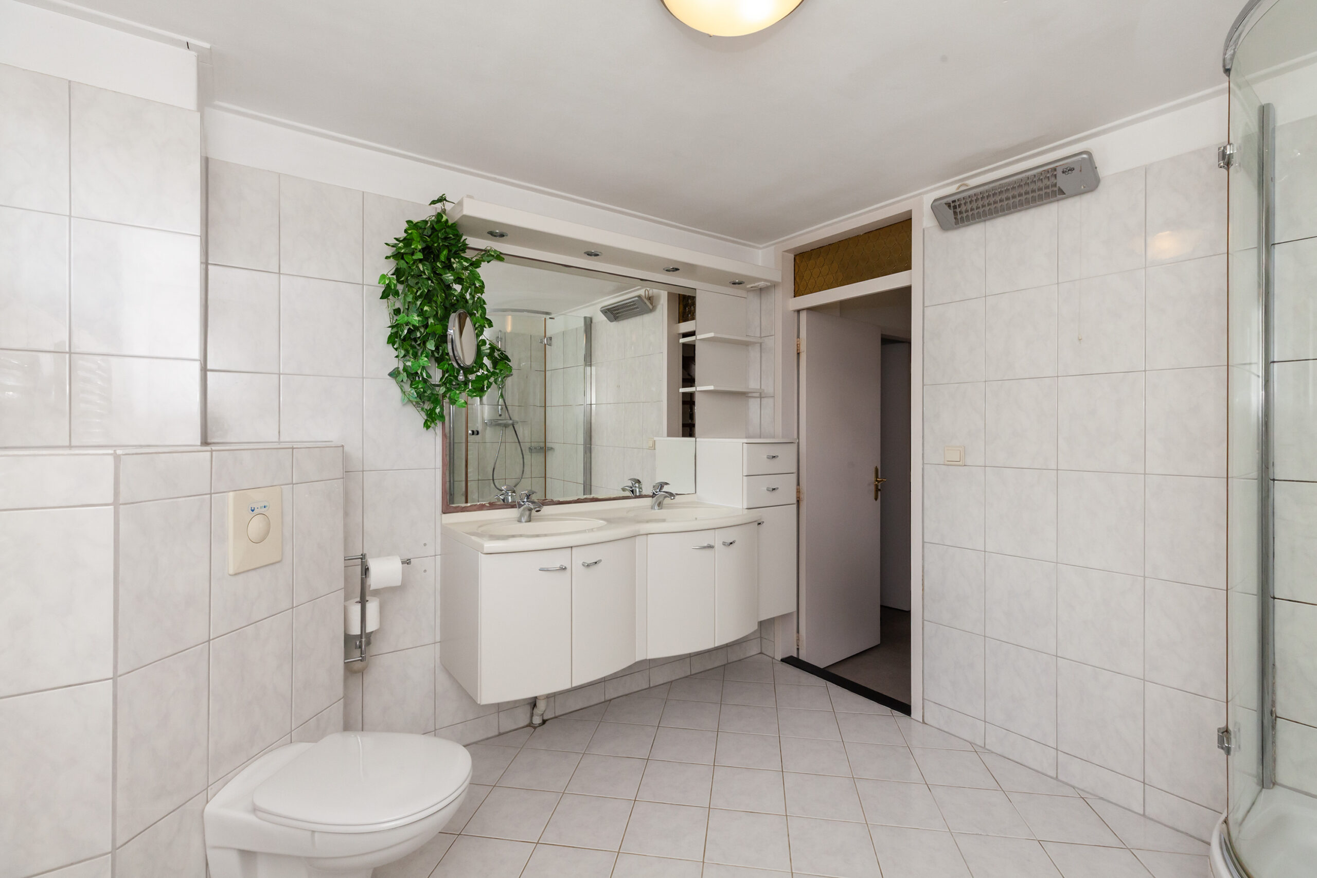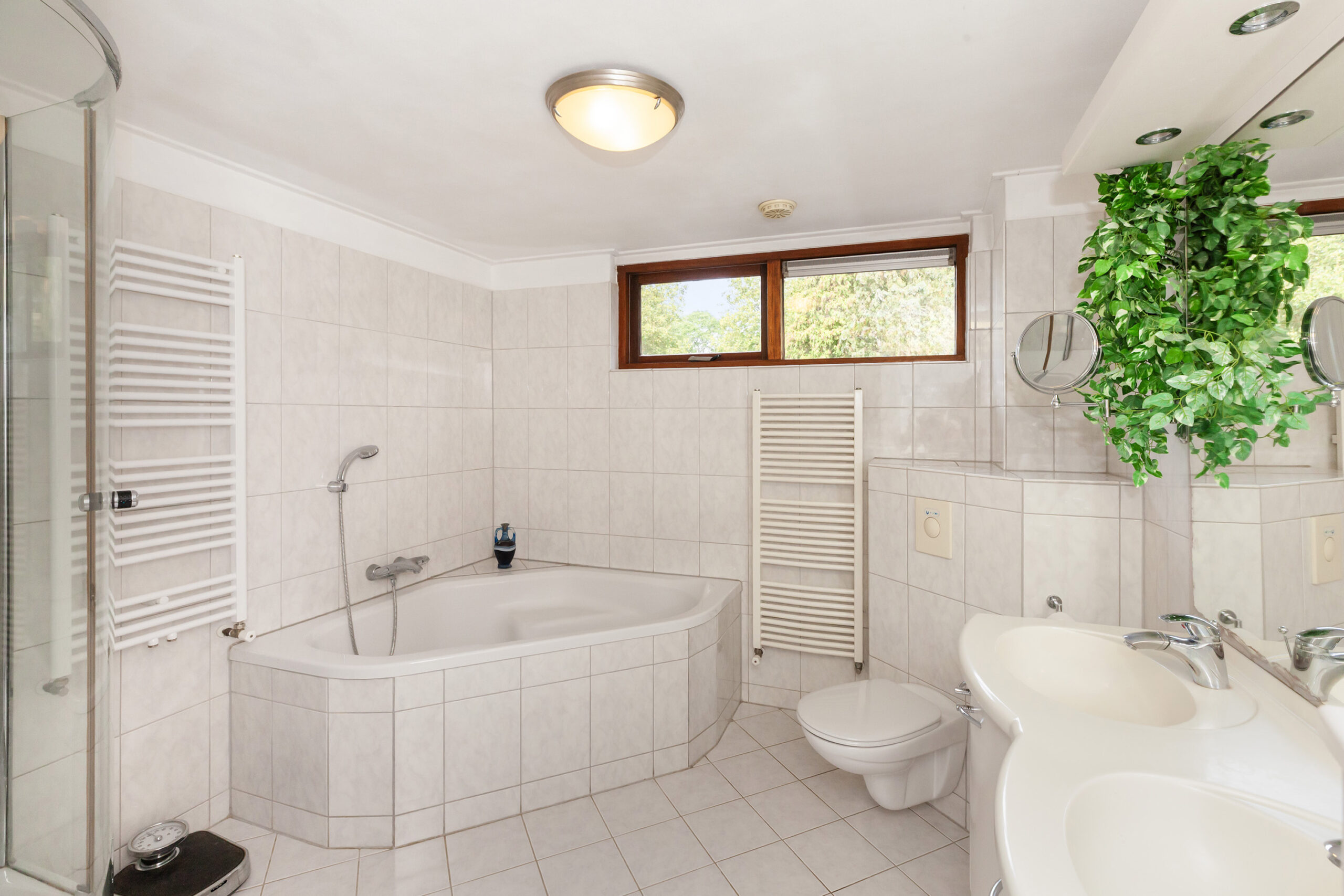 De badkamer is voorzien van alle gemakken. Zo is er een hoekbad, douche, dubbel wastafelmeubel, designradiator en een toilet. Het geheel is afgewerkt in lichte kleurstelling.