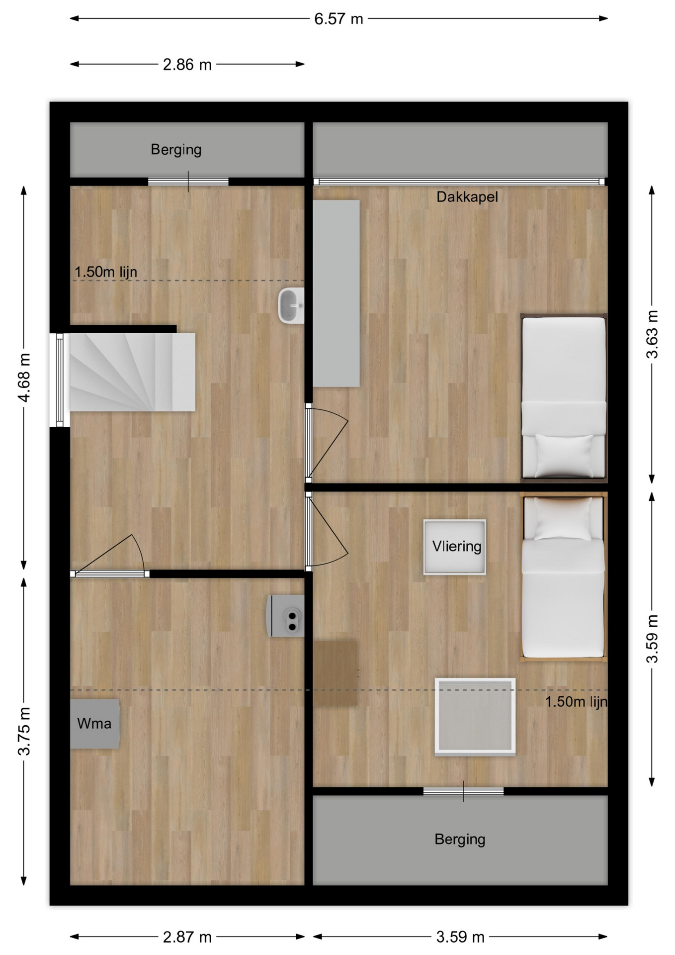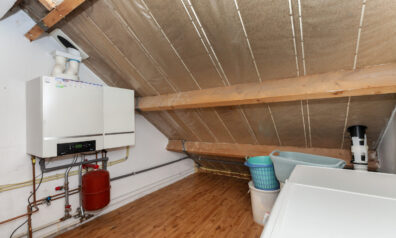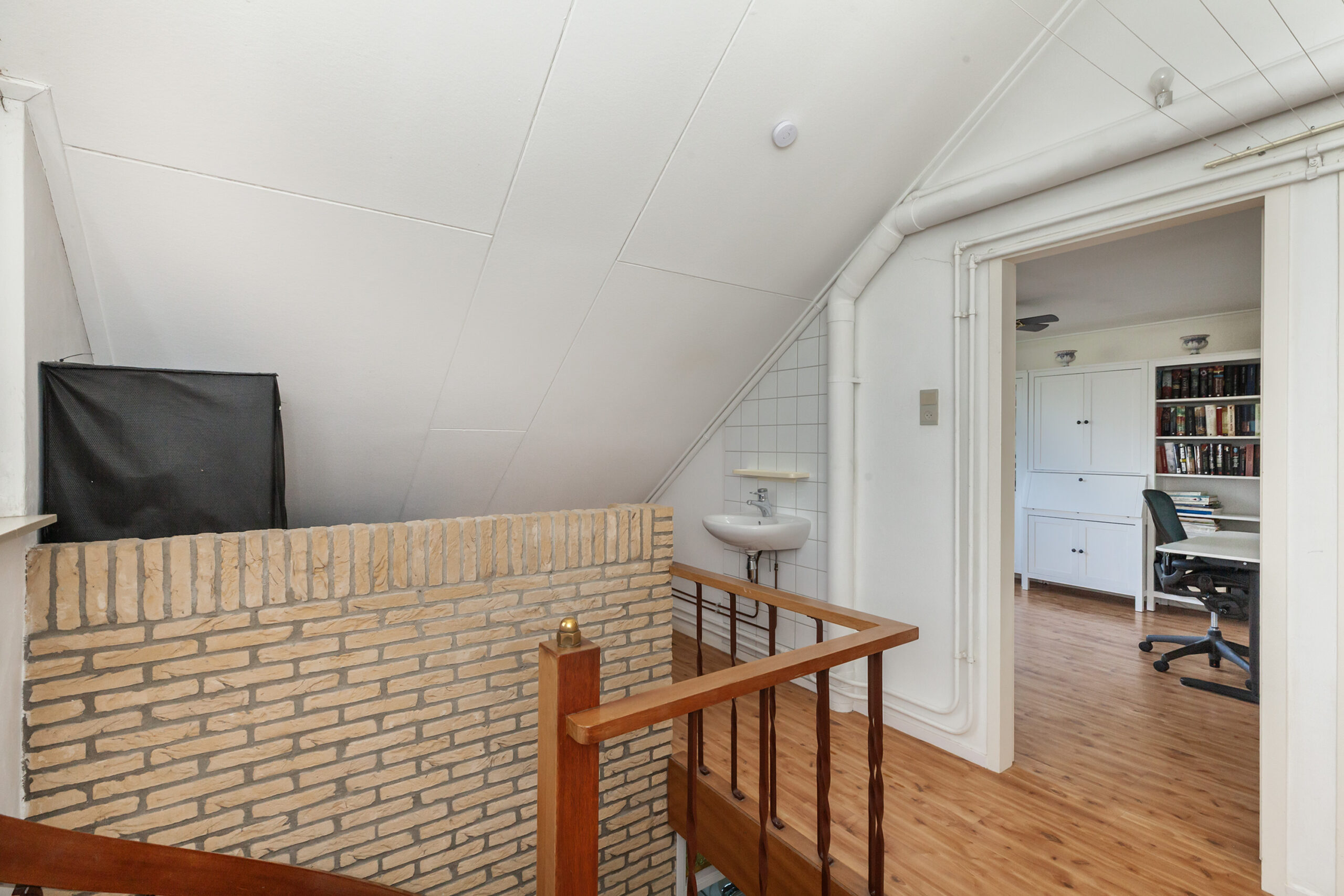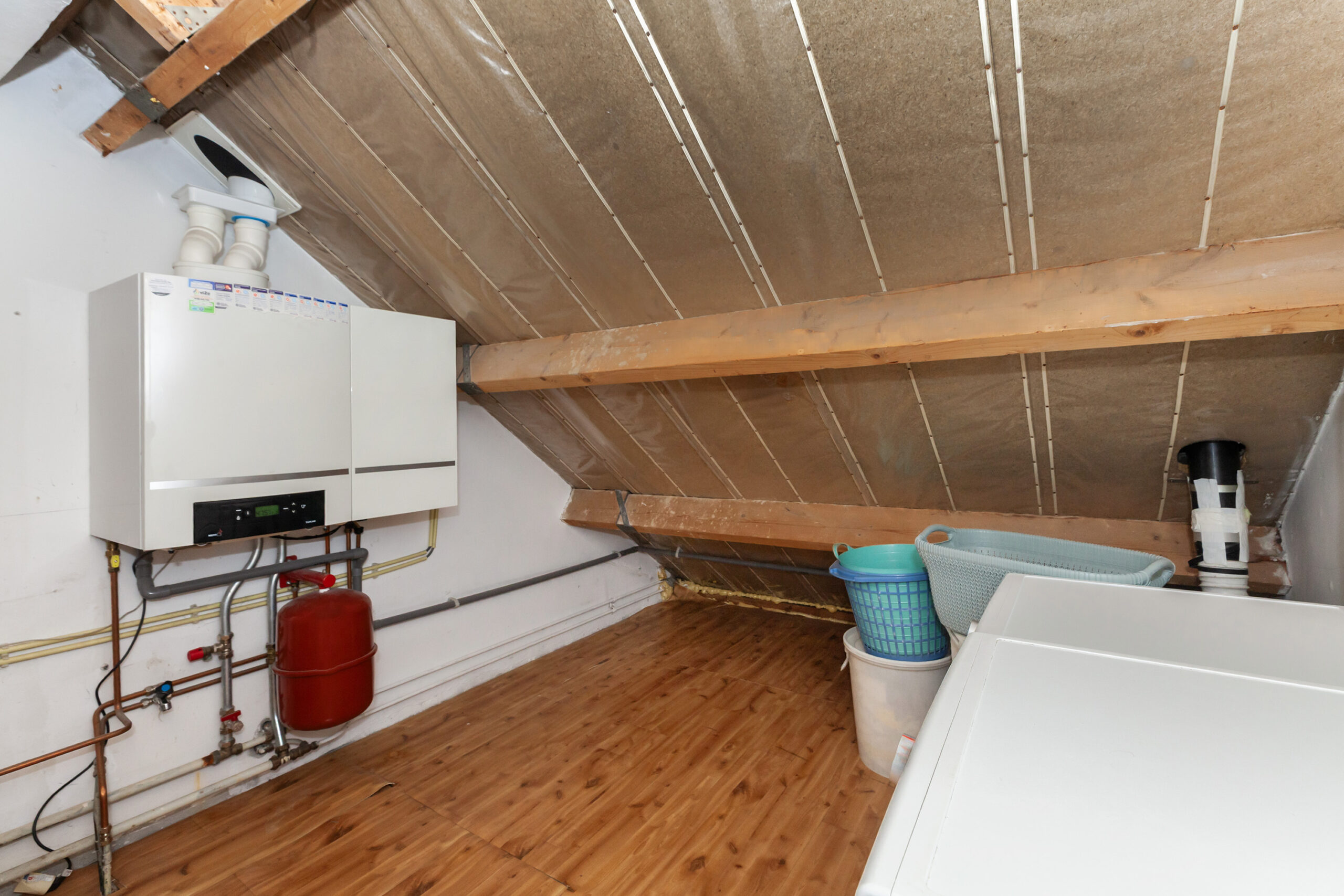 Op de ruime overloop heeft u toegang tot de inloopberging van circa 2.87 x 3.75m met daarin de aansluitingen voor uw wasapparatuur en de opstelling van de C.V.-ketel. Verder is er toegang tot de twee slaapkamers en is er een wastafel op de overloop. Achter de knieschotten is er opbergruimte.