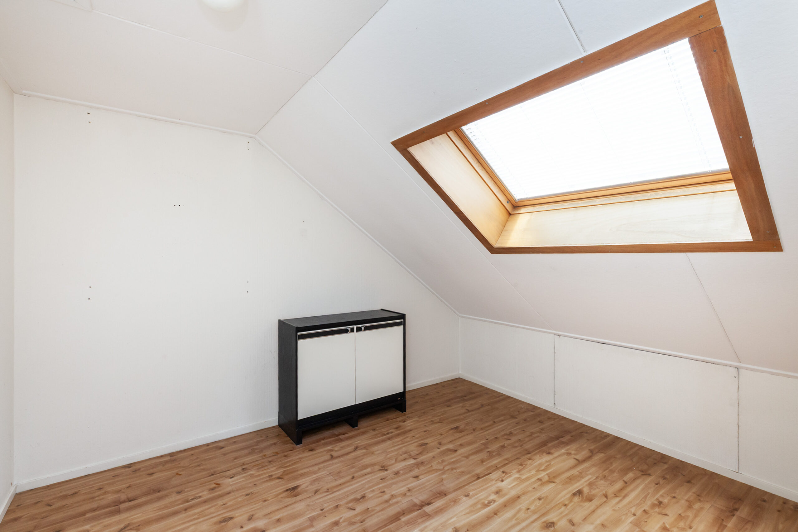 Deze slaapkamer treft u aan de voorzijde en voorzien van een tuimelraam. Onder het schuine dak is er opbergruimte en tevens is er een vliering boven de twee slaapkamers, bereikbaar via het luik.