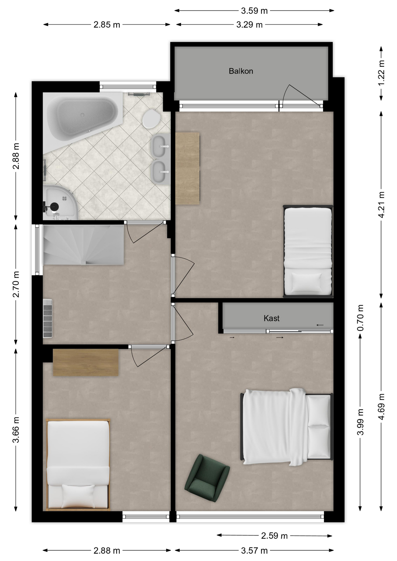 Vanaf de overloop zijn alle vertrekken toegankelijk. Tevens is er een airco waar u op de gehele verdieping plezier van heeft.