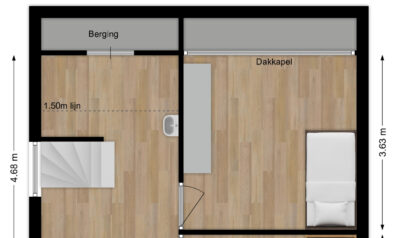 Door de dakkapel over de volle breedte van deze slaapkamer, is dit een praktische slaapkamer welke u ook goed kunt gebruiken als werk- of hobbyruimte bijvoorbeeld!