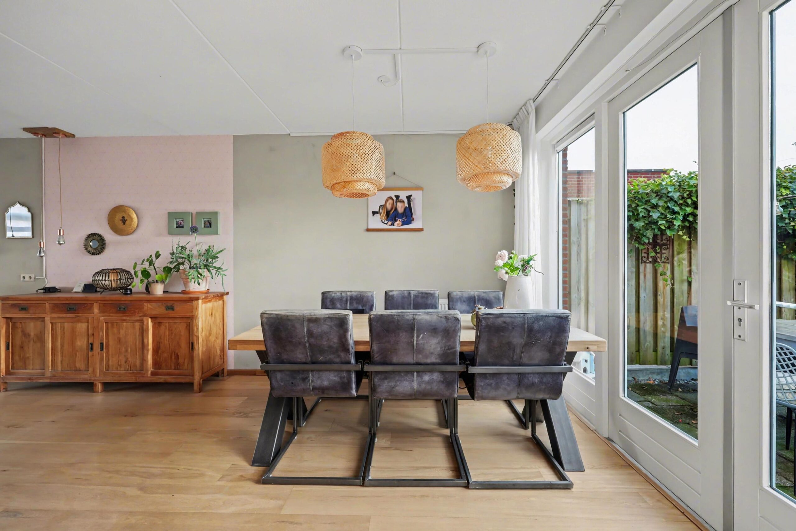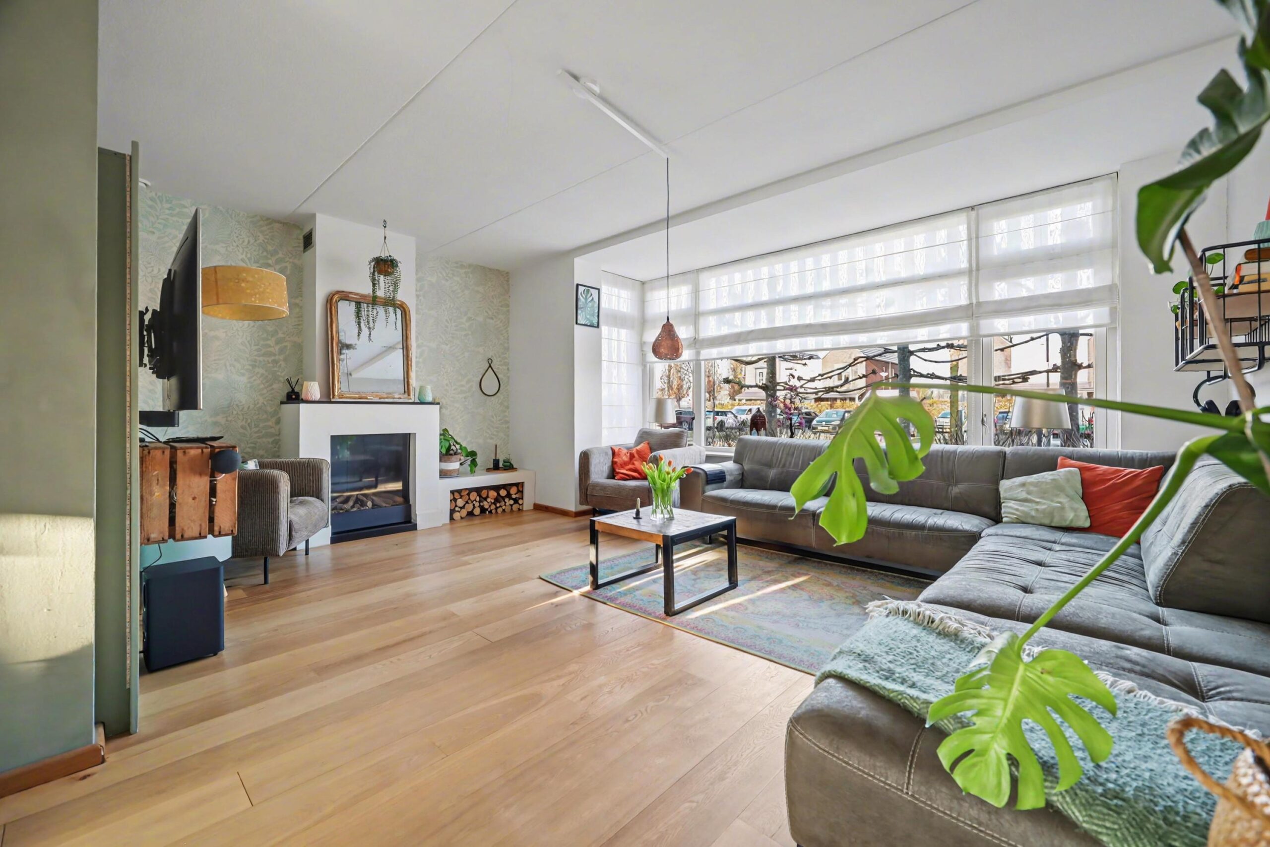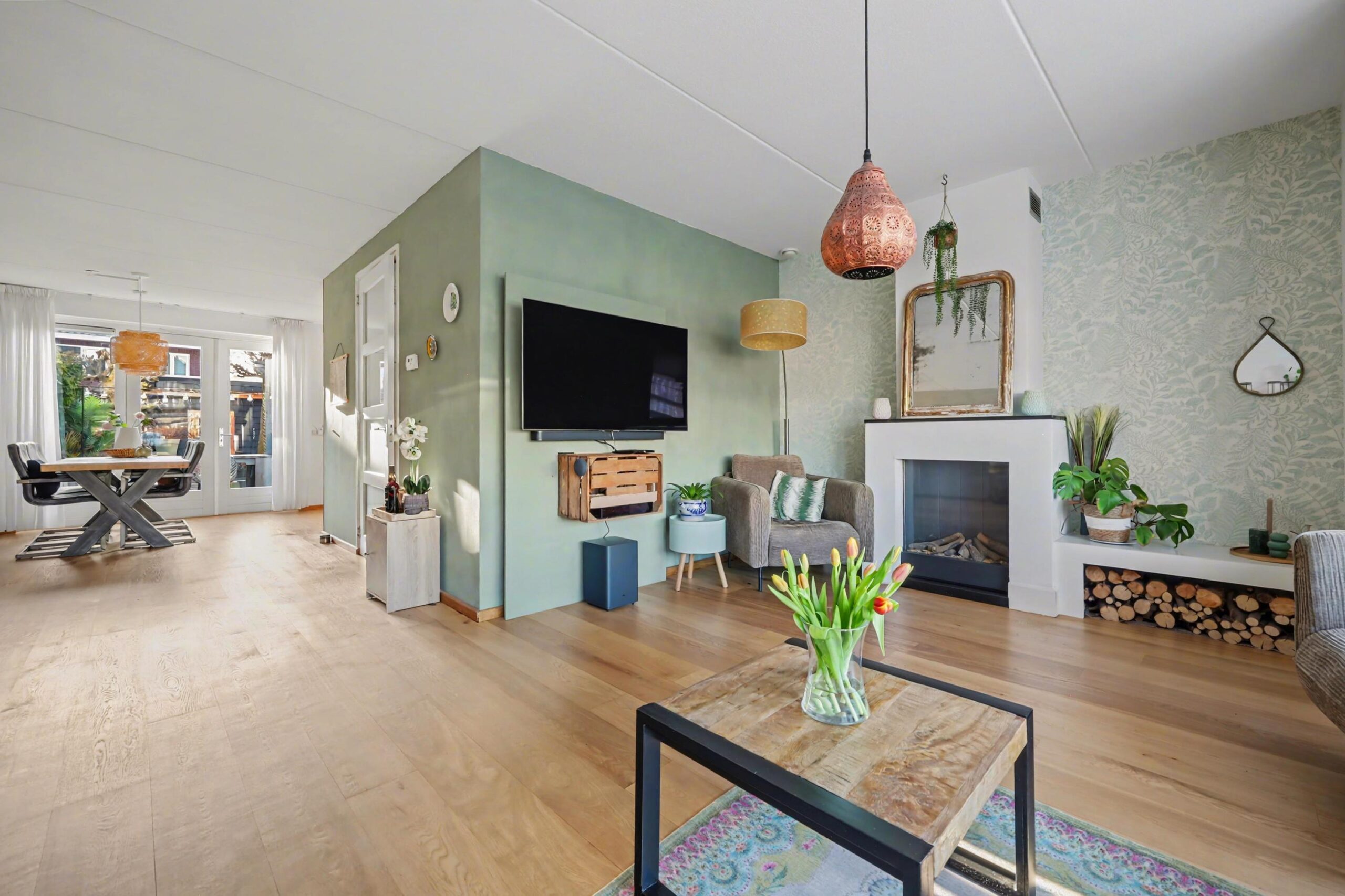 U stapt binnen in deze heerlijke woonkamer. Aan de voorzijde is de zithoek gegroepeerd rondom de gashaard. De karakteristieke erker laat het zonlicht rijkelijk binnen komen en deze plek vormt dan ook de plaats om samen te komen en te genieten. Achter de tv is een meubel geplaatst met sierverlichting. Loopt u naar de achterzijde dan heeft u daar de eethoek en de openslaande deuren naar de tuin. De kamer vloeit moeiteloos over in de keuken.