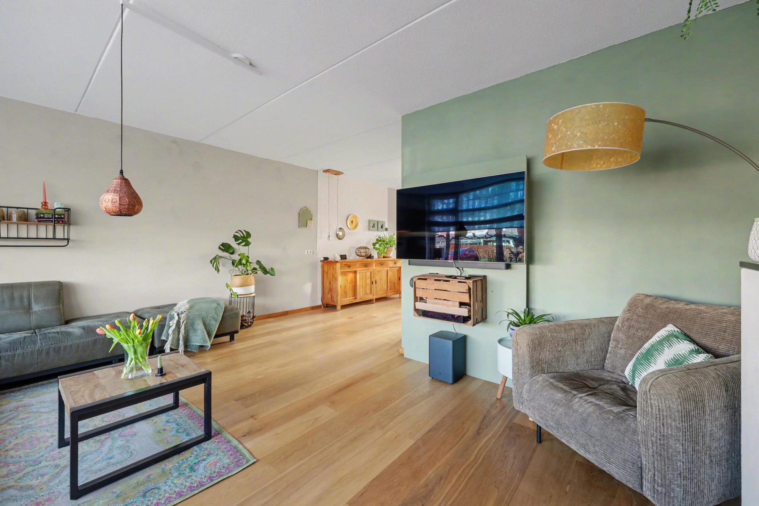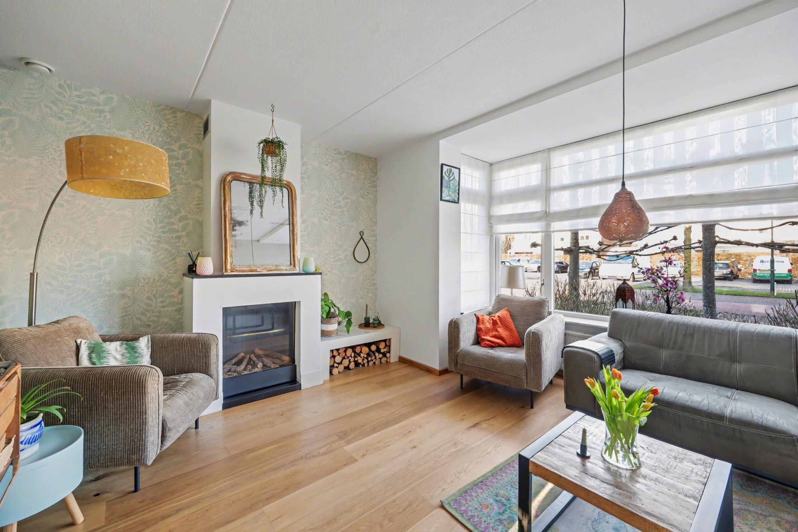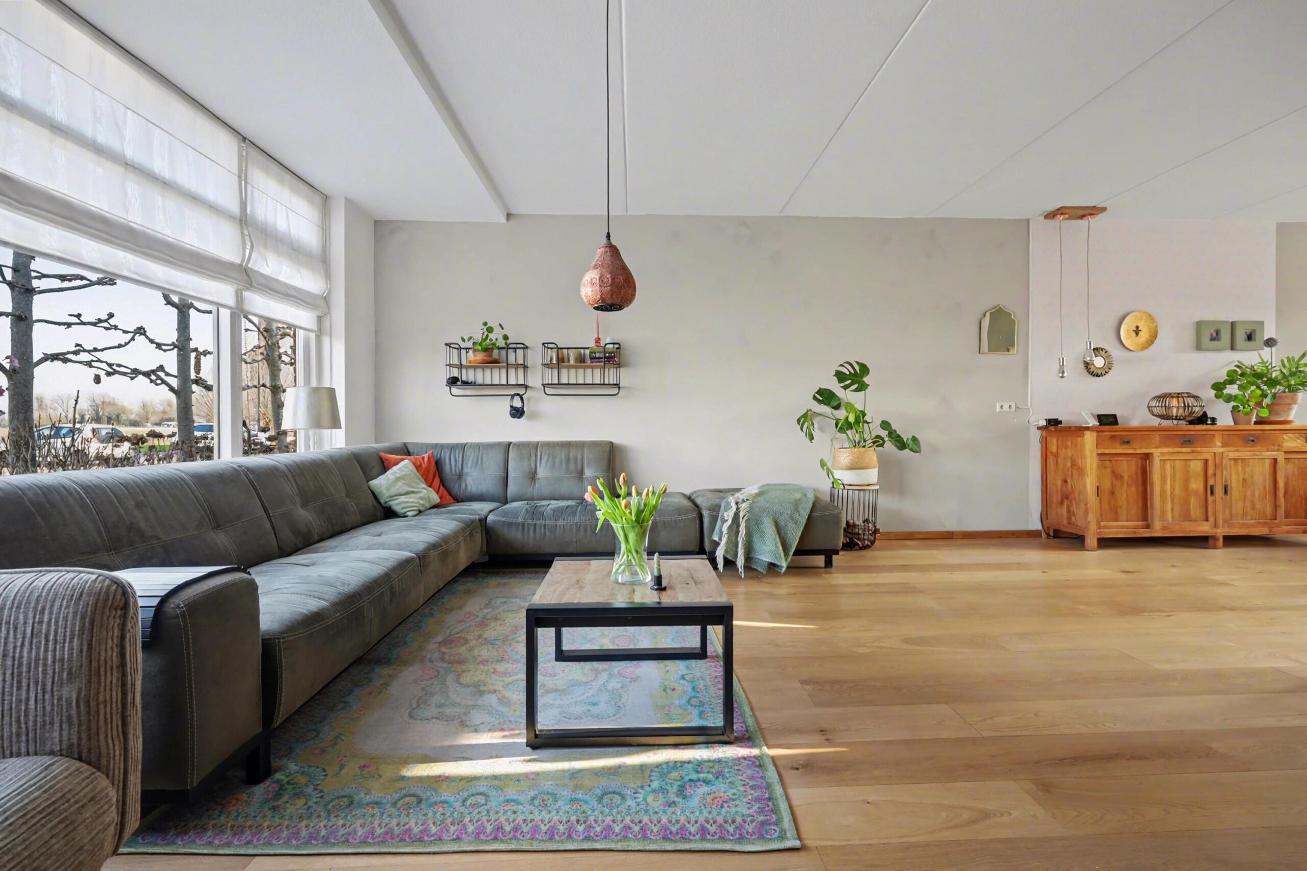 U stapt binnen in deze heerlijke woonkamer. Aan de voorzijde is de zithoek gegroepeerd rondom de gashaard. De karakteristieke erker laat het zonlicht rijkelijk binnen komen en deze plek vormt dan ook de plaats om samen te komen en te genieten. Achter de tv is een meubel geplaatst met sierverlichting. Loopt u naar de achterzijde dan heeft u daar de eethoek en de openslaande deuren naar de tuin. De kamer vloeit moeiteloos over in de keuken.