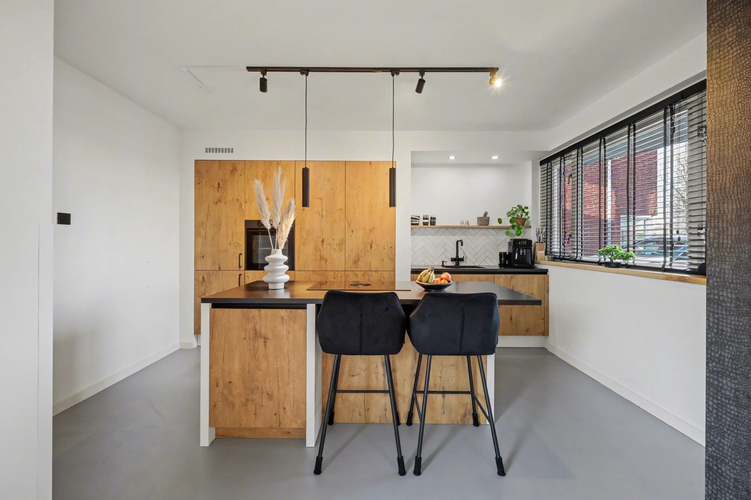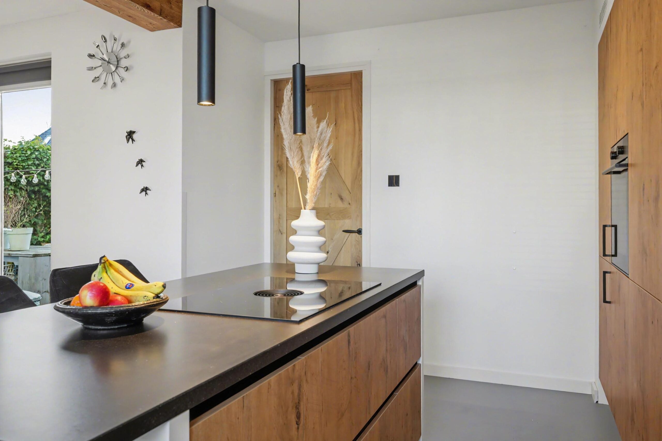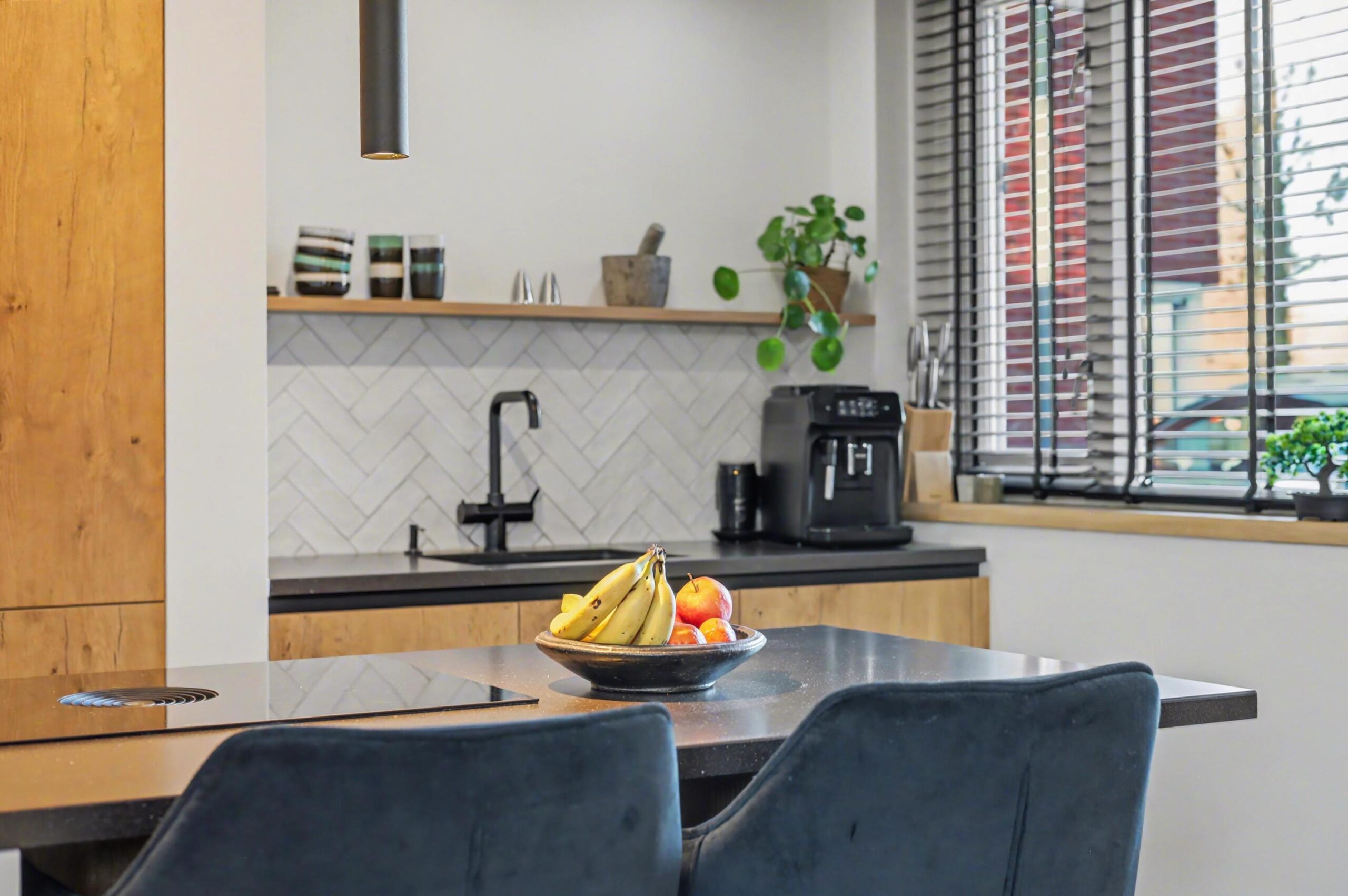Aan de zijzijde van de woning, in de voormalige garage, schittert deze luxe leefkeuken. In 2023 is de keuken geplaatst en uitgevoerd met alle denkbare comfort en moderne gemakken. Het stijlvolle kookeiland vormt het stralende middelpunt, voorzien van een Bora inductiekookplaat waar u met gemak de heerlijkste gerechten bereidt. Aan de andere zijde nodigen de barkrukken uit om er gezellig bij te zitten. De strakke rechte opstelling is uitgerust met een Howat kokendwaterkraan en een vaatwasser, wat zorgt voor extra gebruiksgemak. In de royale kastenwand vindt u de koelkast, vriezer, oven en volop praktische opbergruimte. Aansluitend bevindt zich de bijkeuken. Een keuken die niet alleen luxe uitstraalt, maar ook warmte en gezelligheid ademt.