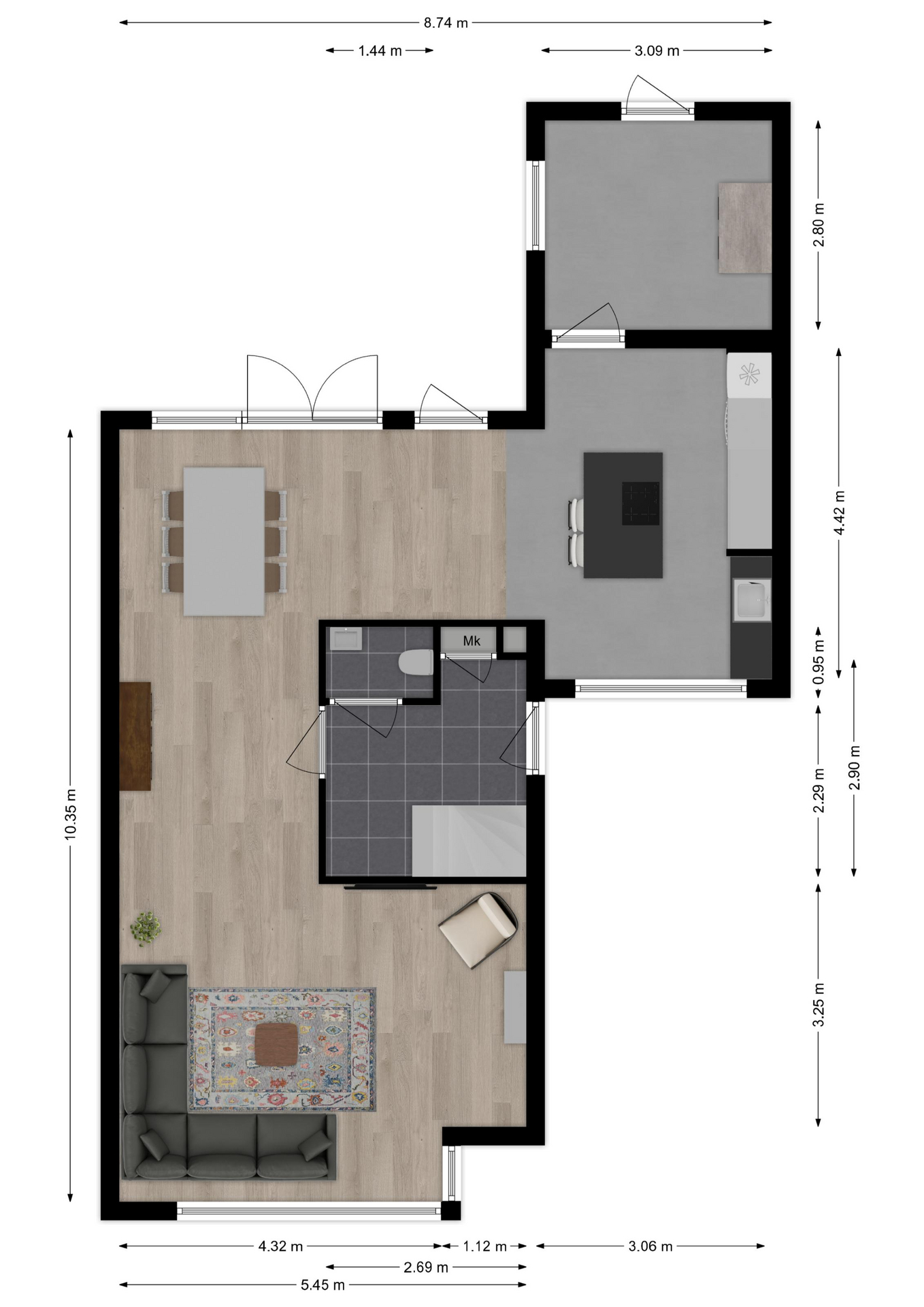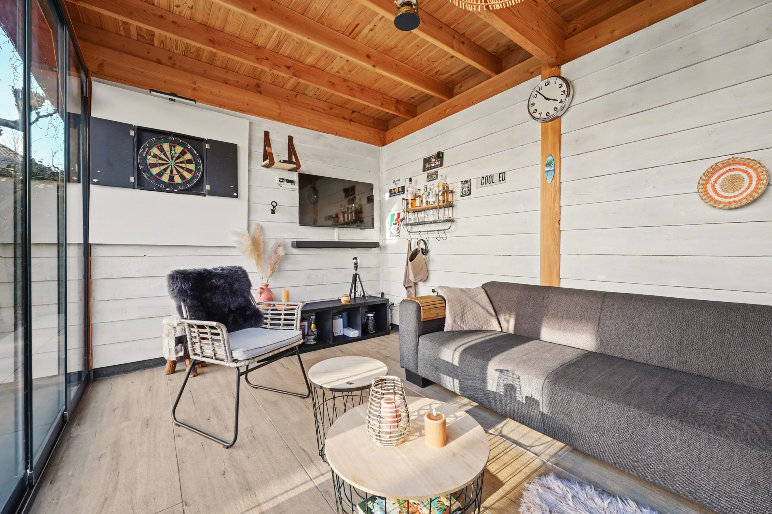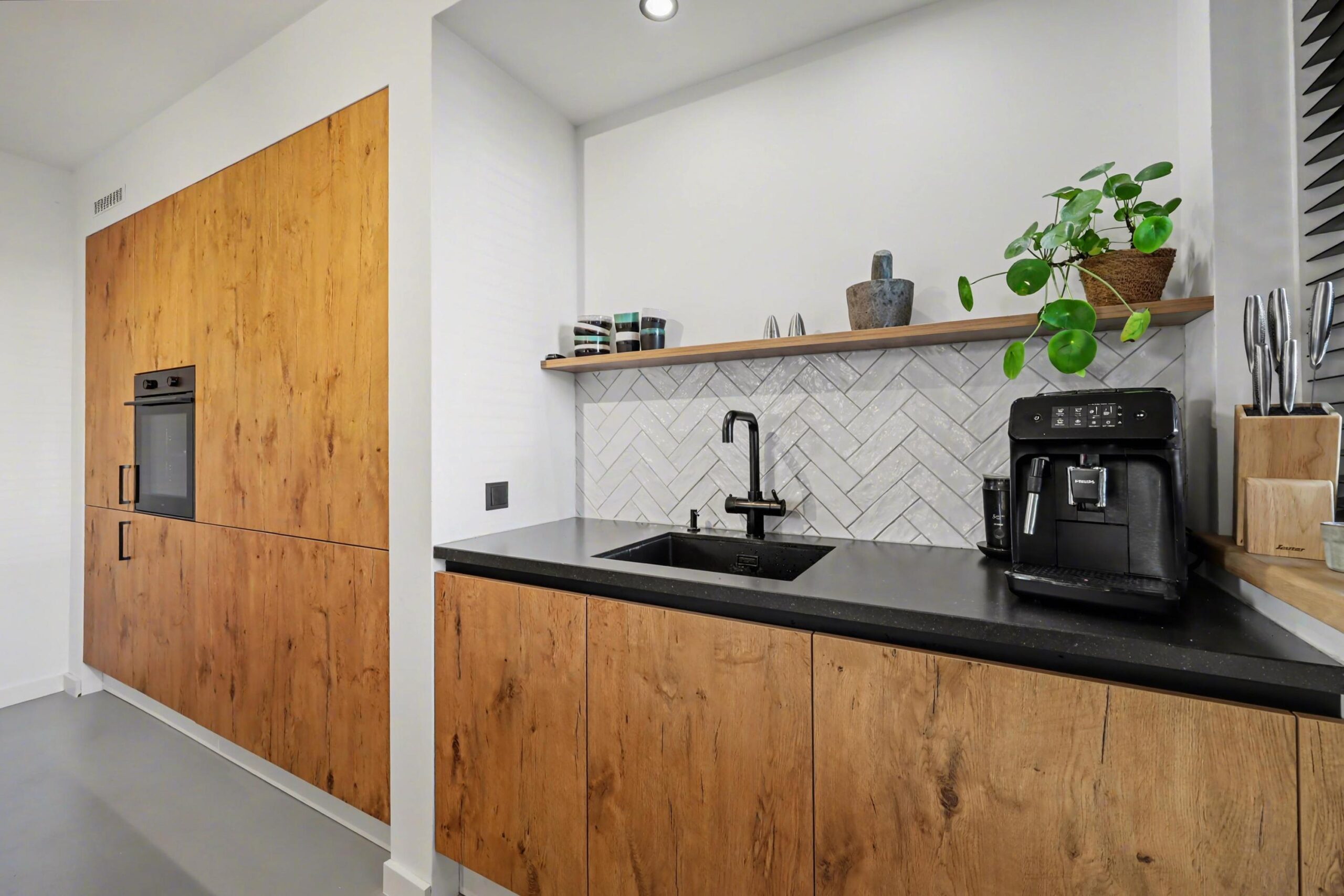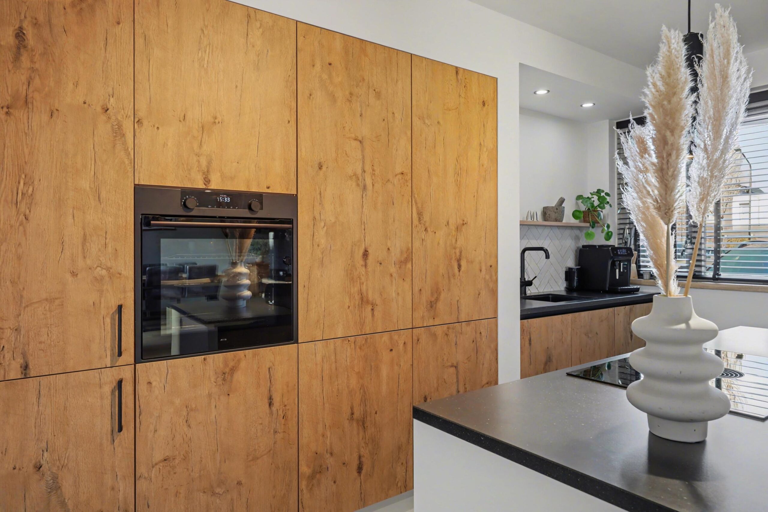 Aan de zijzijde van de woning, in de voormalige garage, schittert deze luxe leefkeuken. In 2023 is de keuken geplaatst en uitgevoerd met alle denkbare comfort en moderne gemakken. Het stijlvolle kookeiland vormt het stralende middelpunt, voorzien van een Bora inductiekookplaat waar u met gemak de heerlijkste gerechten bereidt. Aan de andere zijde nodigen de barkrukken uit om er gezellig bij te zitten. De strakke rechte opstelling is uitgerust met een Howat kokendwaterkraan en een vaatwasser, wat zorgt voor extra gebruiksgemak. In de royale kastenwand vindt u de koelkast, vriezer, oven en volop praktische opbergruimte. Aansluitend bevindt zich de bijkeuken. Een keuken die niet alleen luxe uitstraalt, maar ook warmte en gezelligheid ademt.