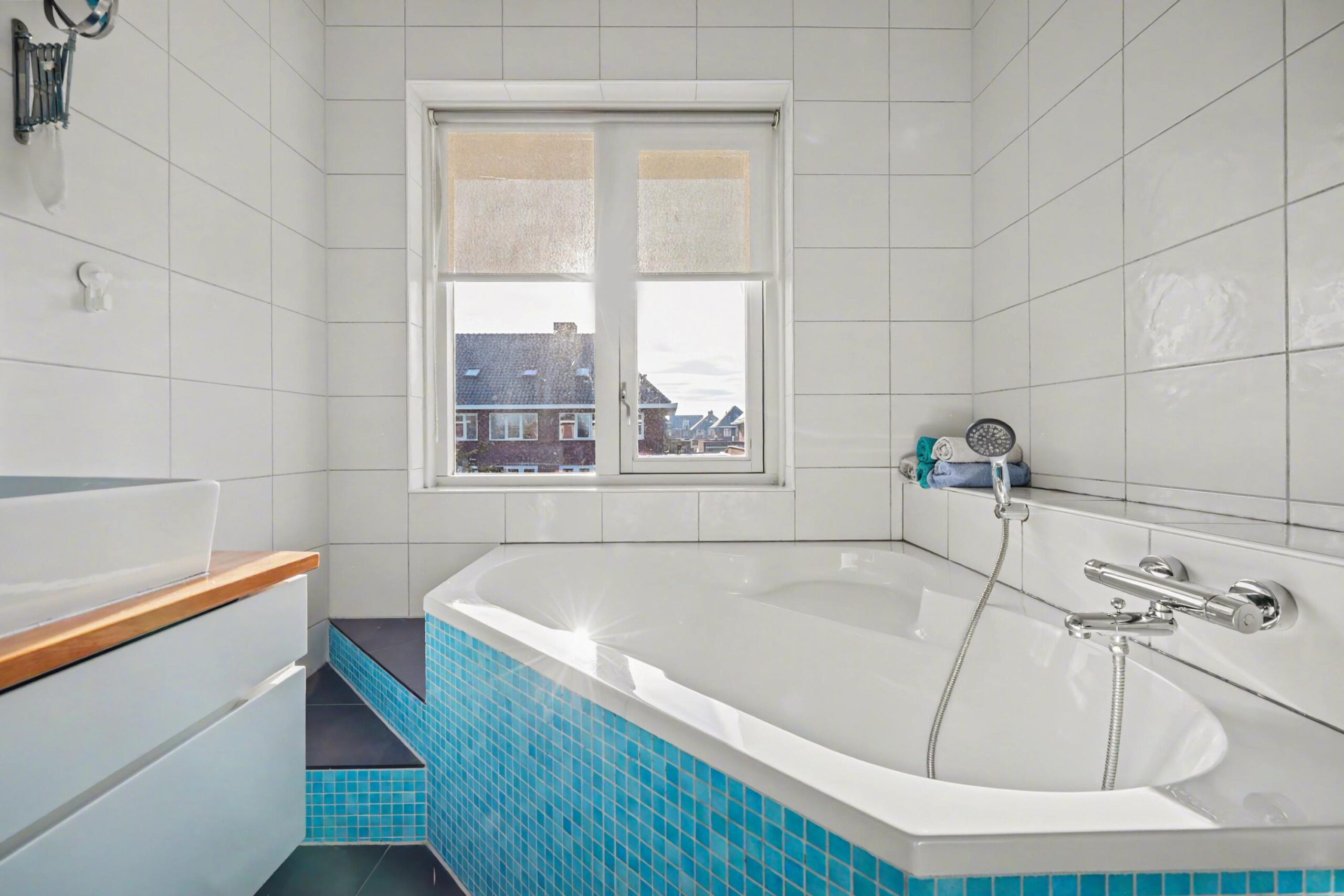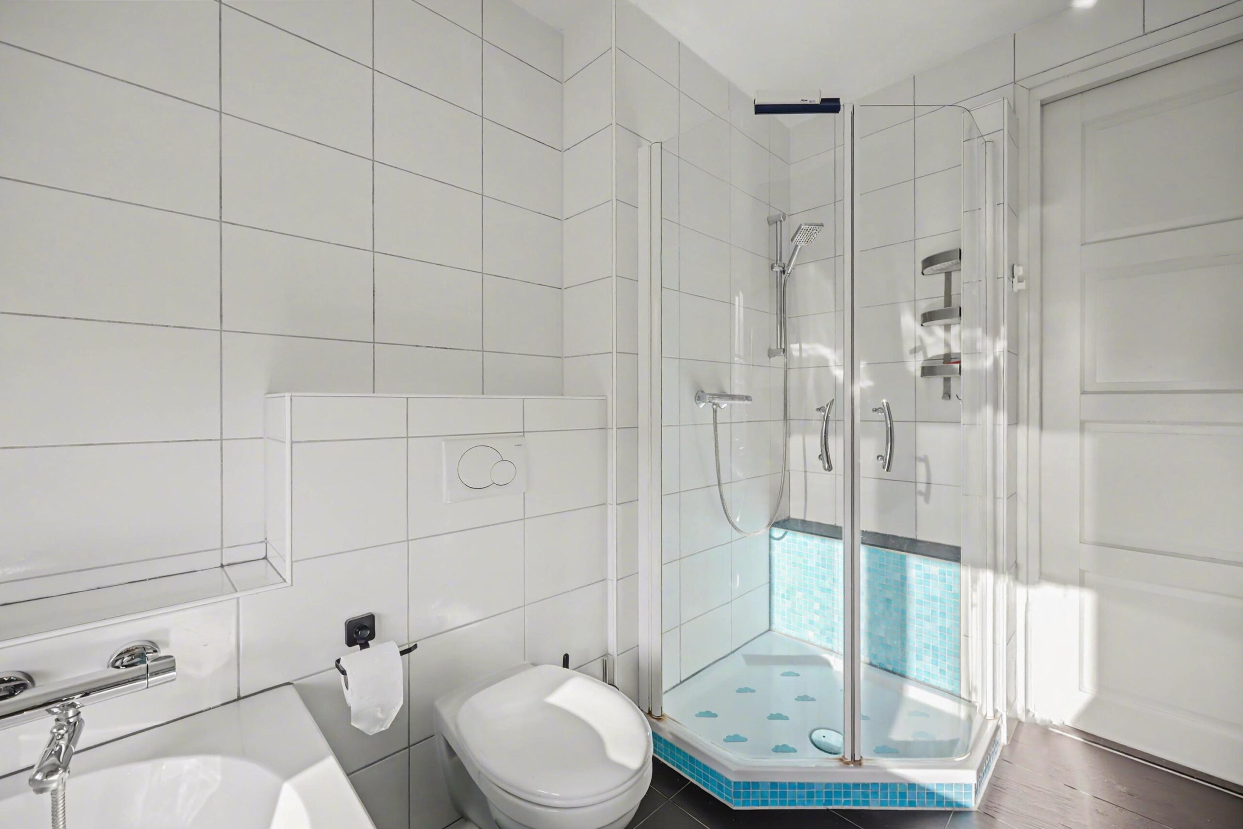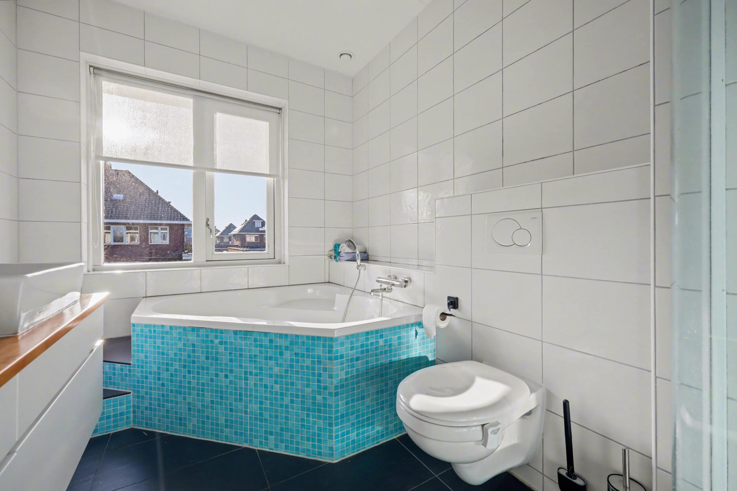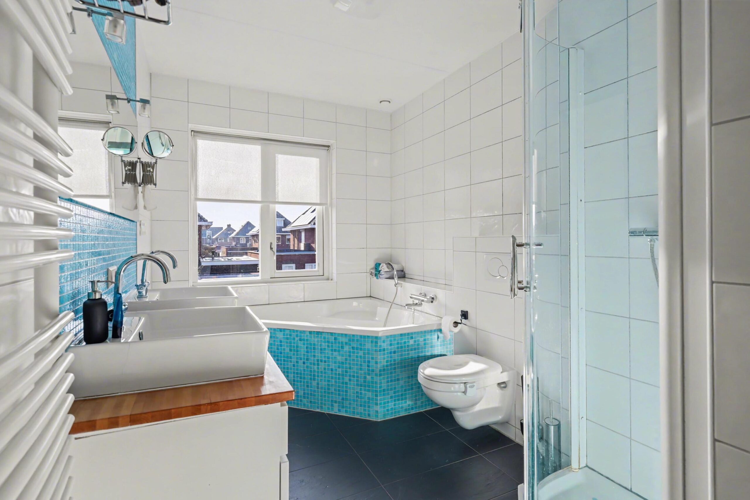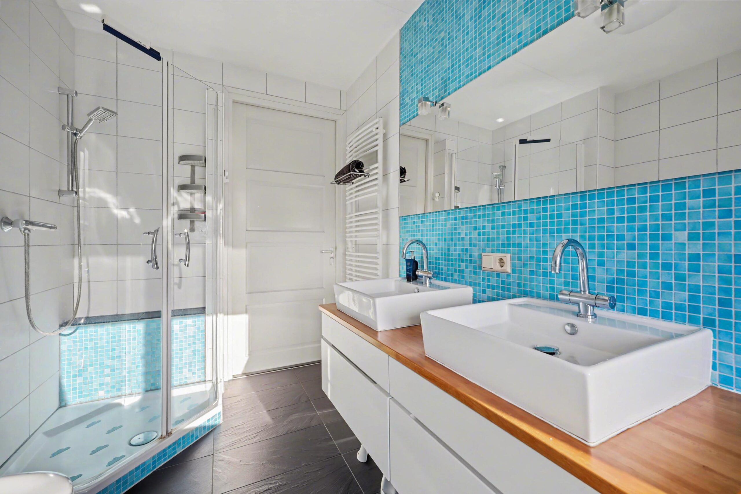 Deze complete badkamer is uitgevoerd in een frisse en tijdloze kleurstelling en biedt u alles wat u nodig heeft. Blikvanger is het royale hoekbad, stijlvol afgewerkt met de turquoise mozaïektegels, een fijne plek om te ontspannen. Liever een douche? Dat kan ook in de douchecabine. Verder is er een toilet, designradiator en een wastafelmeubel met twee waskommen.