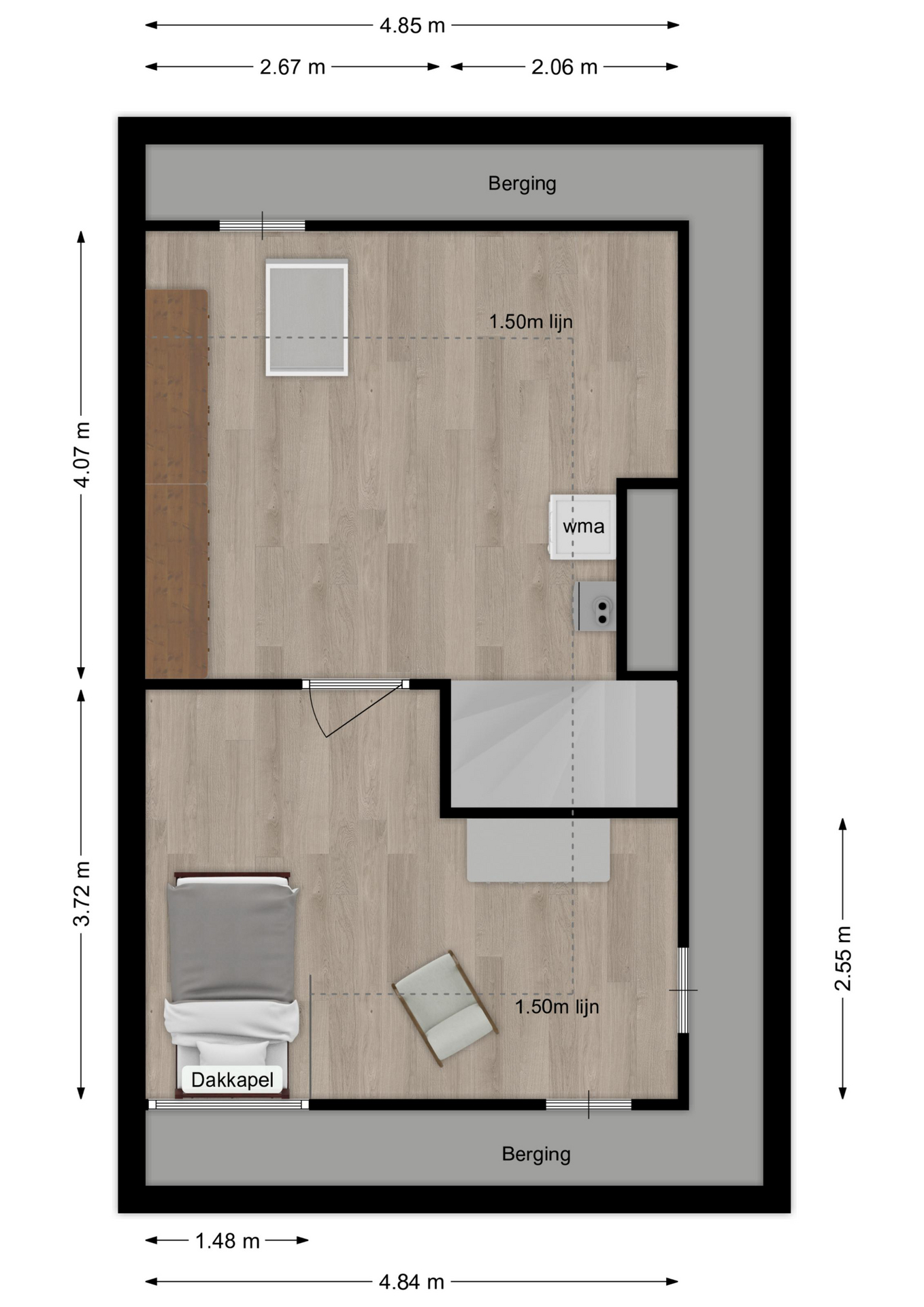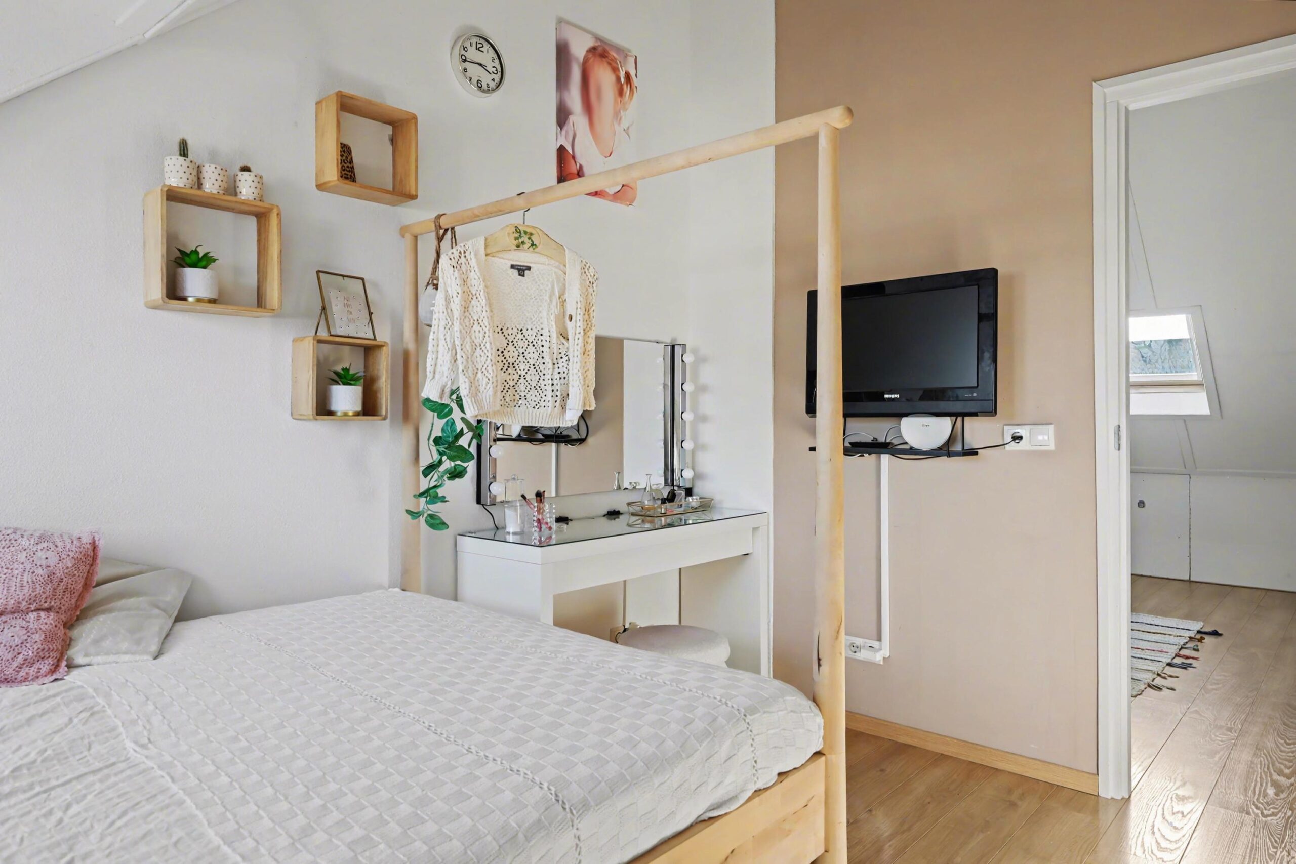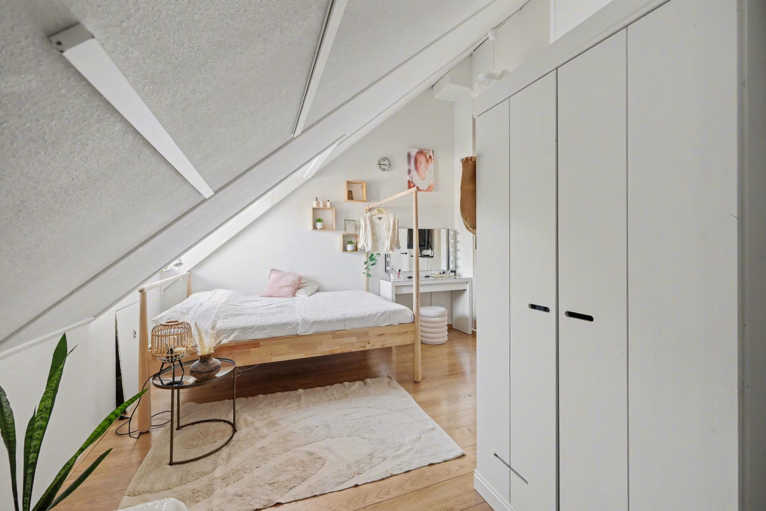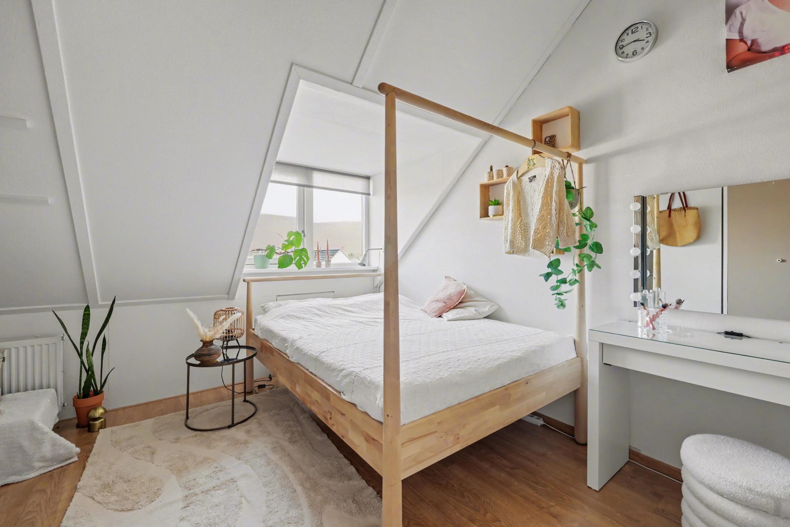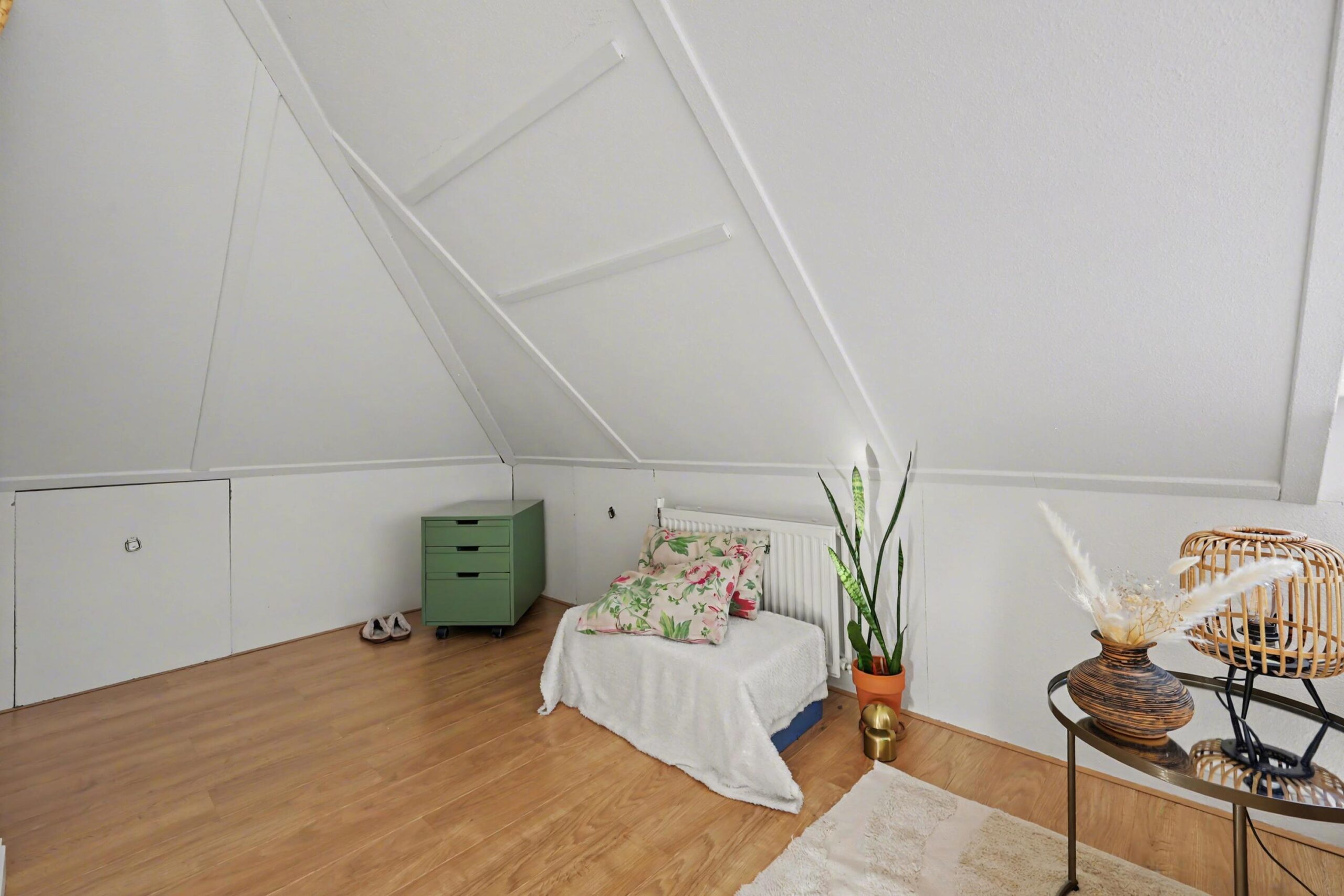Tot slot treft u deze vierde slaapkamer aan de voorzijde en deze is dan ook voorzien van een dakkapel. Ook dit is een ruime kamer met bergruimte onder de schuine kap.