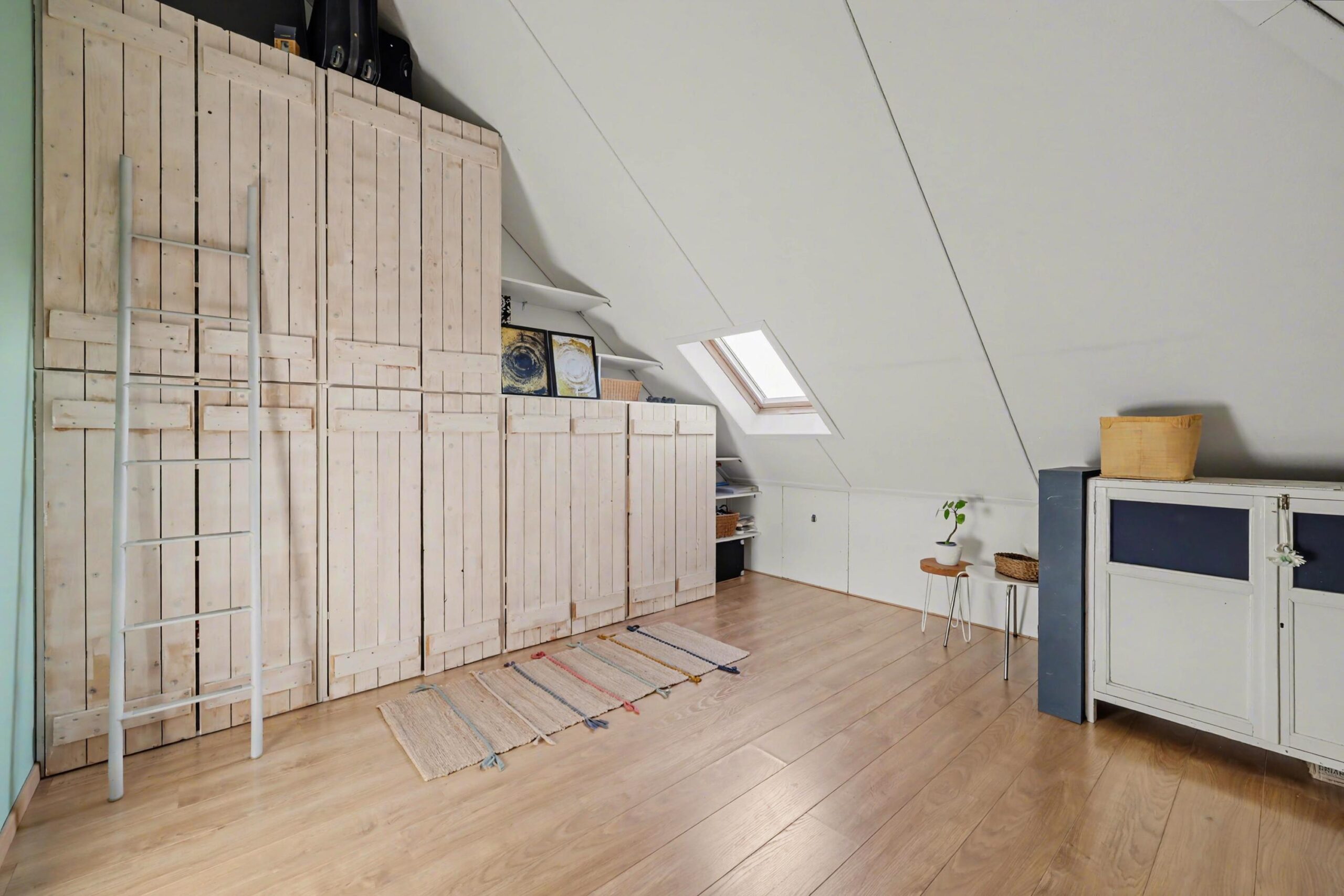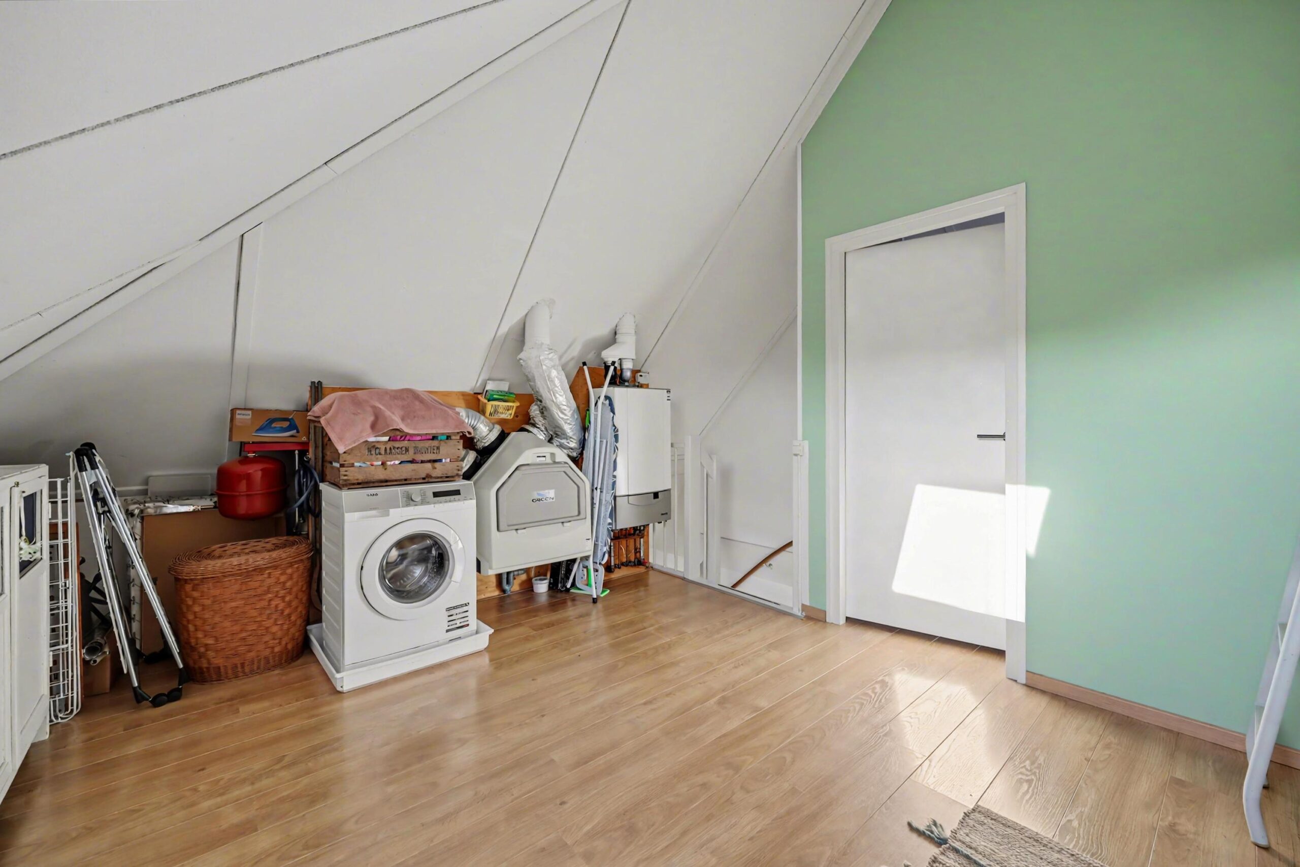 Dit is nog eens een riante overloop! Deze biedt volop mogelijkheden, zeker doordat de schuine kap loopt tot een hoogte van bijna 4 meter. Een extra kamer of werkruimte is dan gemakkelijk gerealiseerd. Half rondom is er bergruimte onder de schuine kap, maar ook de houten kasten blijven achter waar u volop spullen kunt opbergen. Verder heeft u hier ook de C.V.-ketel, de aansluitingen voor uw wasapparatuur en de WtW-installatie.