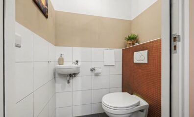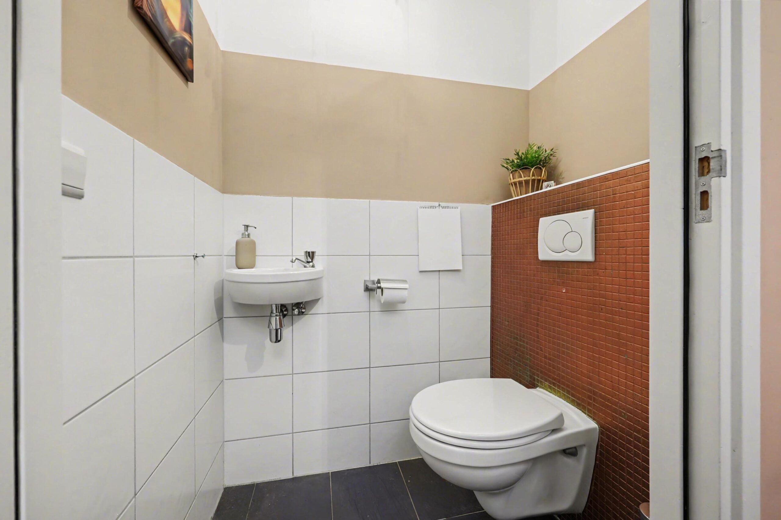 Nette, ruime toiletruimte voorzien van een vrijhangend closet en een handwasfonteintje.