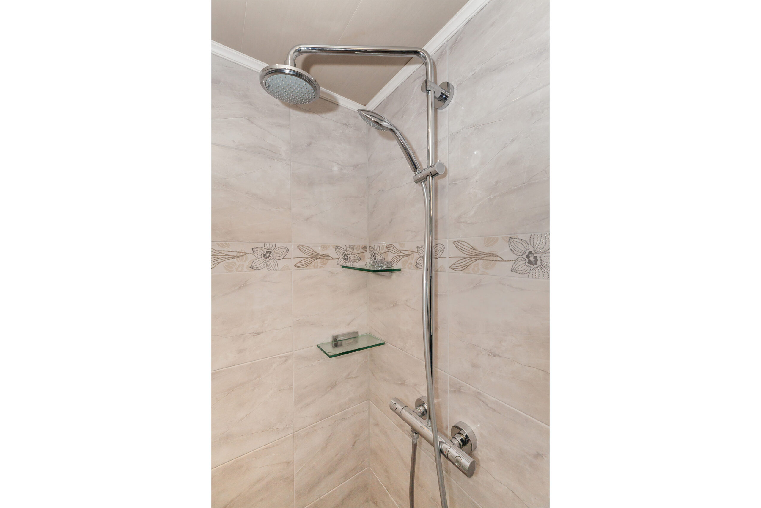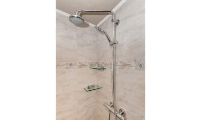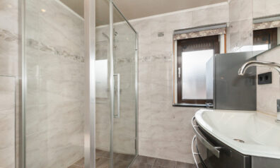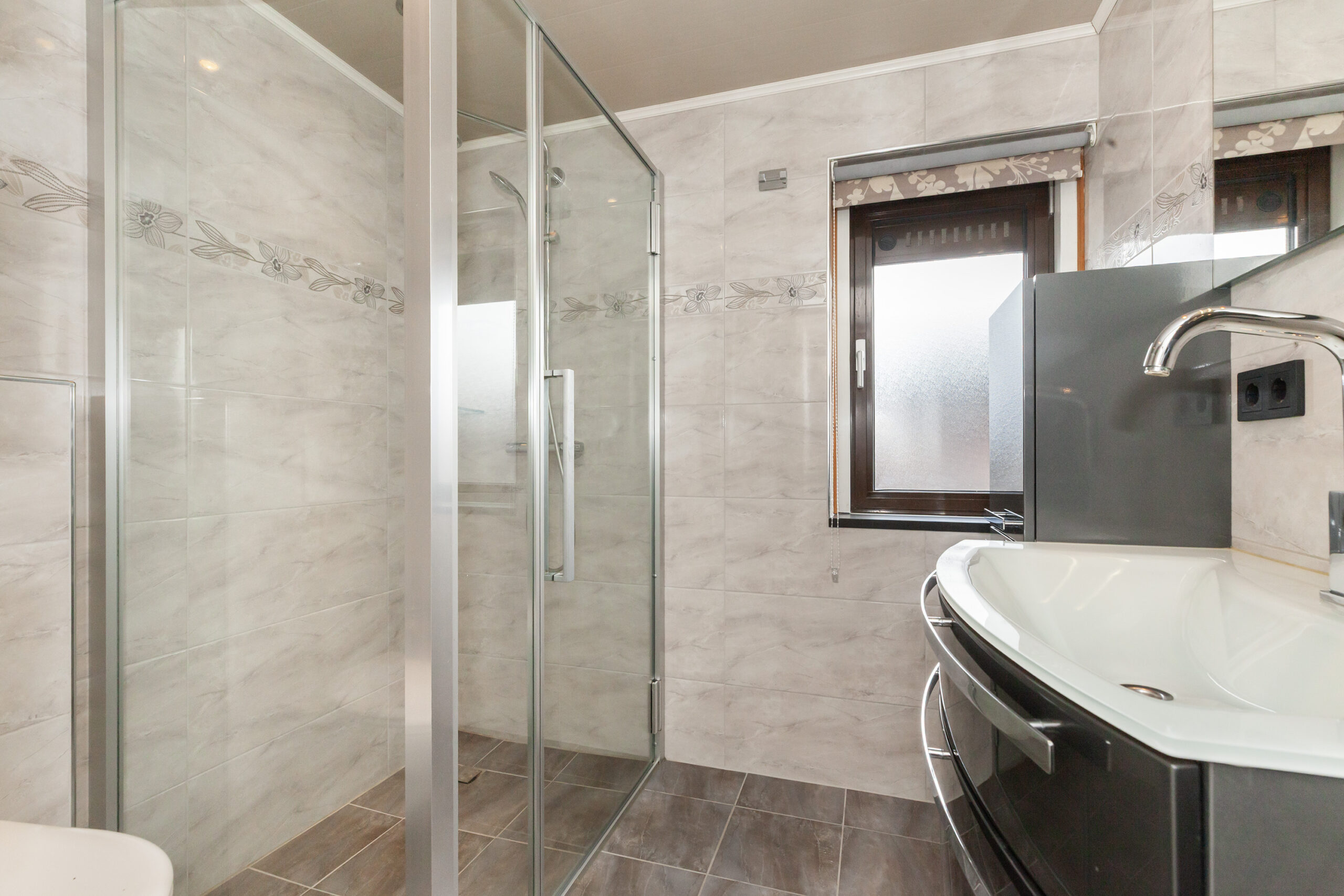 Eveneens aan de voorzijde treft u de badkamer. Er is een grote inloopdouche, wastafelmeubel, toilet en designradiator. Verder ook ventilatie.