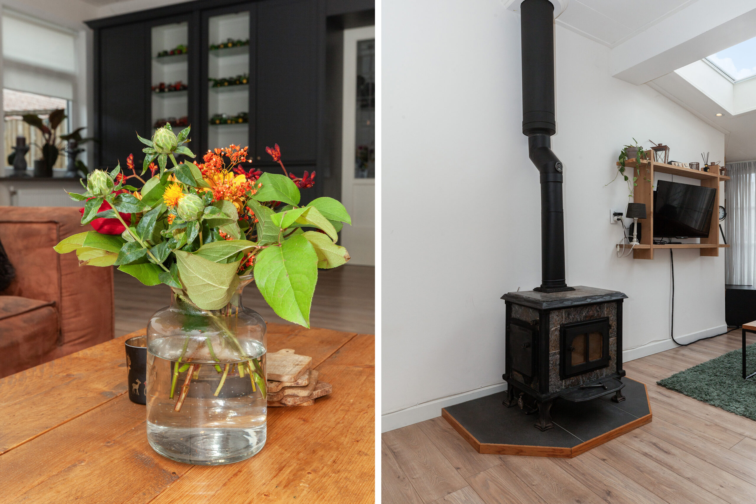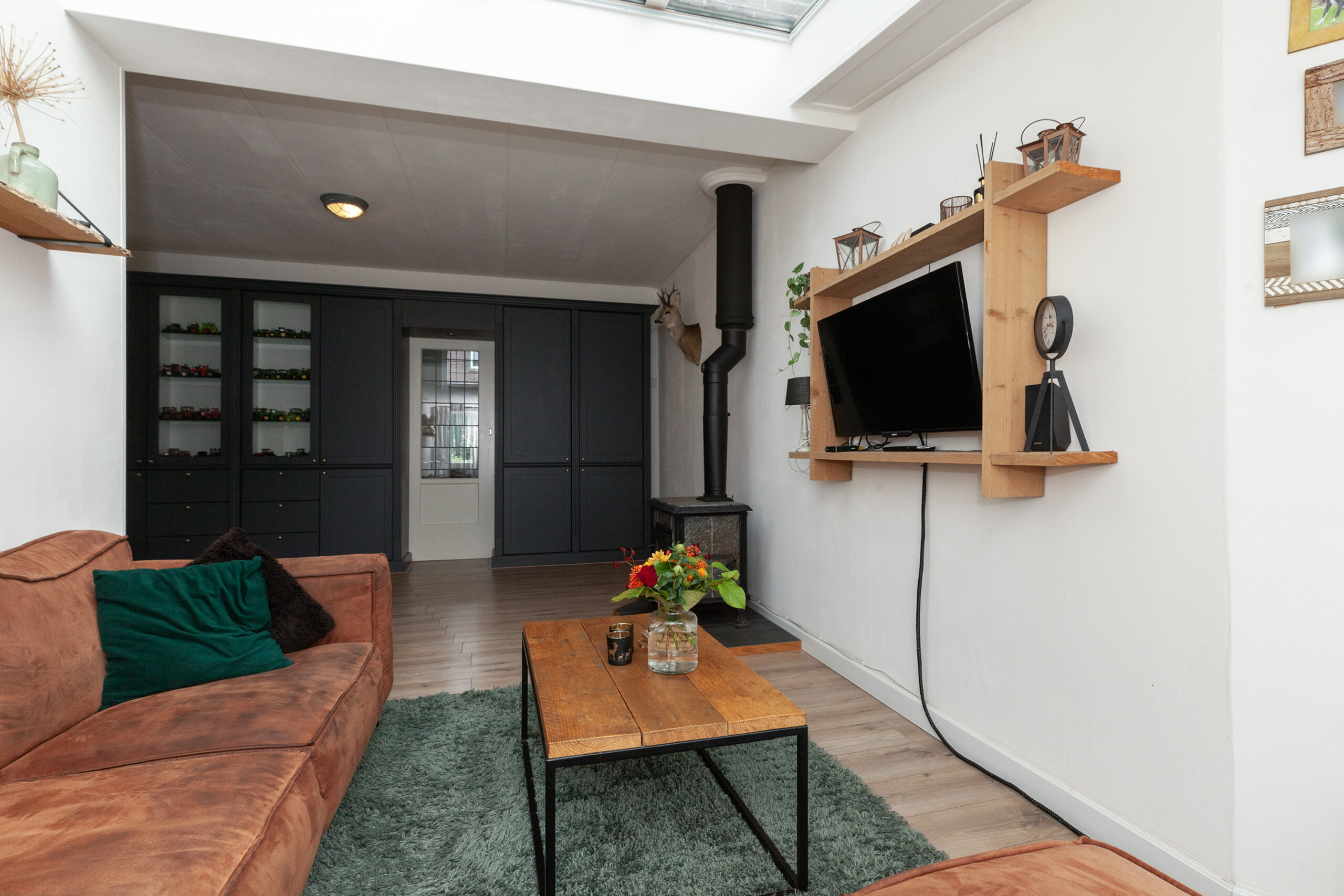 Knus, warm en huiselijk! Dat zijn kenmerken die hier thuis horen. Deze sfeervolle woonkamer is een heerlijke plek om te ontspannen, met veel lichtinval dankzijde de lichtstraat in het plafond. De stijlvolle kastenwand zorgt voor extra opbergruimte en het knapperde vuur in de houtkachel geeft veel warmte in de koude wintermaanden. Via een schuifdeur komt u in de woonkeuken.
