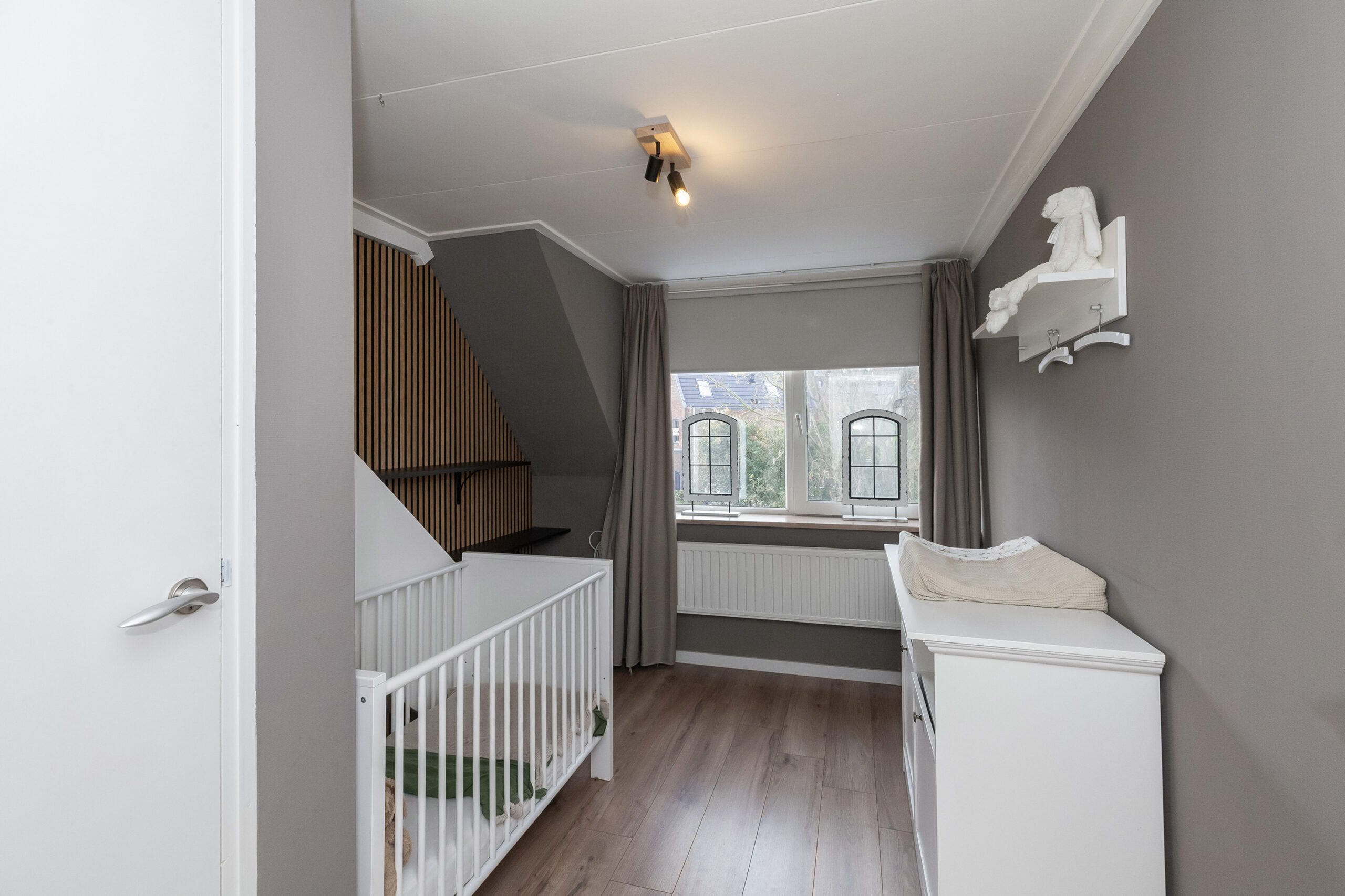 Deze tweede slaapkamer treft u eveneens aan de achterzijde en voorzien van een dakkapel en inbouwkast. Een leuk detail is de akoestische wandpaneel.