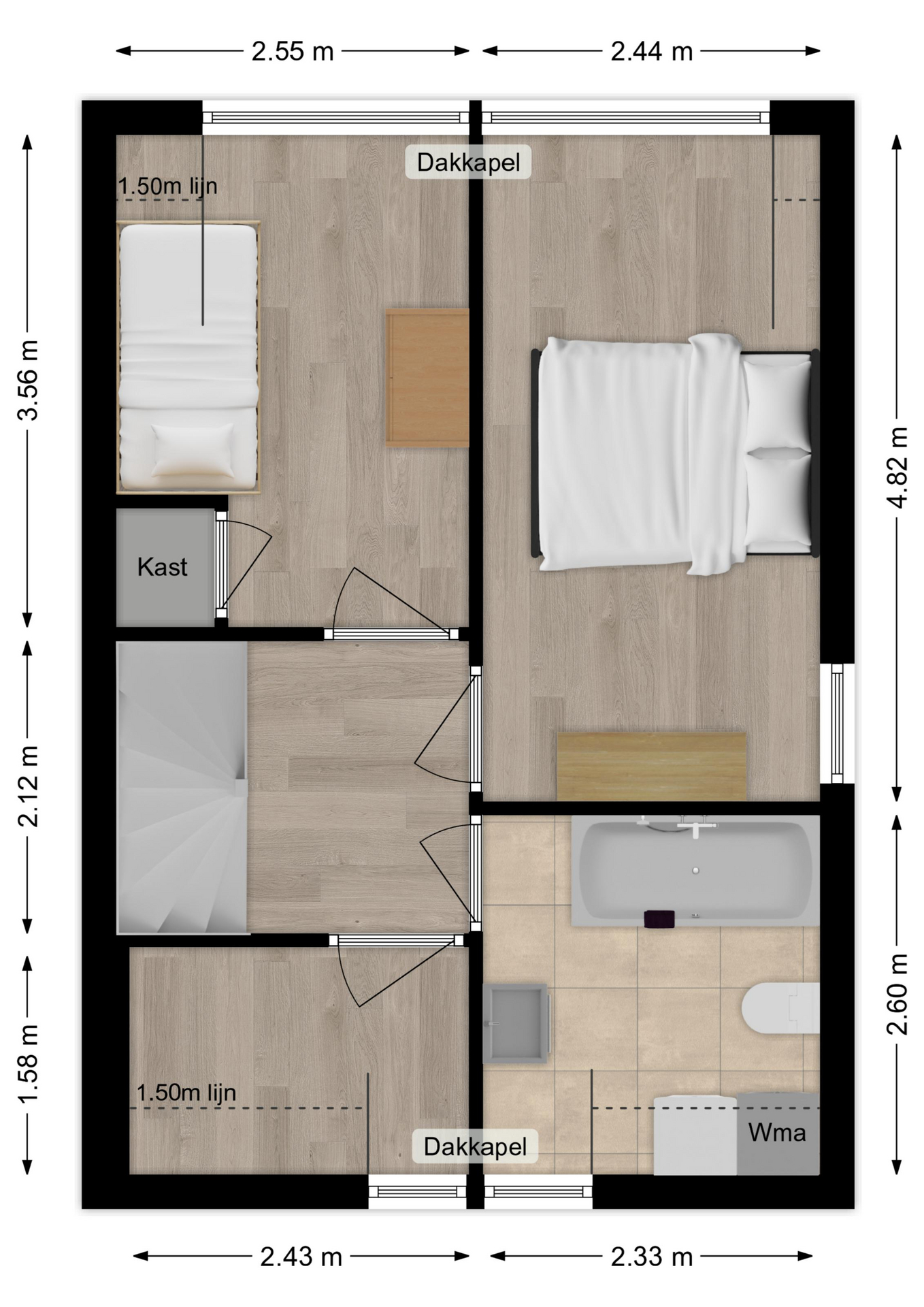 Aan de achterzijde is er een groot dakkapel geplaatst waardoor er extra ruimte is ontstaan. Deze (ouder) slaapkamer treft u aan de achterzijde.