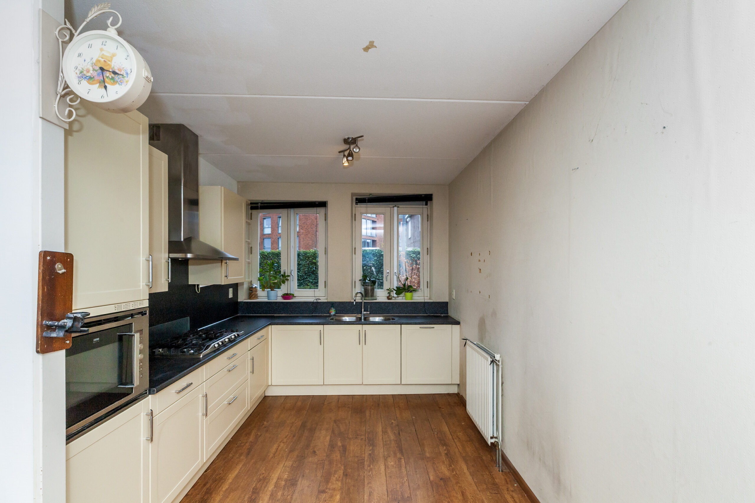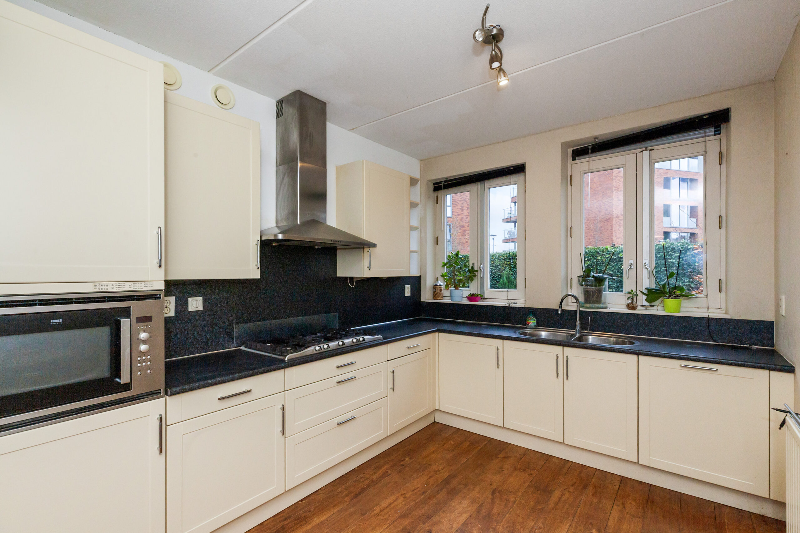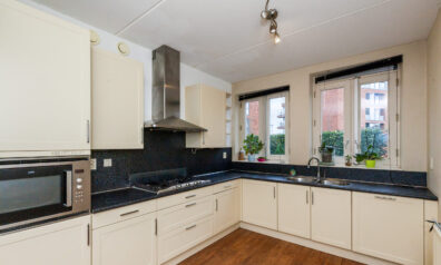 De keuken bevindt zich aan de voorzijde. Door de ramen kijkt u leuk weg over de voorgelegen straat. De hoekopstelling is in lichte kleuren uitgevoerd met een contrasterend aanrechtblad. Aan inbouwapparatuur heeft u de beschikking over een 5-pits gaskookplaat, afzuigkap, vaatwasser en combimagnetron.