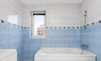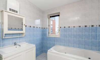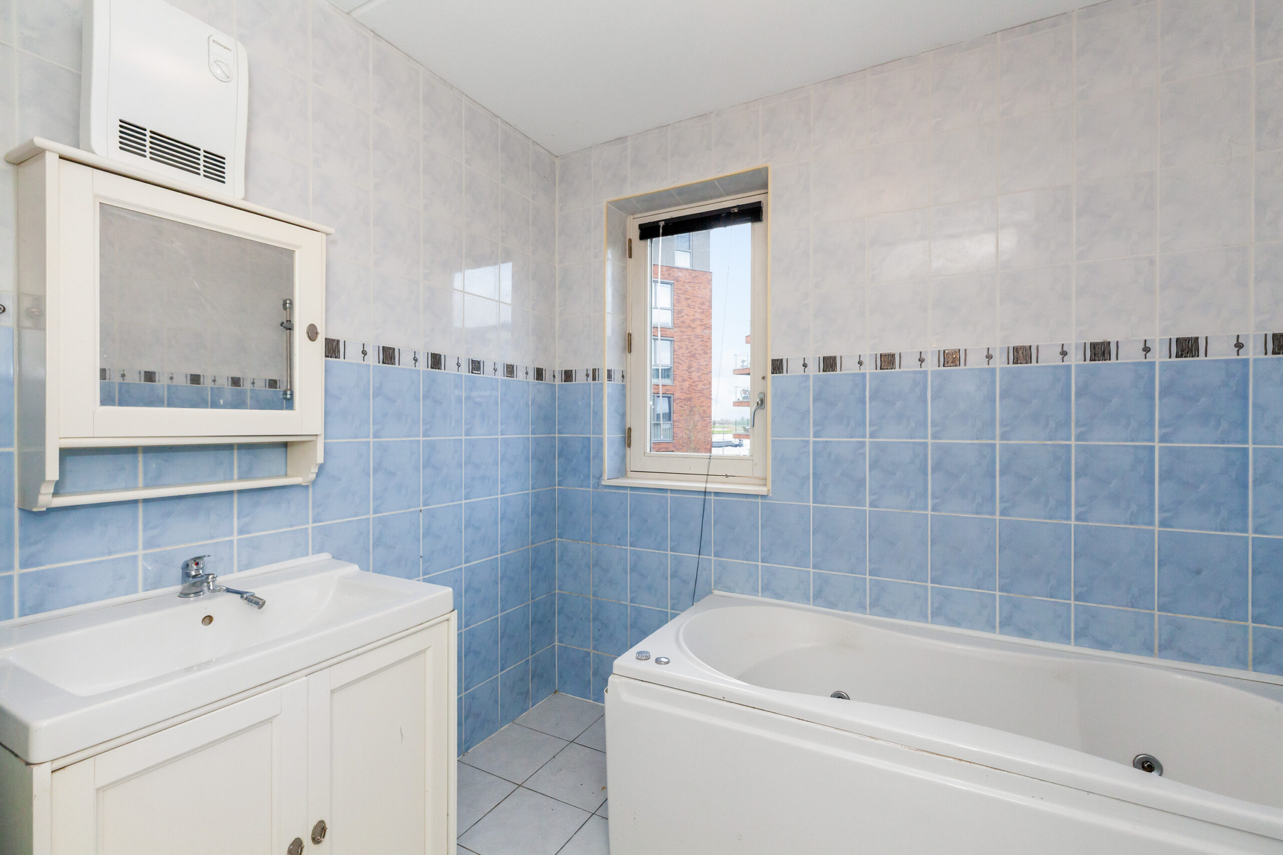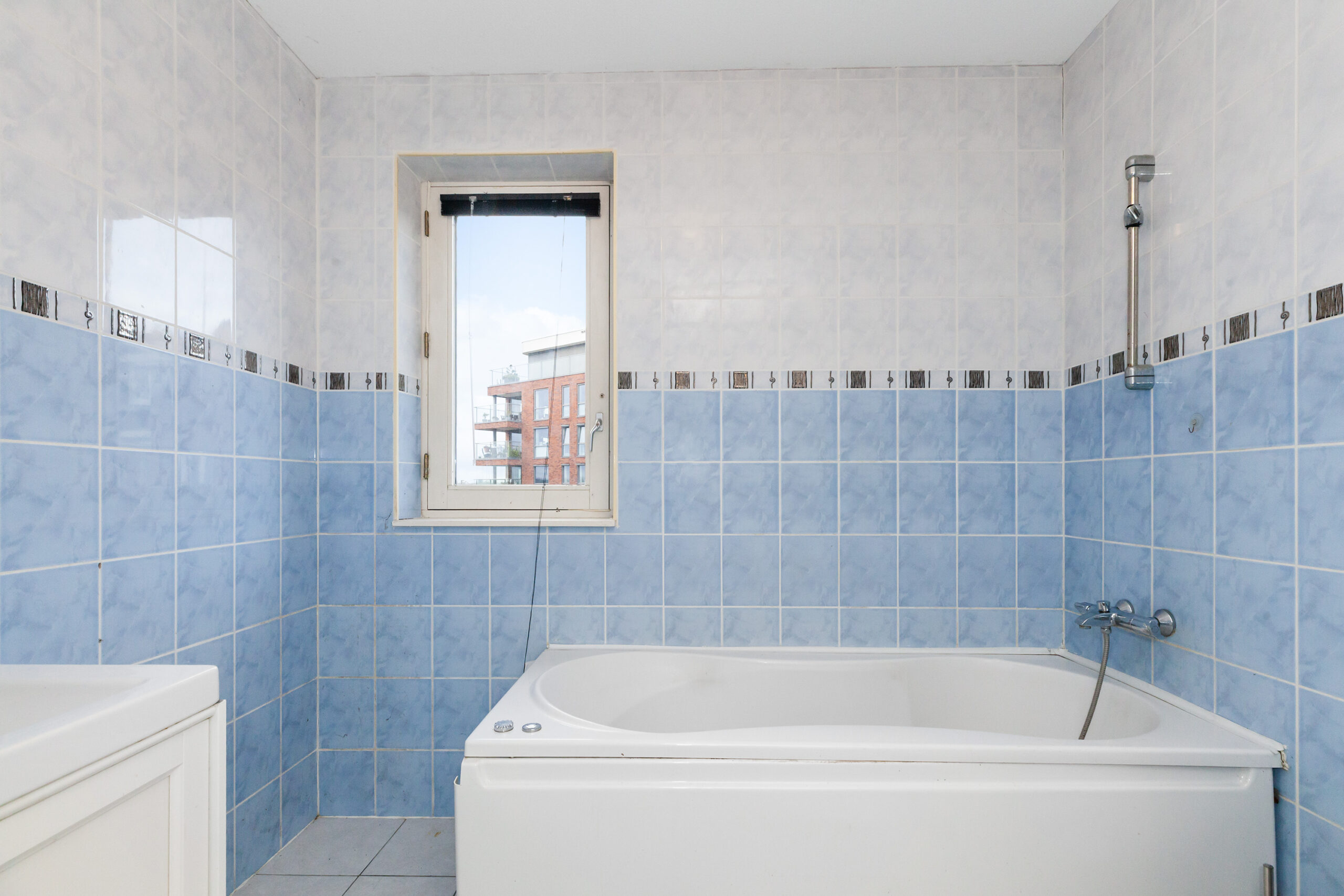 De badkamer is gelijke stijl afgewerkt als de toiletruimte op de begane grond. Er is een ligbad met een douche, wastafelmeubel en een toilet.